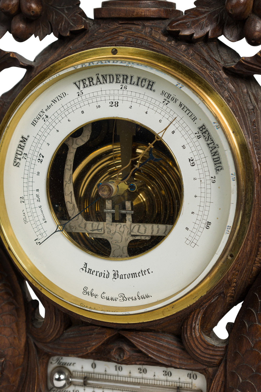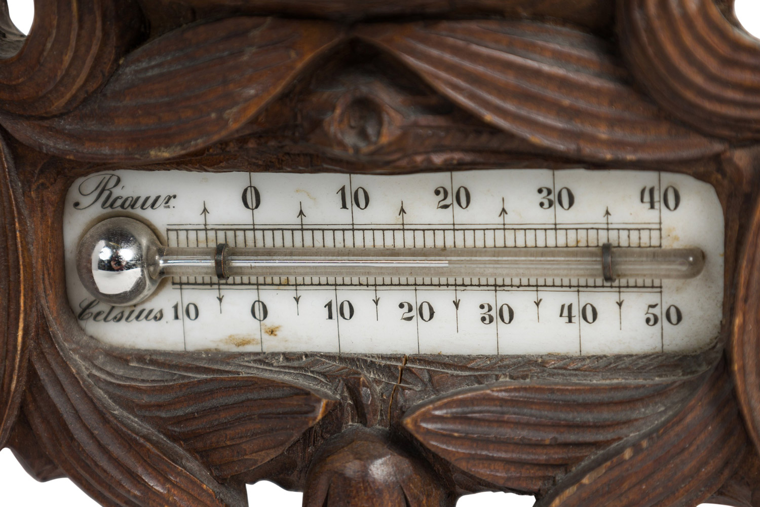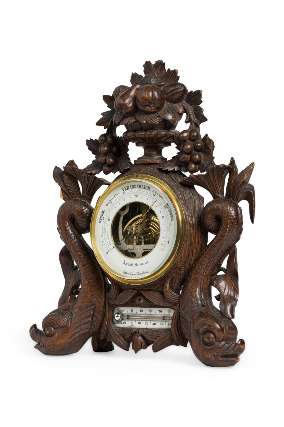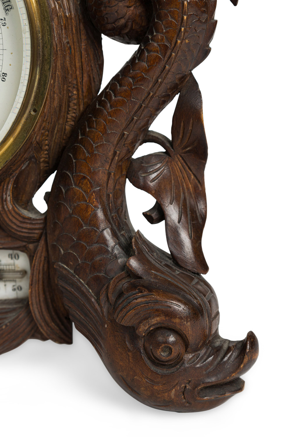 English Regency rustic style (19th Century) carved walnut round barometer over a horizontal thermometer centered by 2 dolphin sides with a floral urn pediment top.