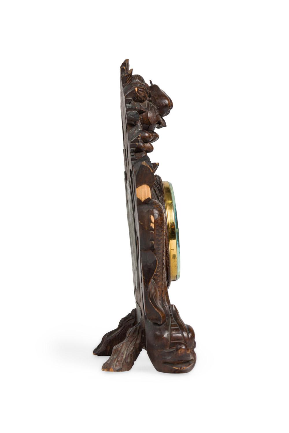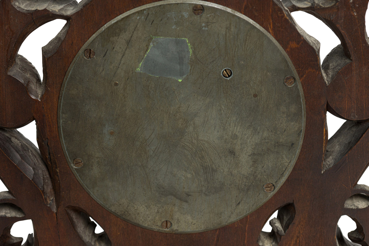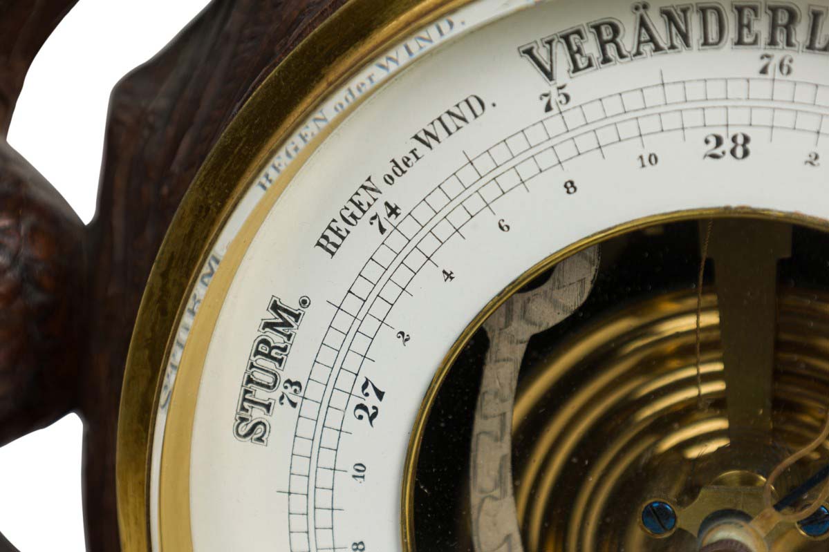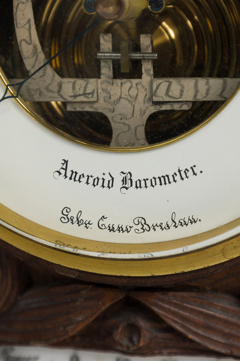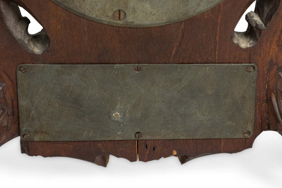 English Regency rustic style (19th Century) carved walnut round barometer over a horizontal thermometer centered by 2 dolphin sides with a floral urn pediment top.