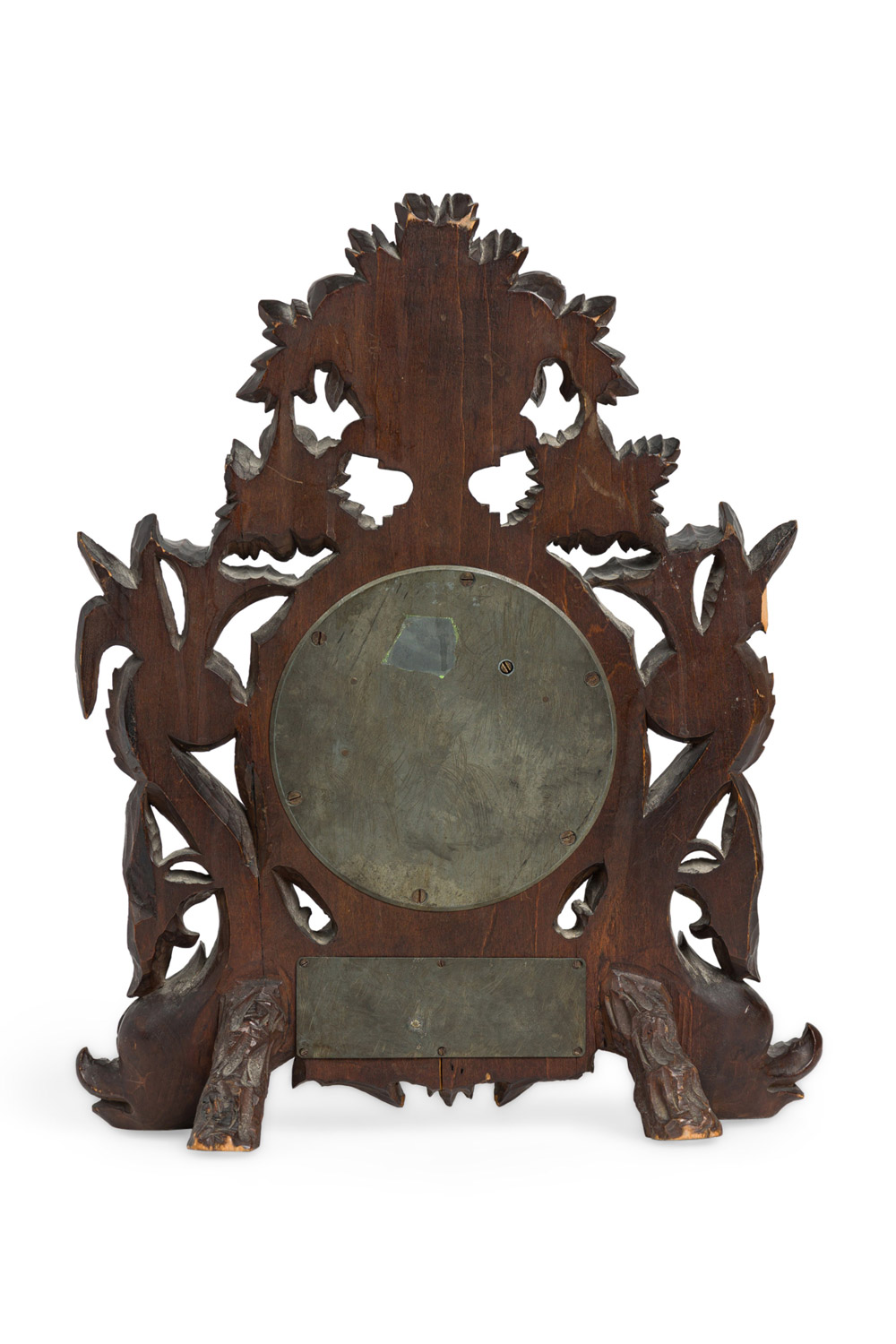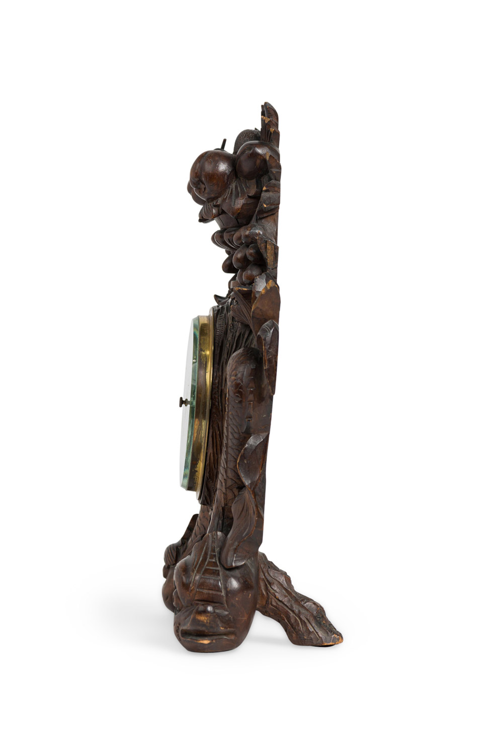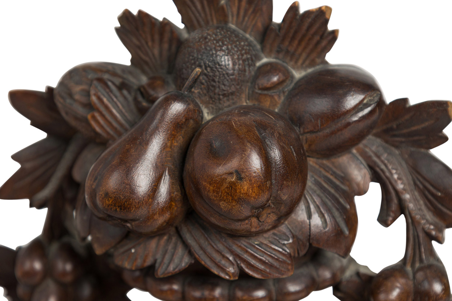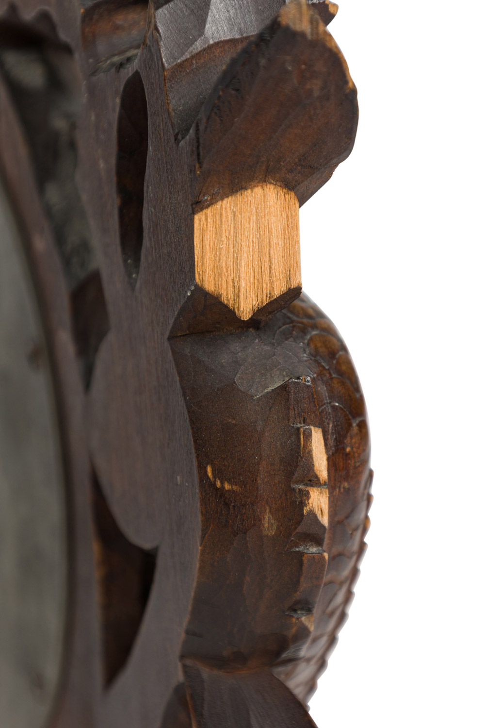 English Regency rustic style (19th Century) carved walnut round barometer over a horizontal thermometer centered by 2 dolphin sides with a floral urn pediment top.