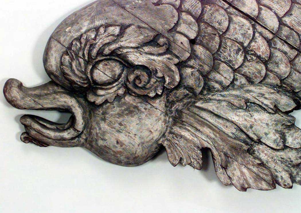 English Regency style (19th Century) stripped wood wall plaque (pub sign) of lifesize carved dolphin giant golden guppy.