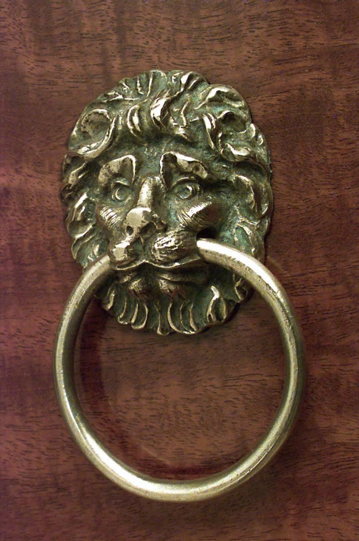 English Regency mahogany chest on chest with bow front design and bronze lion head handles with ebonized inlay on pediment top.