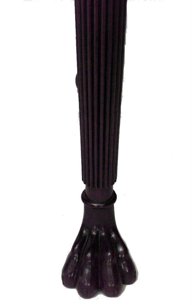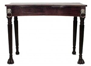English Regency (Likely Irish, Early 19th Century) banded inlaid mahogany console table with concave front above lion headed reeded turned legs with paw feet.