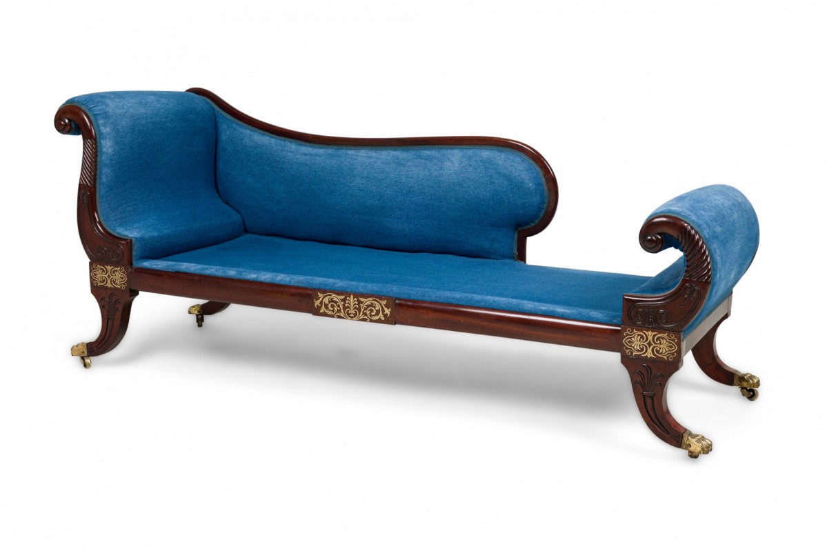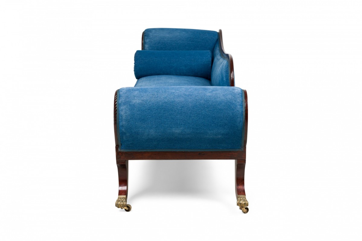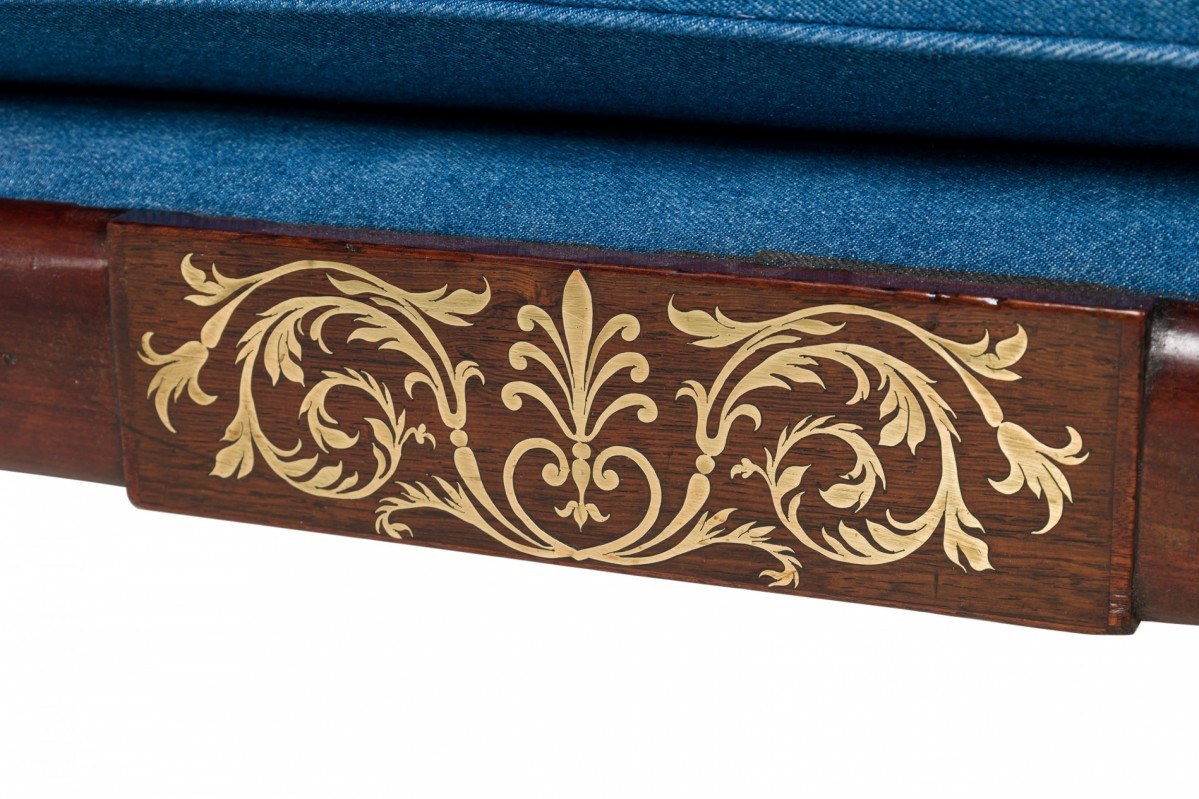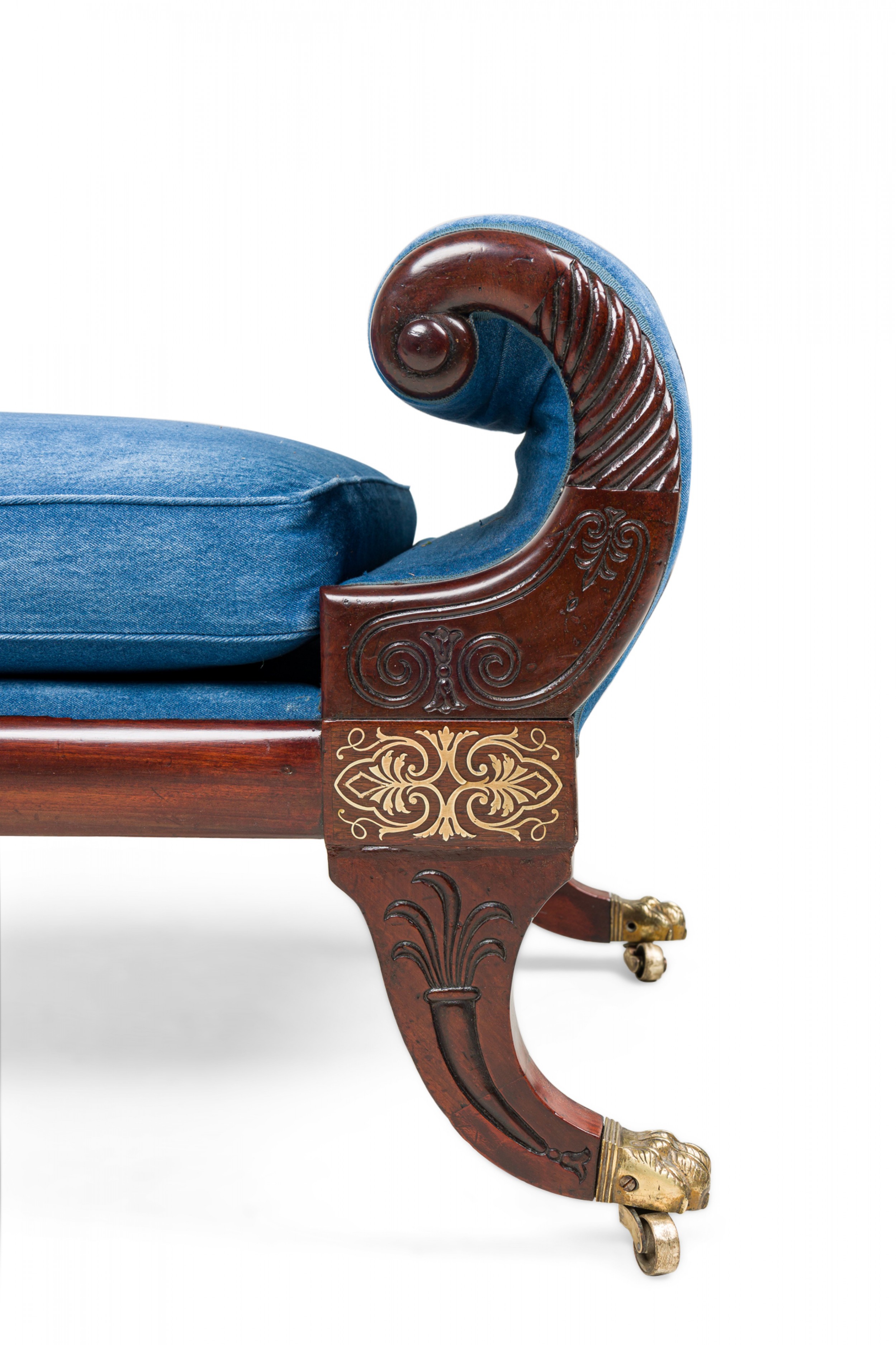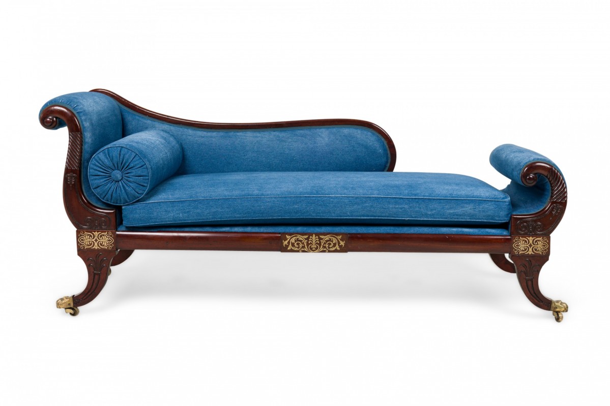 English Regency mahogany and brass inlaid roll arm récamier with a dark blue denim upholstery.