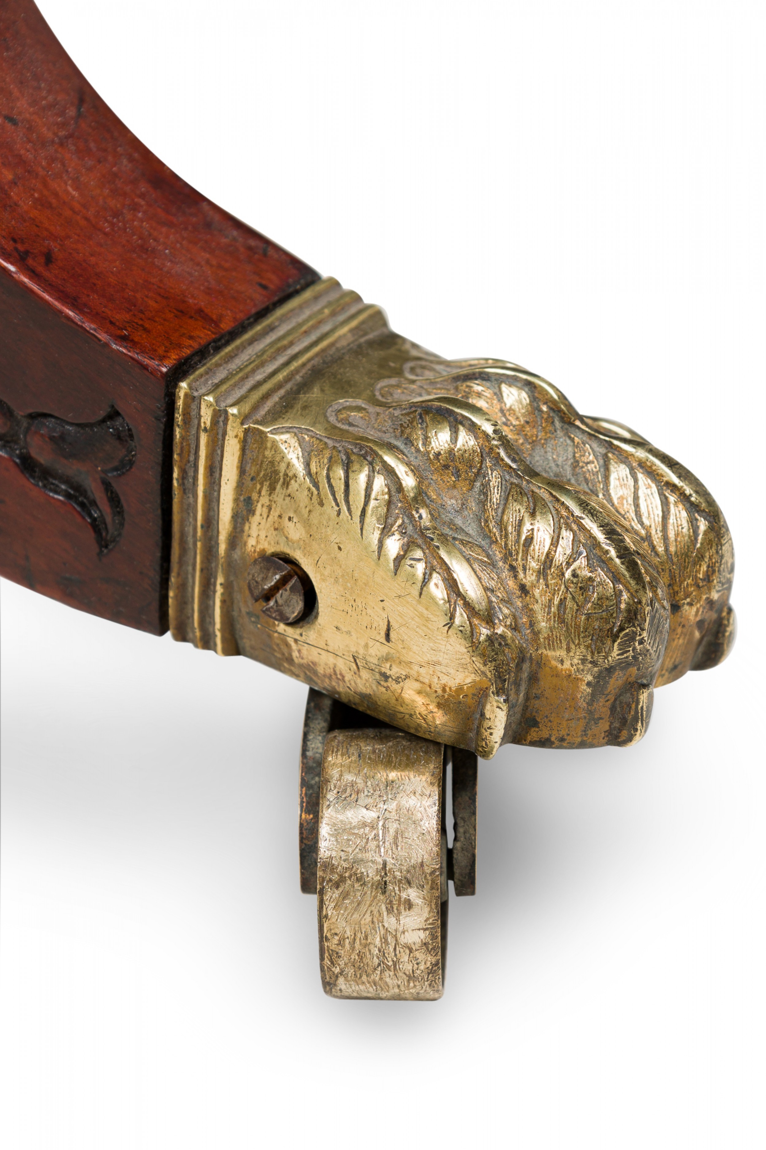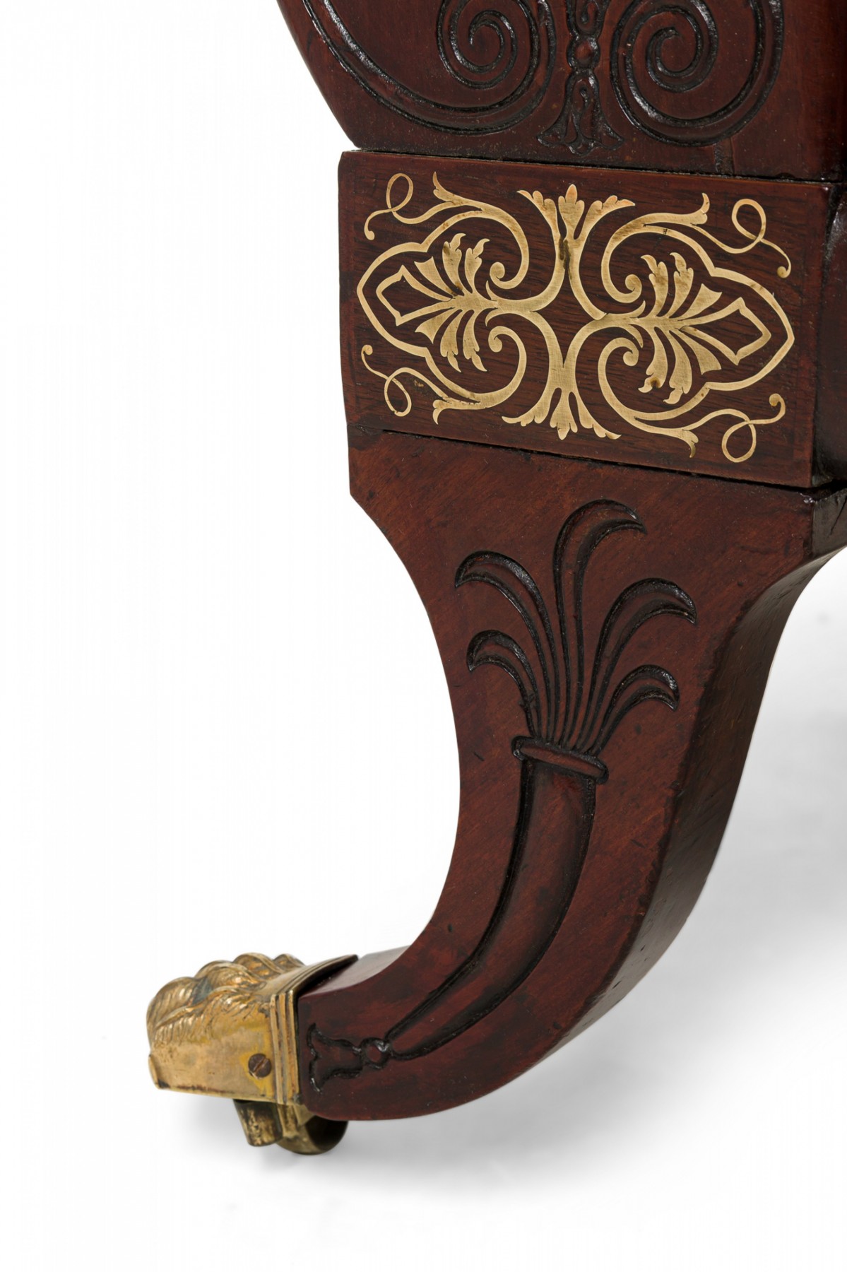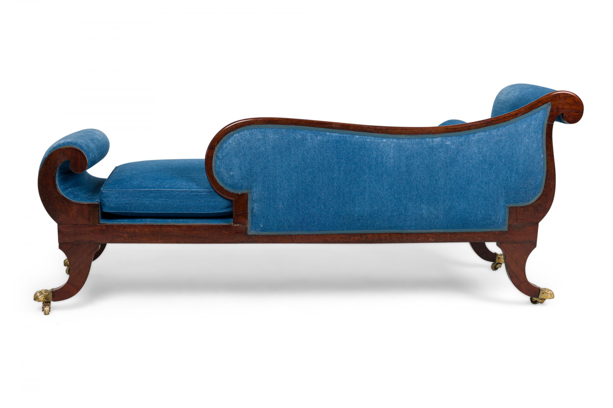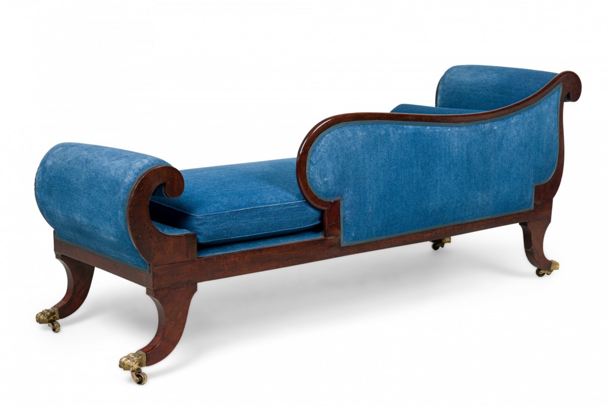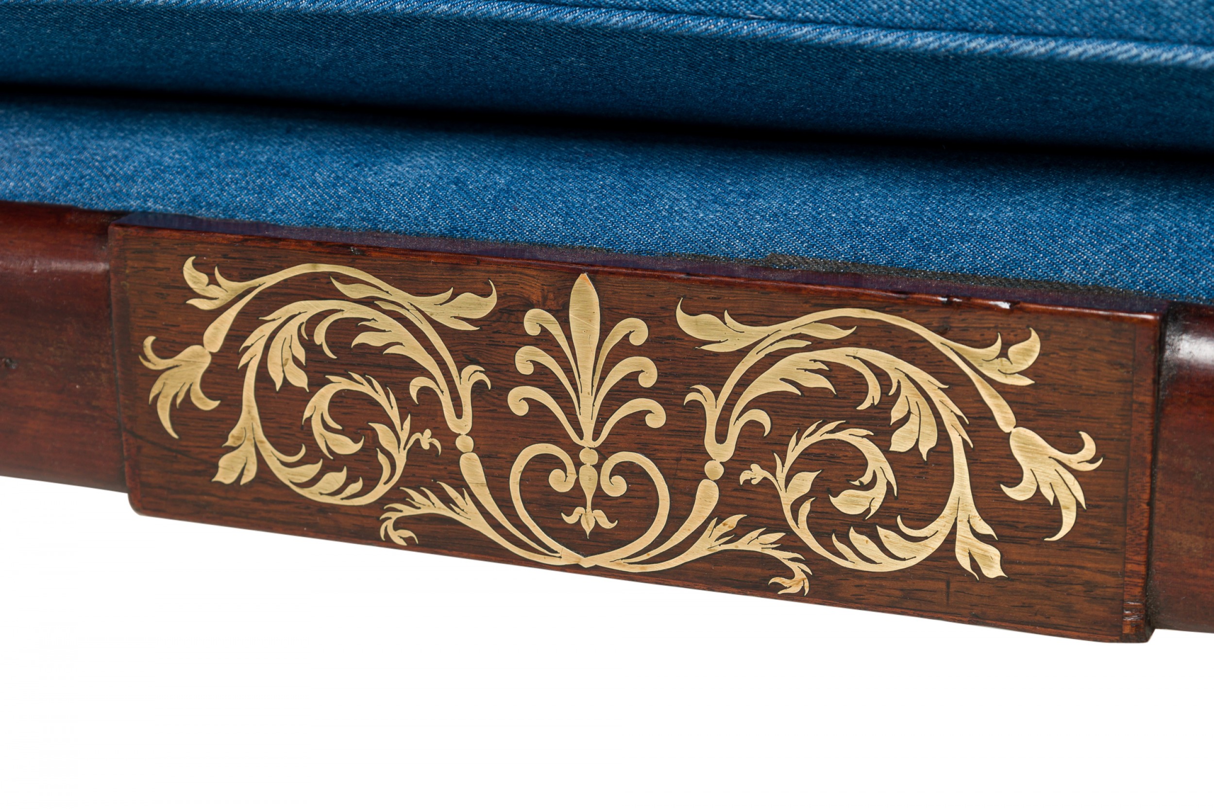 English Regency mahogany and brass inlaid roll arm récamier with a dark blue denim upholstery.