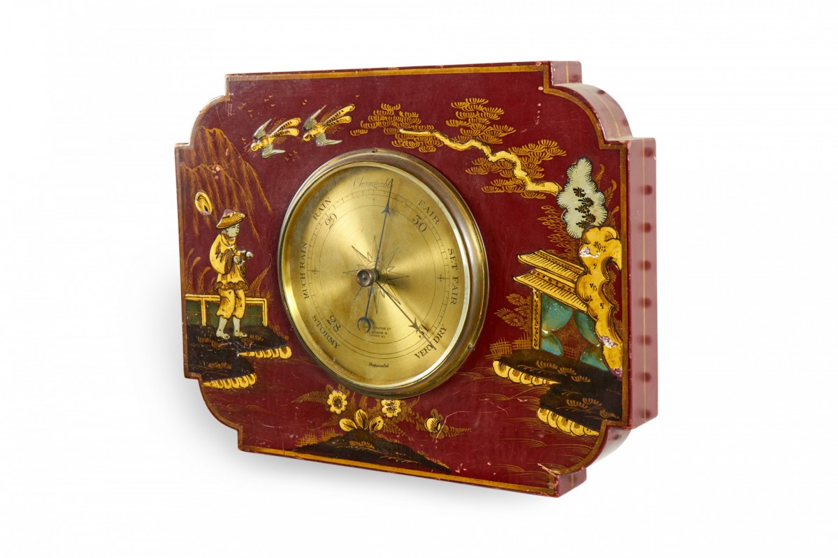 English Regency-style (19/20th Century) red lacquer small chinoiserie wall barometer.