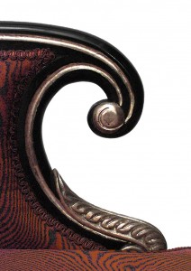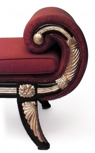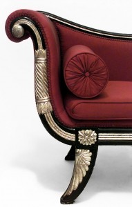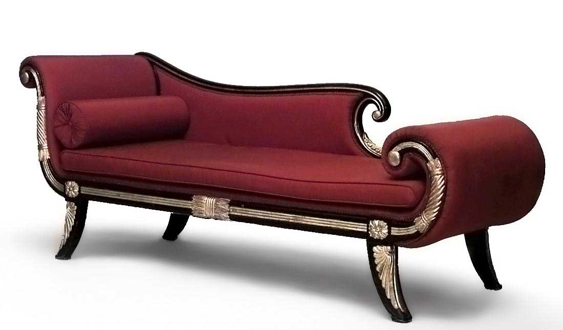 English Regency-style (20th Century) ebonized and gilt recamier with red upholstery with bolster