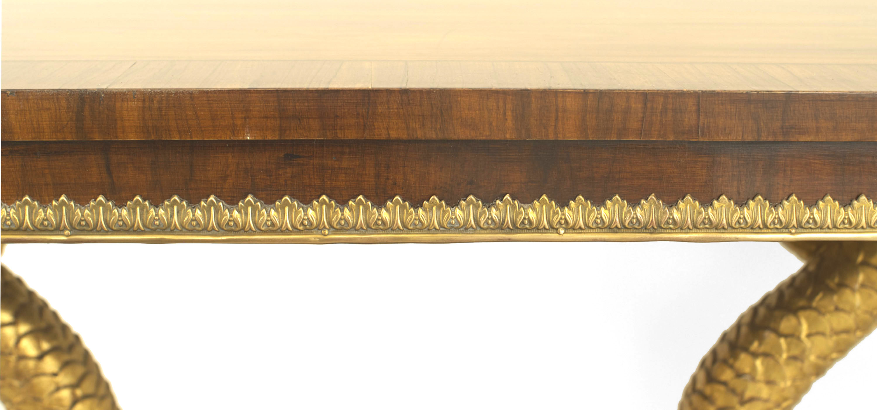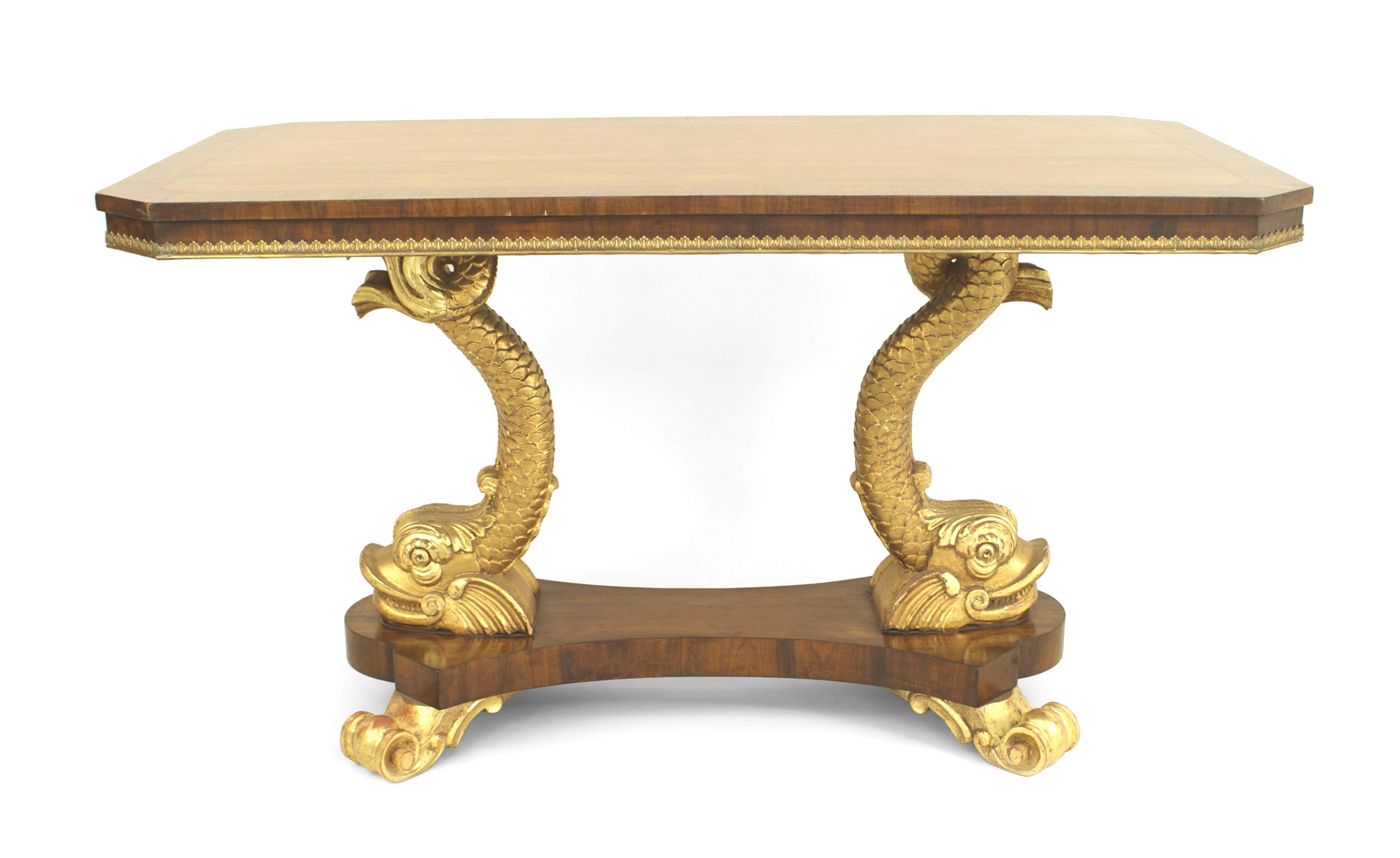 English Regency style (19th Century) rosewood rectangular center table with brass trim on top and 2 carved gilt dolphins supported on platform base with gilt scroll feet.