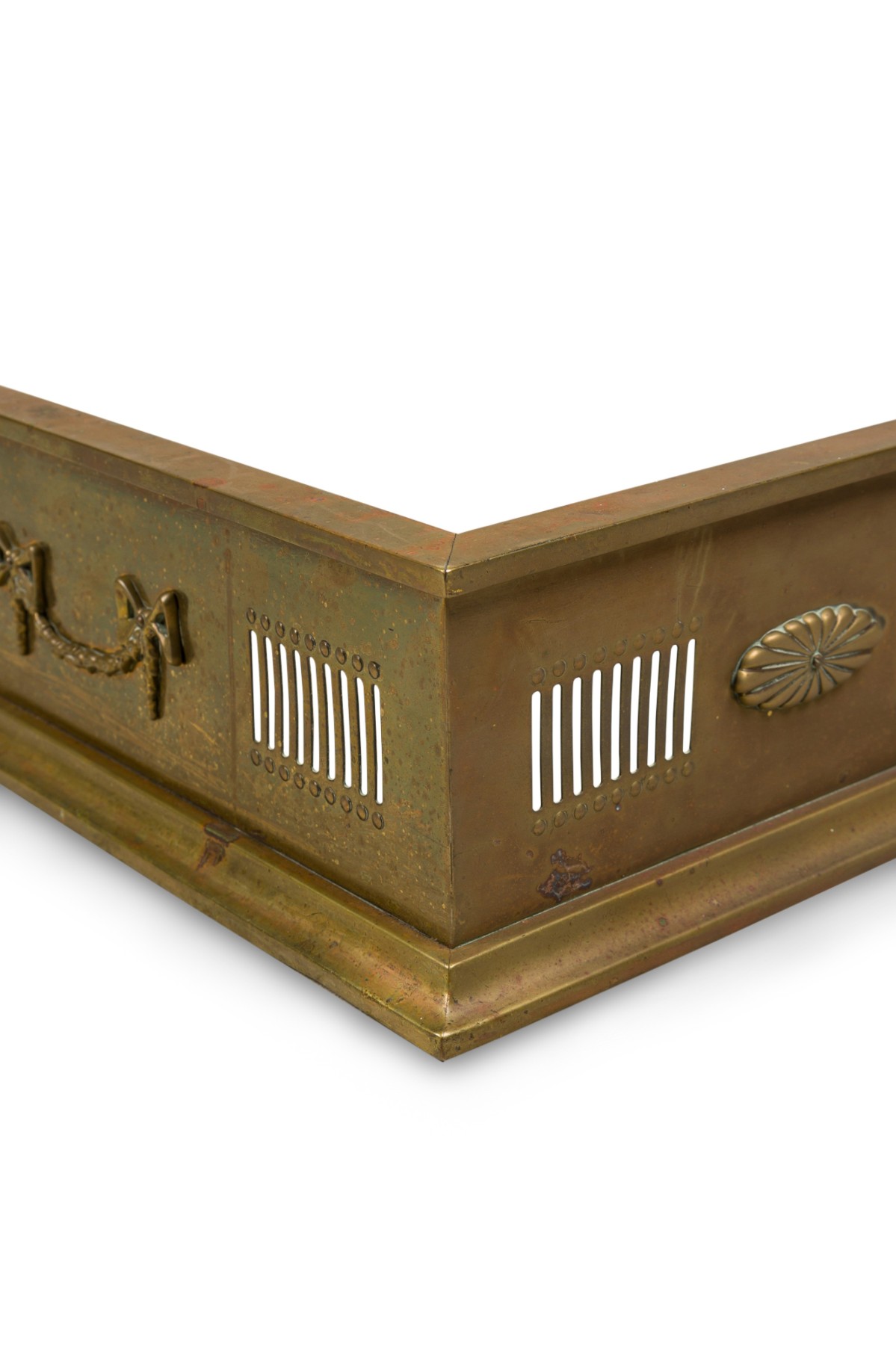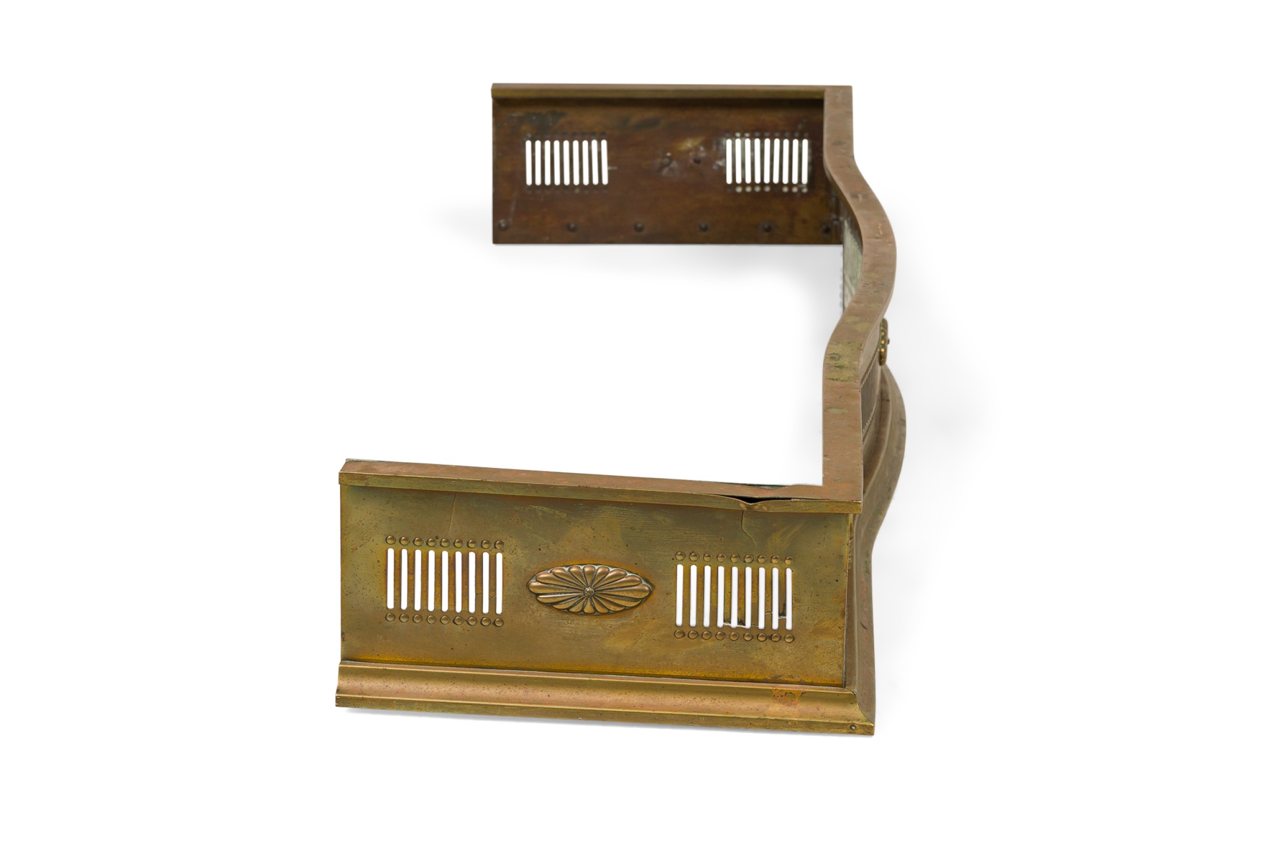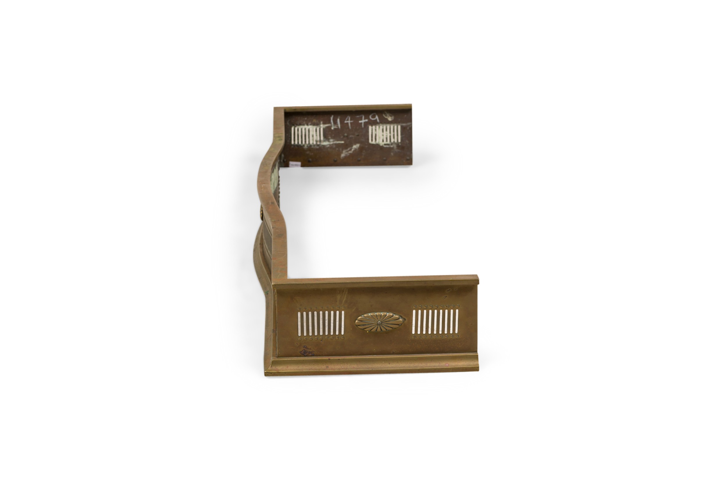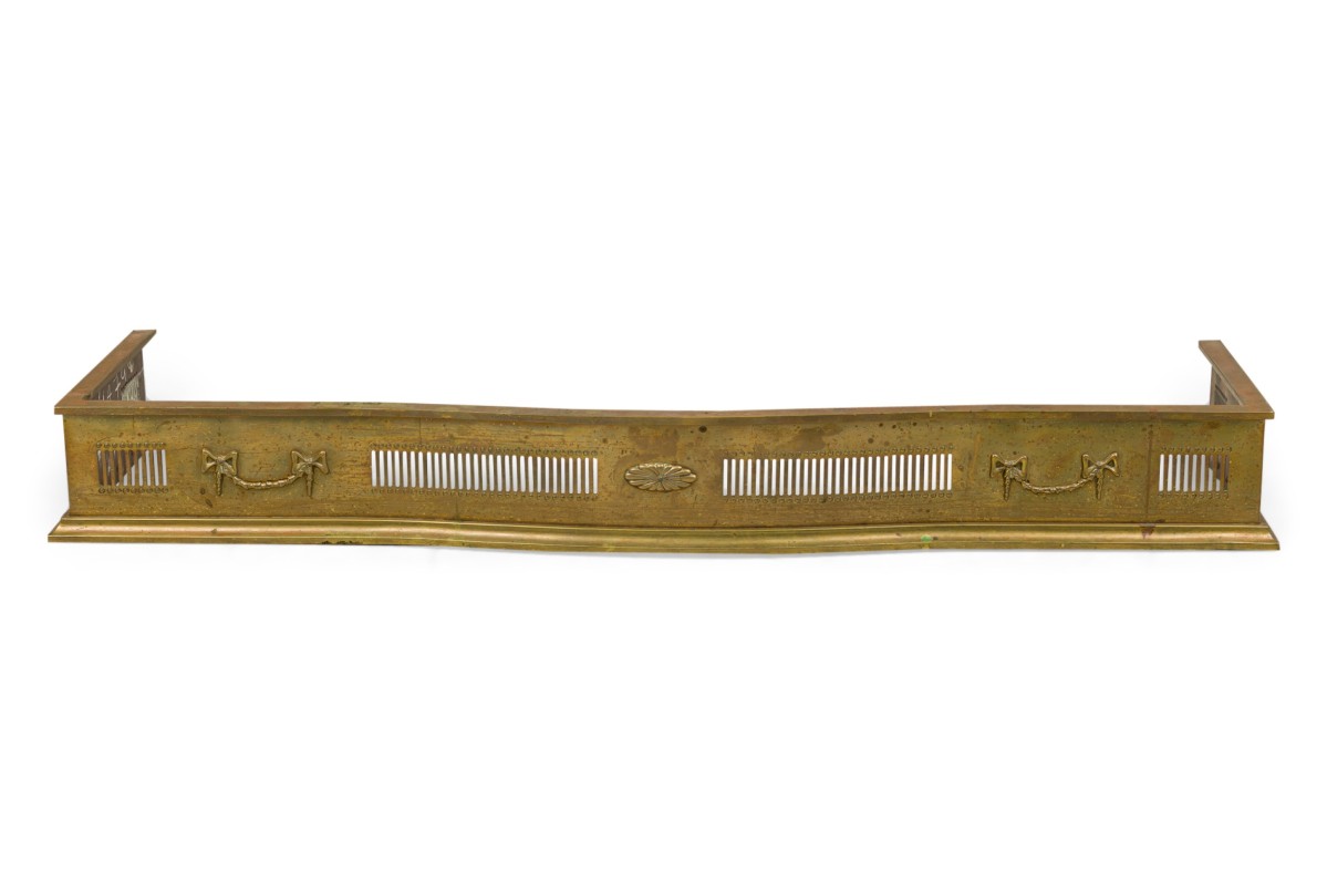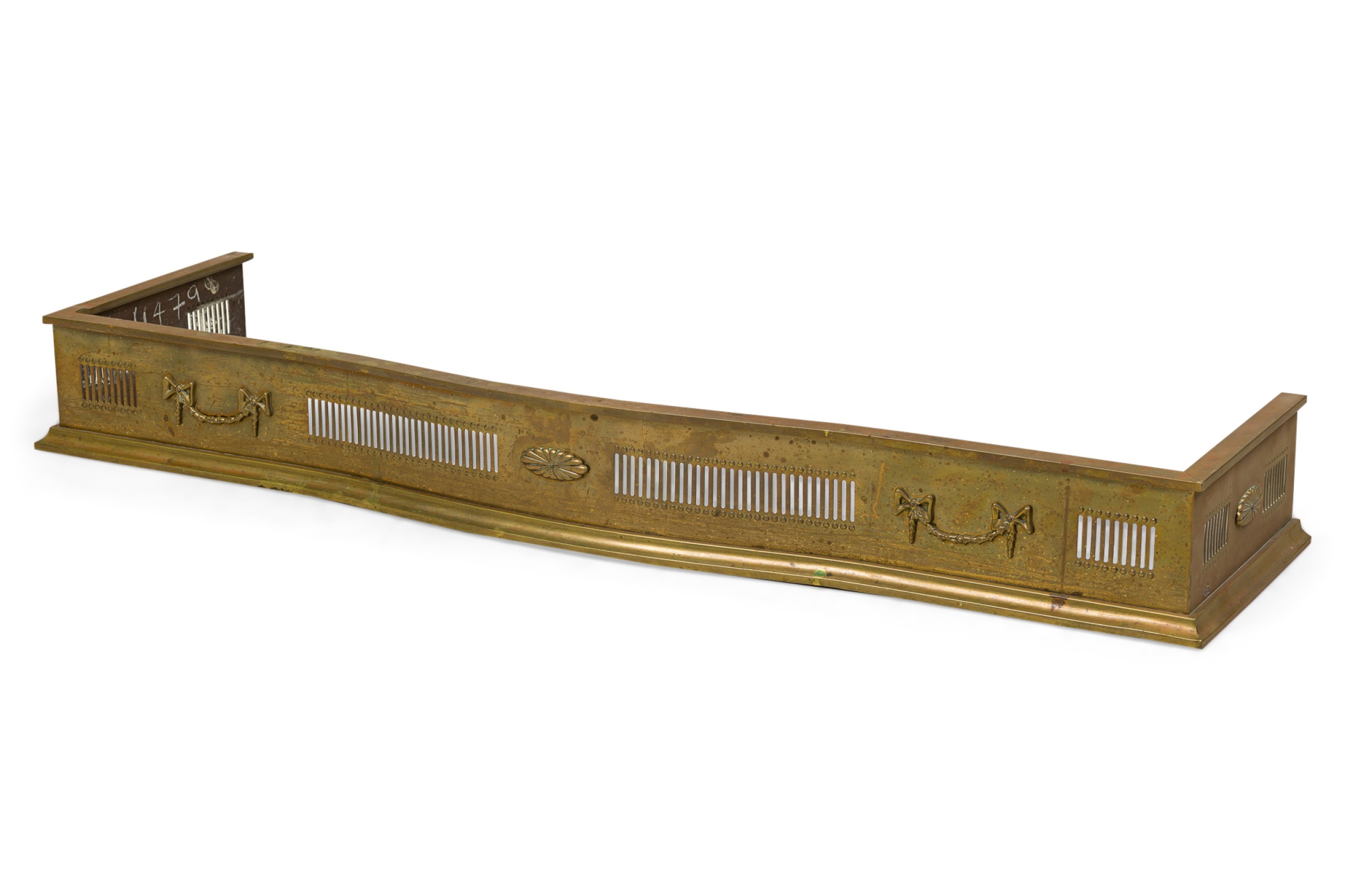 English Regency style bowed front brass fire fender with low relief floral motifs and swags having vertical slits