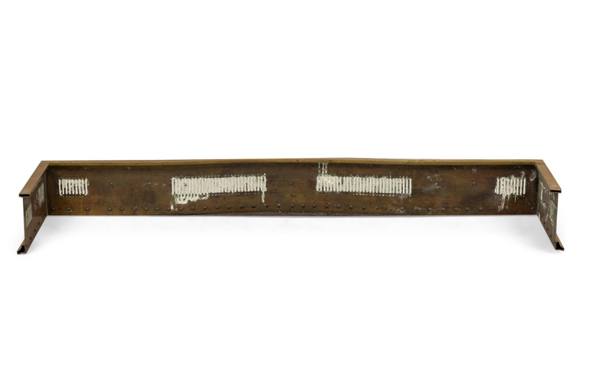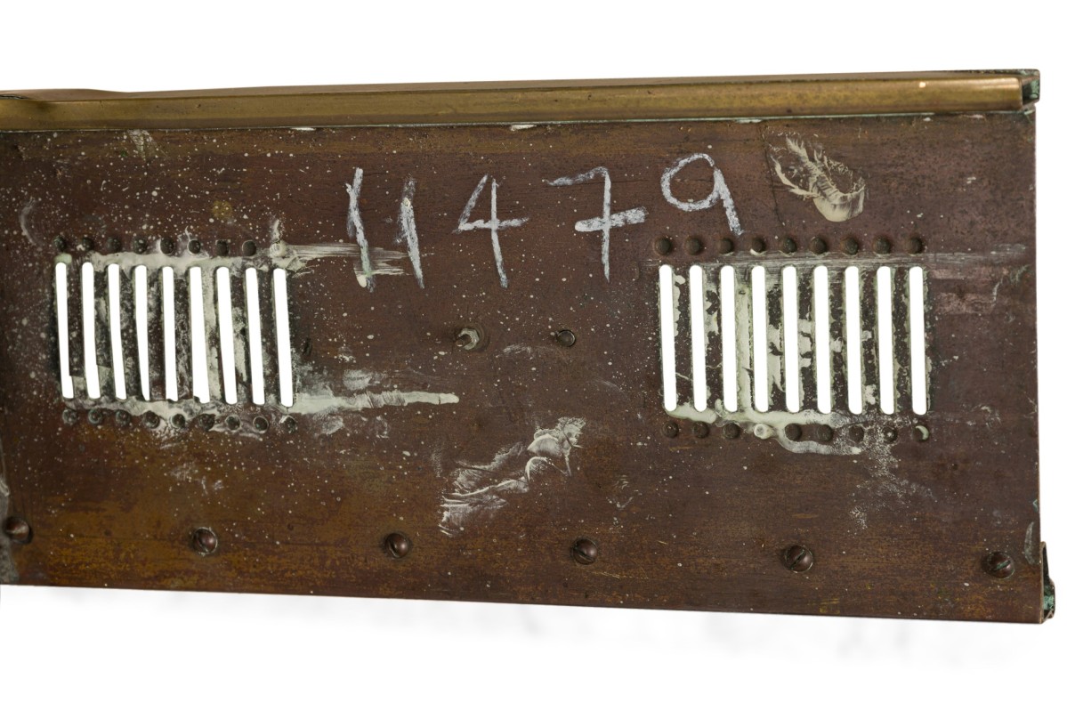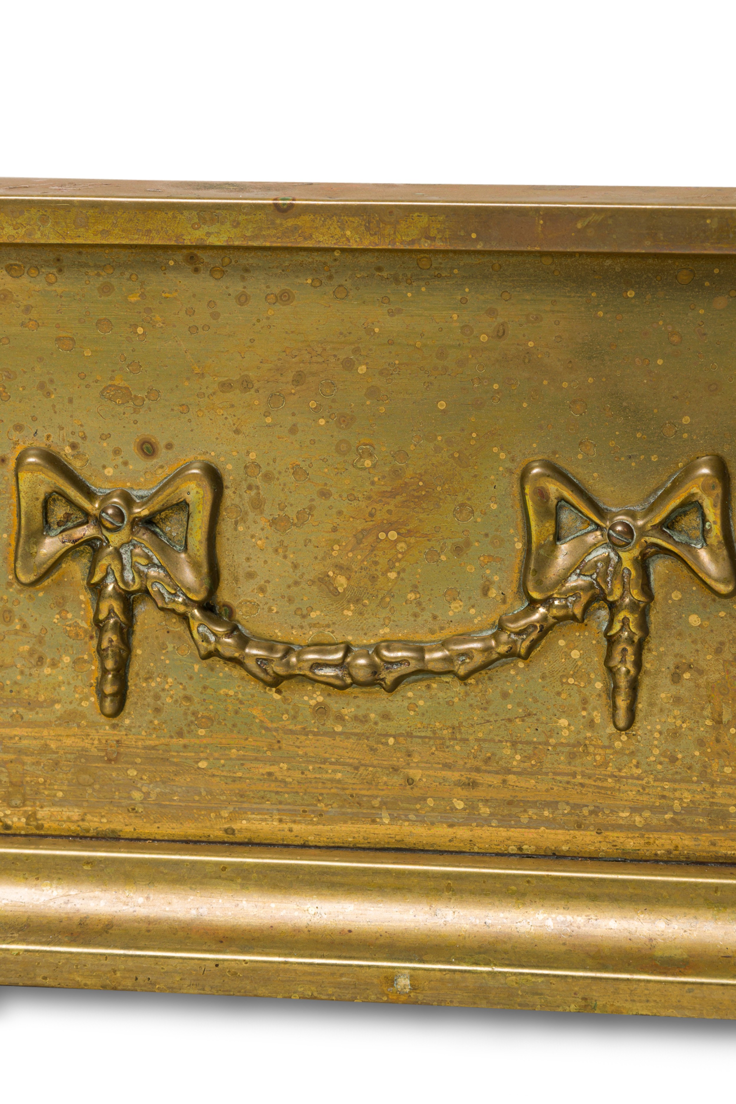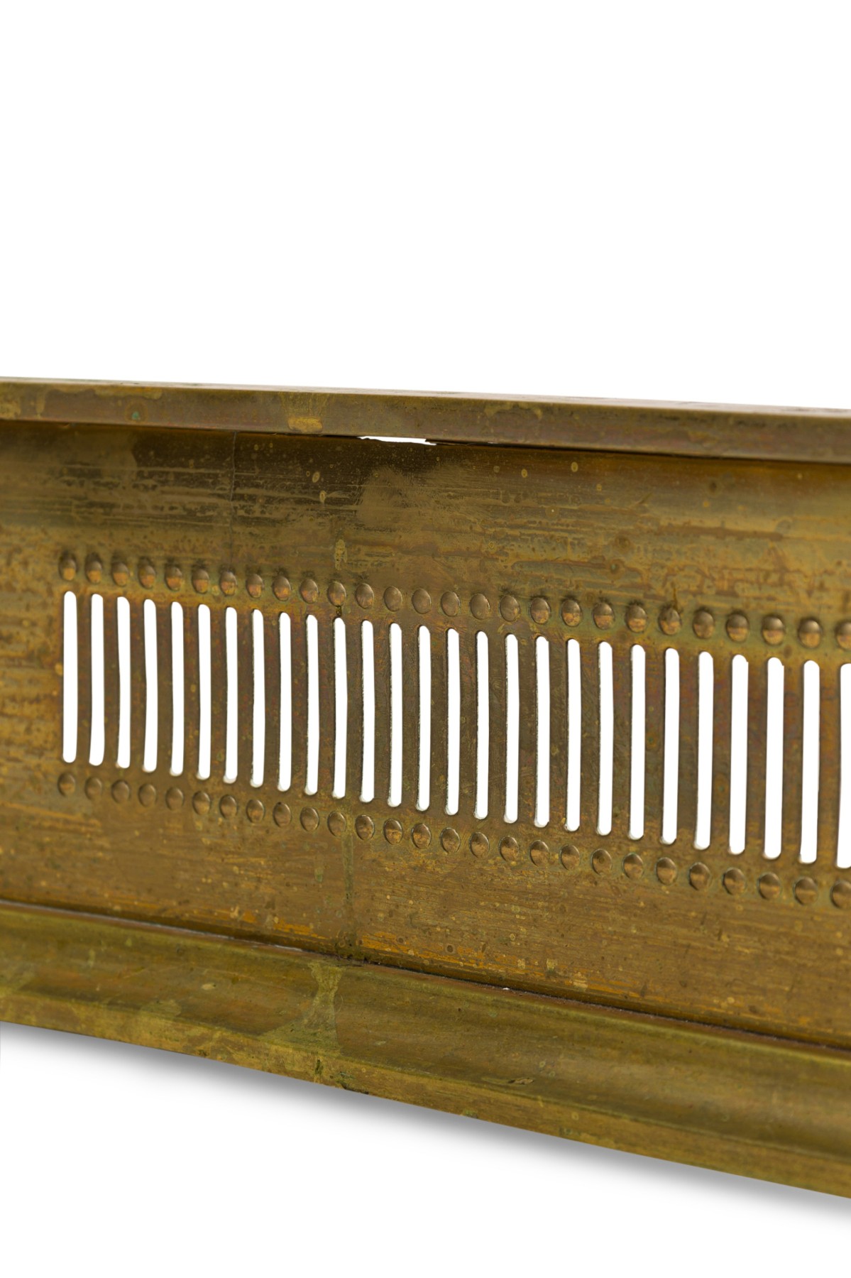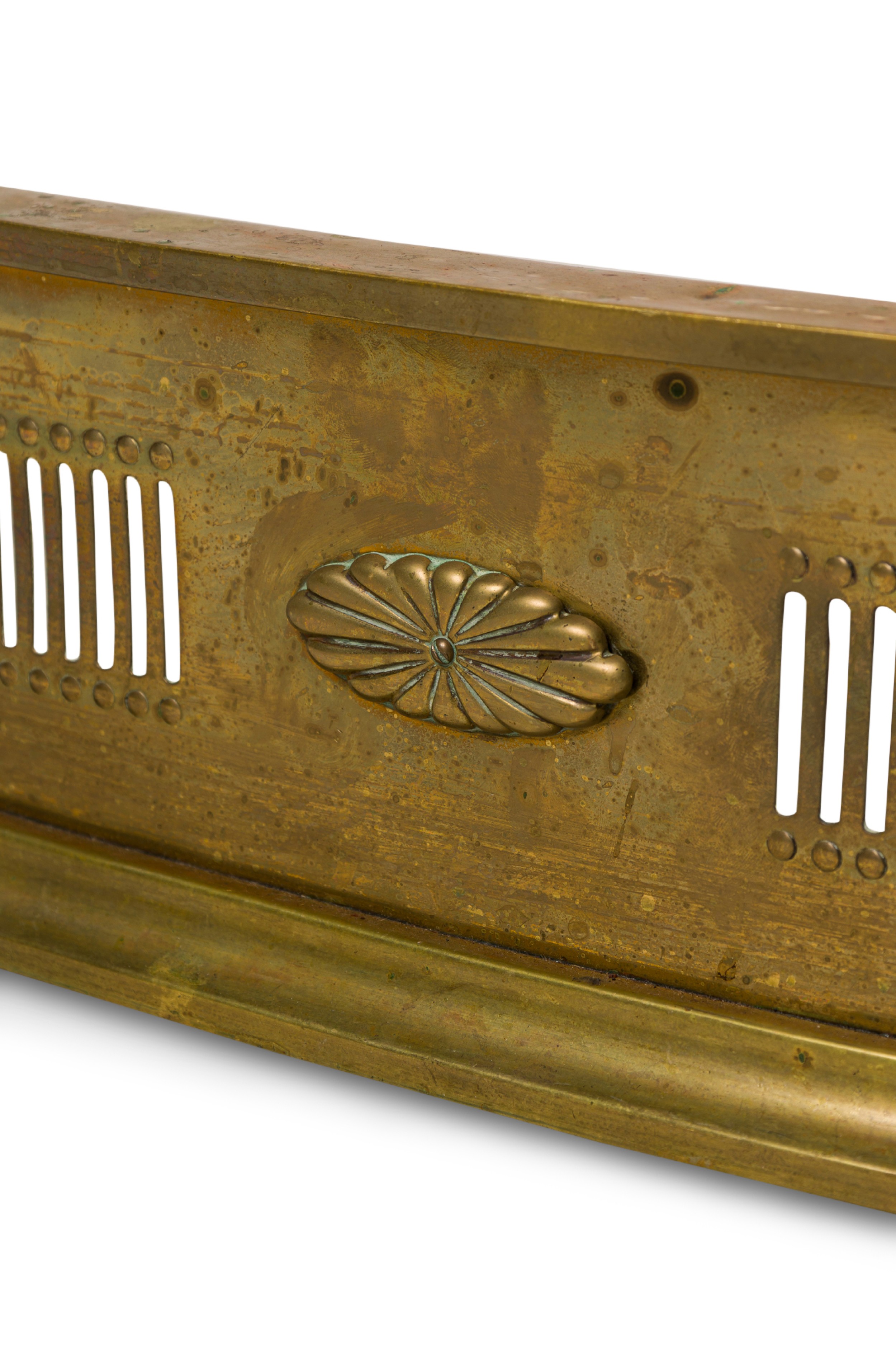 English Regency style bowed front brass fire fender with low relief floral motifs and swags having vertical slits