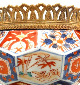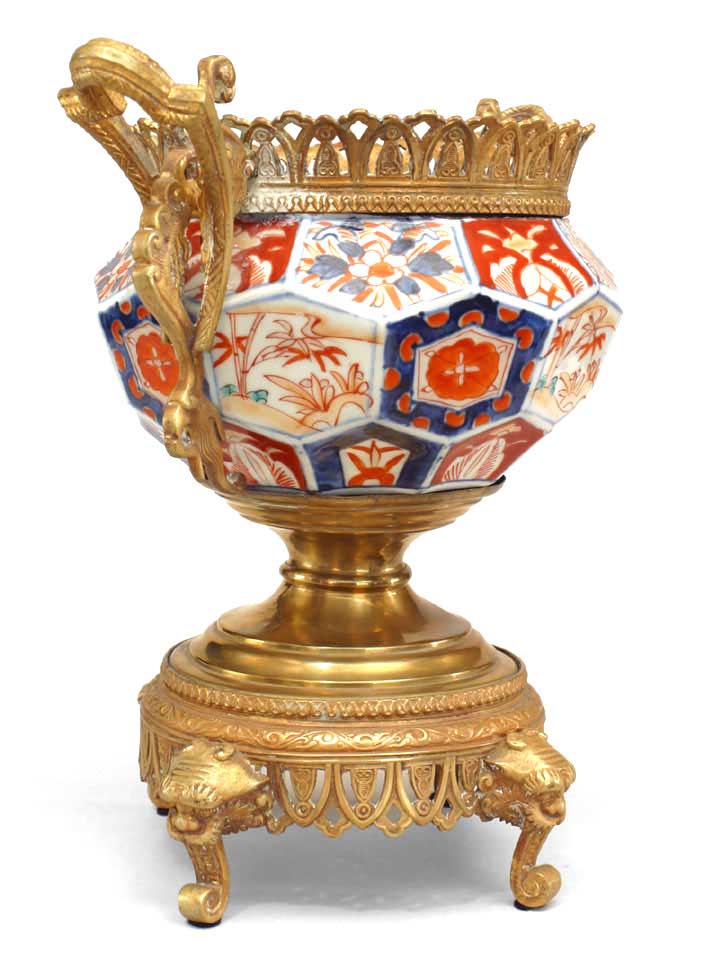 English Regency-style (19th Century) Imari porcelain centerpiece with bronze trimmed base and handles and round filigree top.