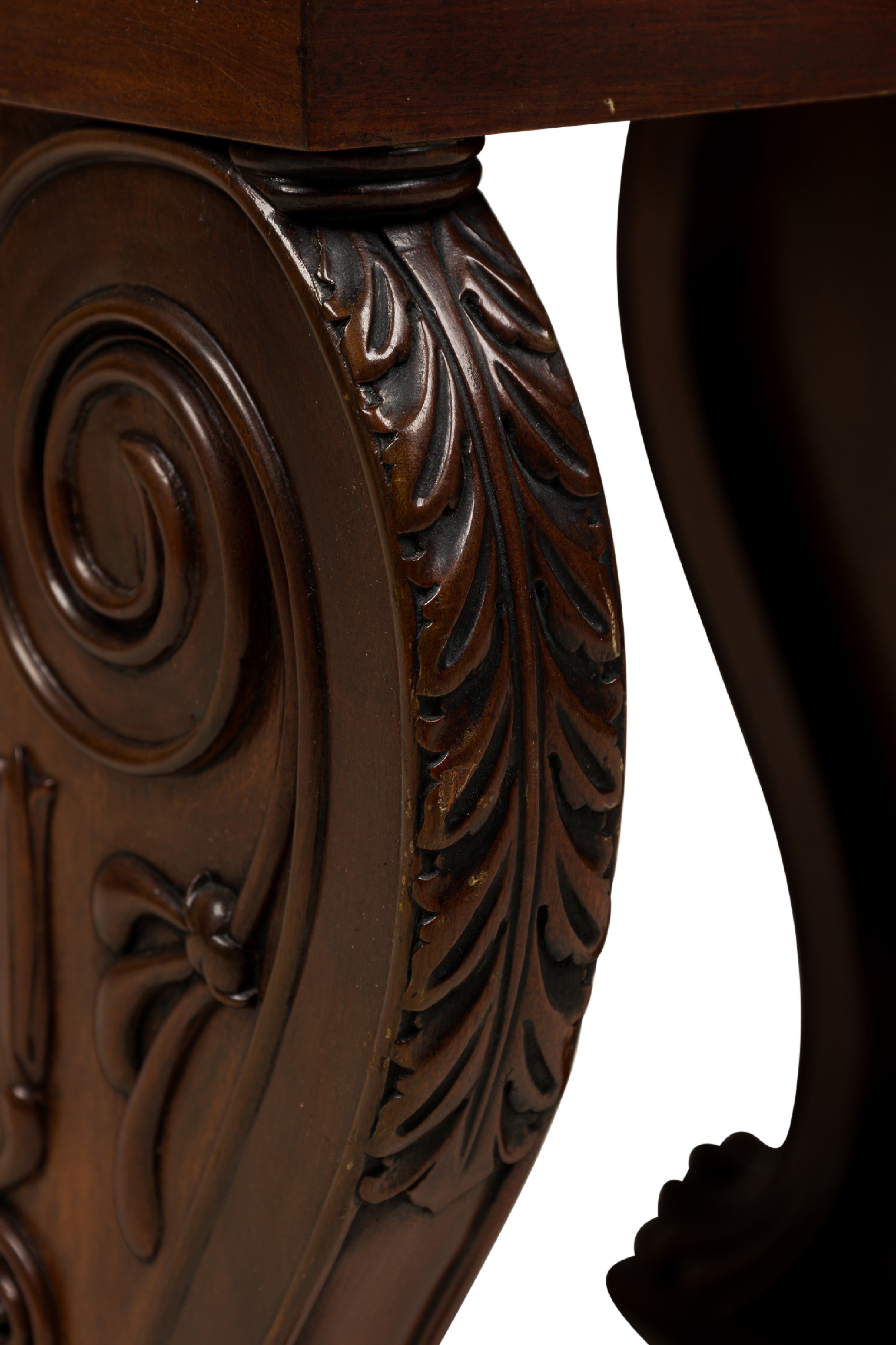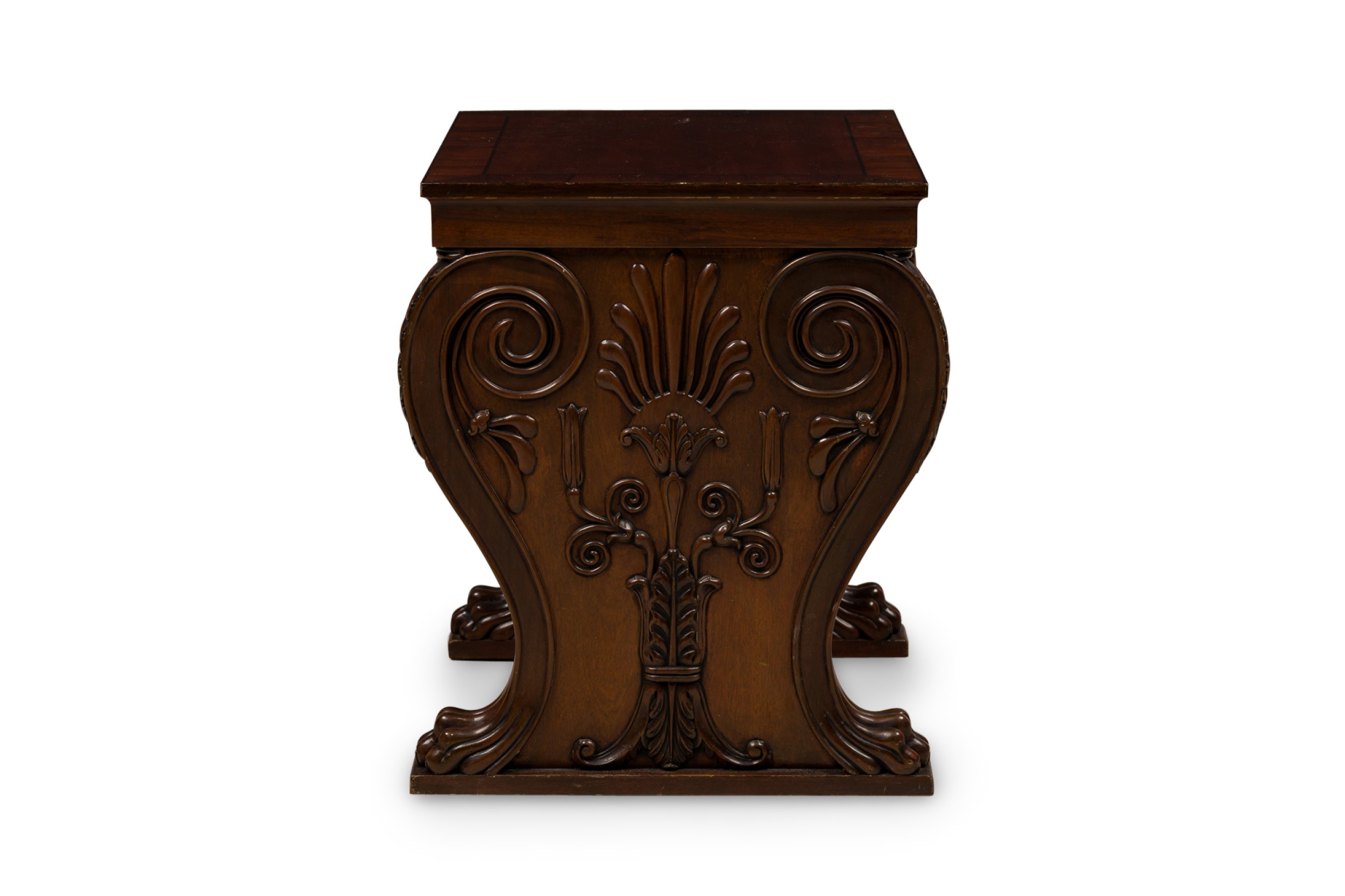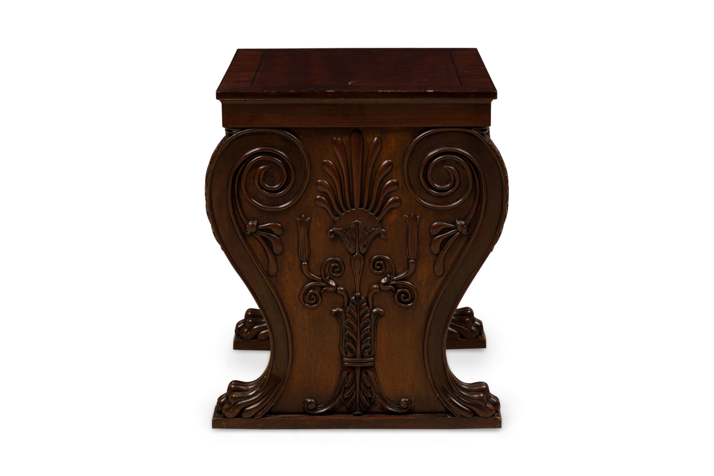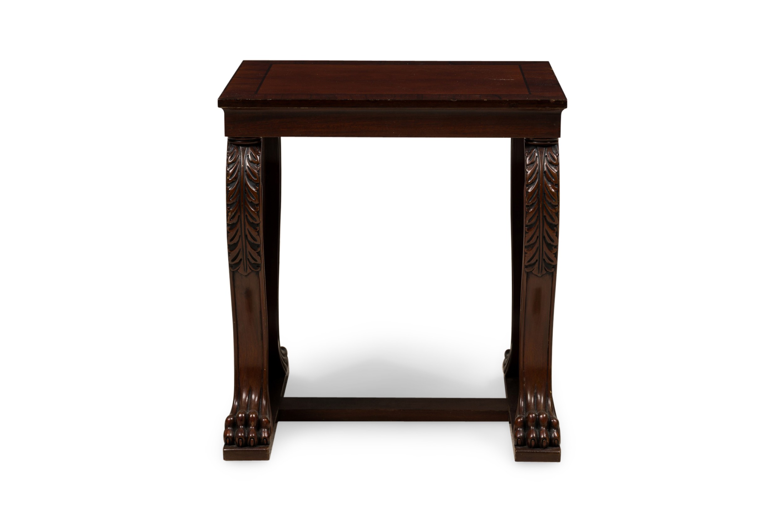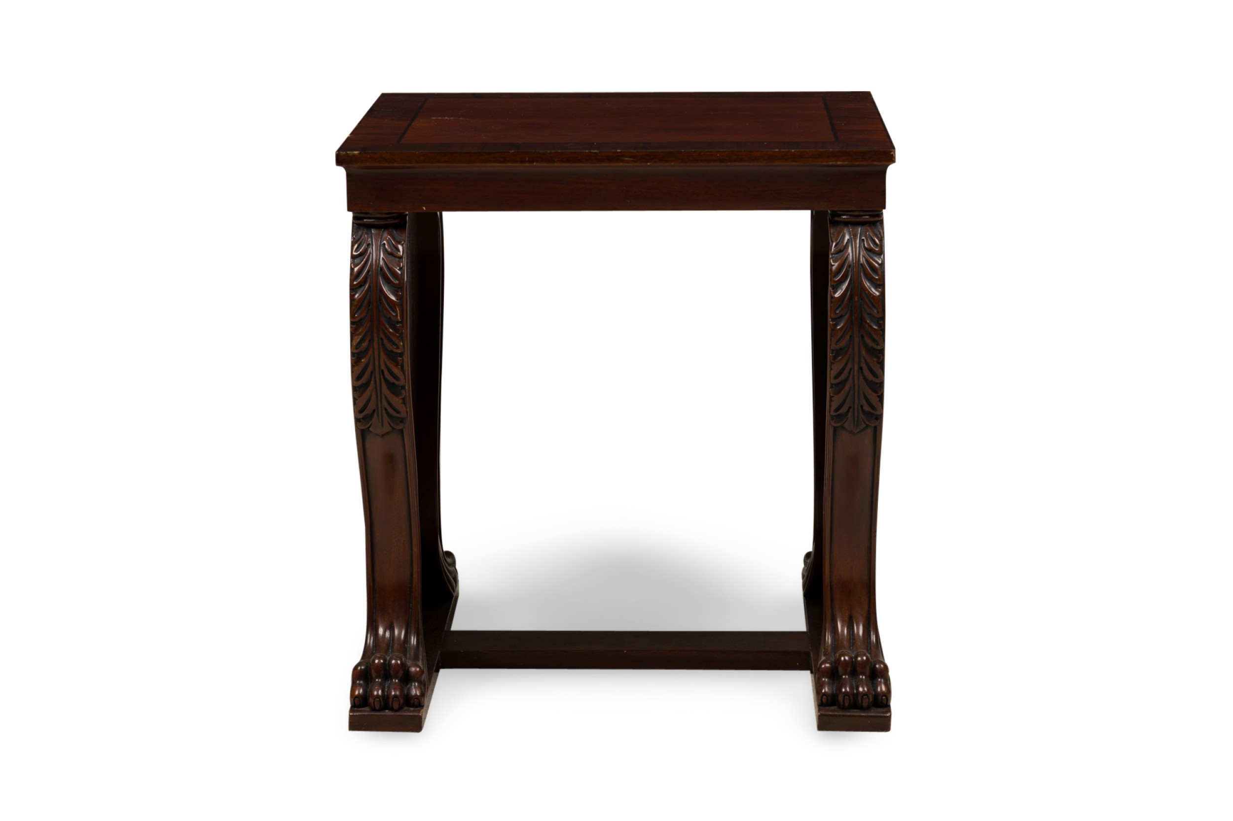 English Regency style side table featuring rosewood veneered top with mahogany border, ending on trestle legs carved with scallop or foliate designs