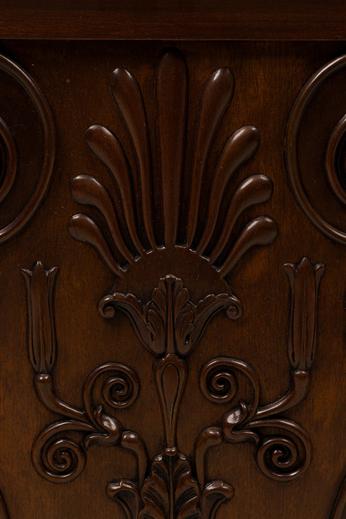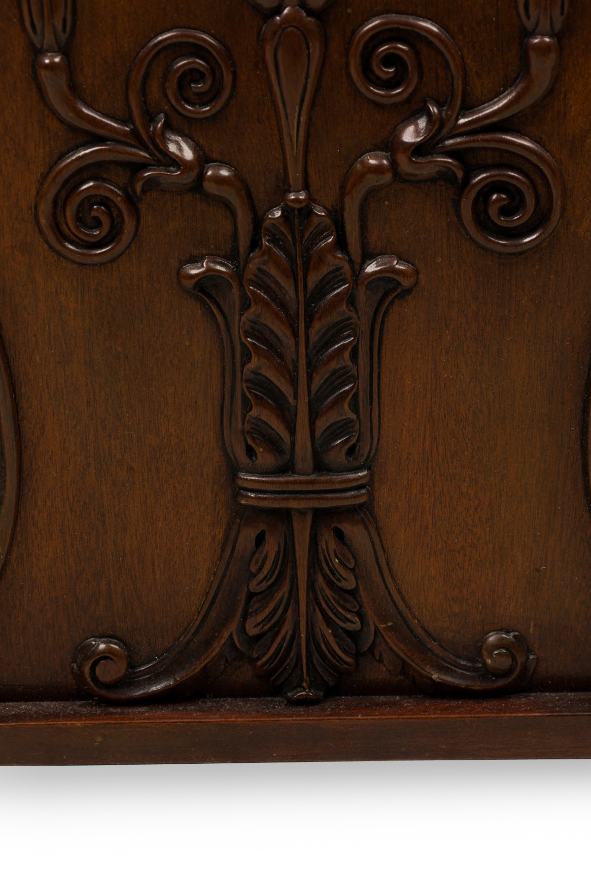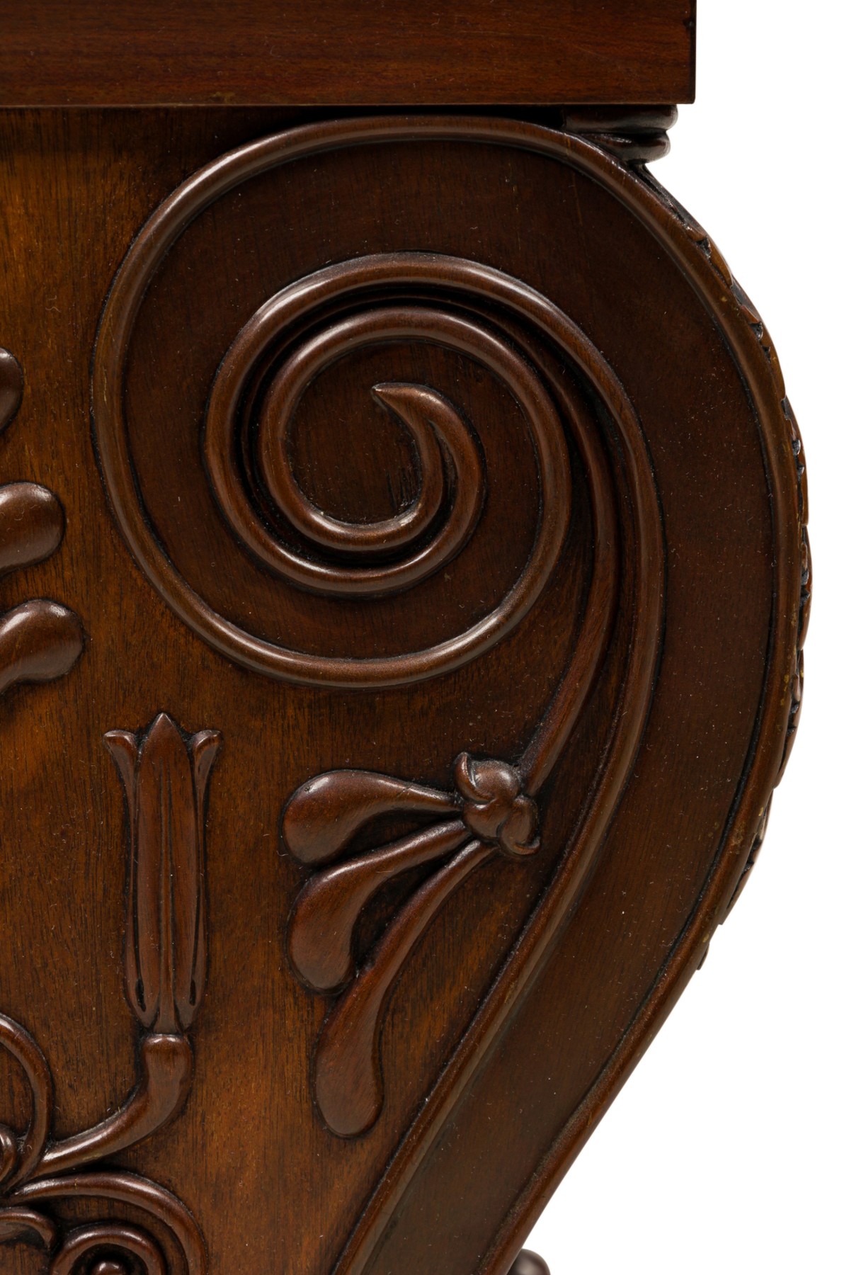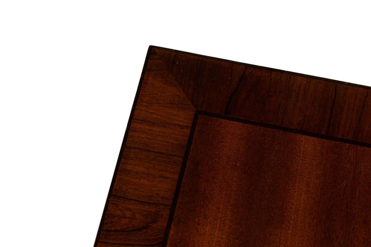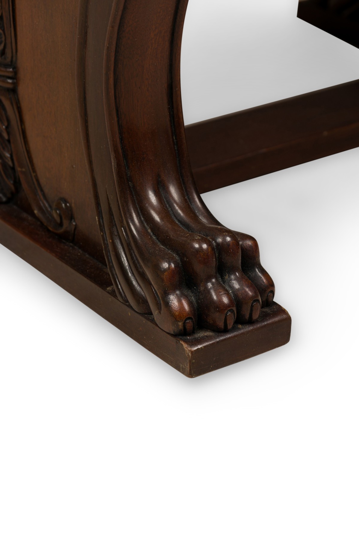 English Regency style side table featuring rosewood veneered top with mahogany border, ending on trestle legs carved with scallop or foliate designs