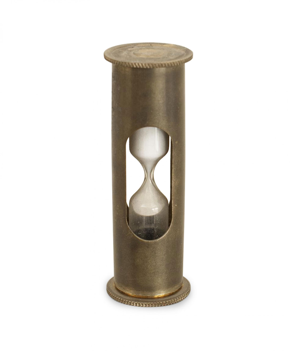English Renaissance-style (20th Century) brass hour glass in a cylindrical frame (3 minute timer)