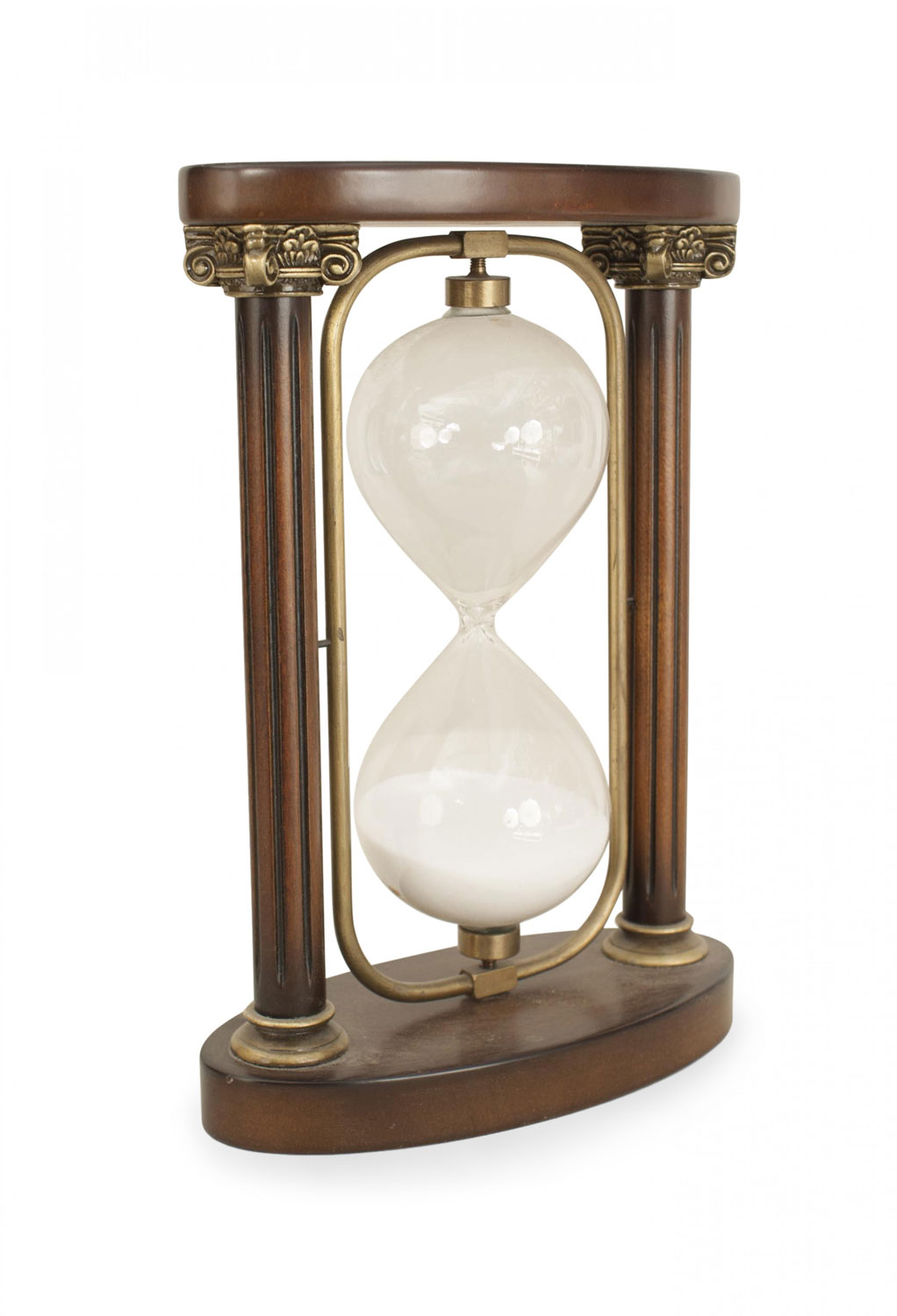 English Renaissance-style (20th Century) mahogany hour glass with 3 brass scroll supports and finials