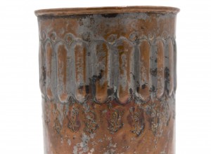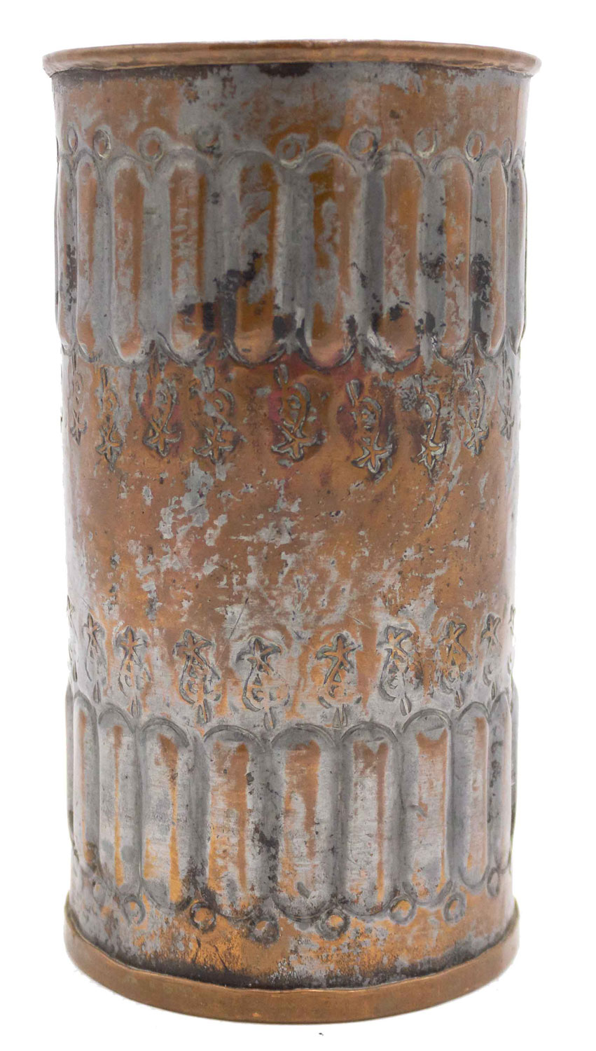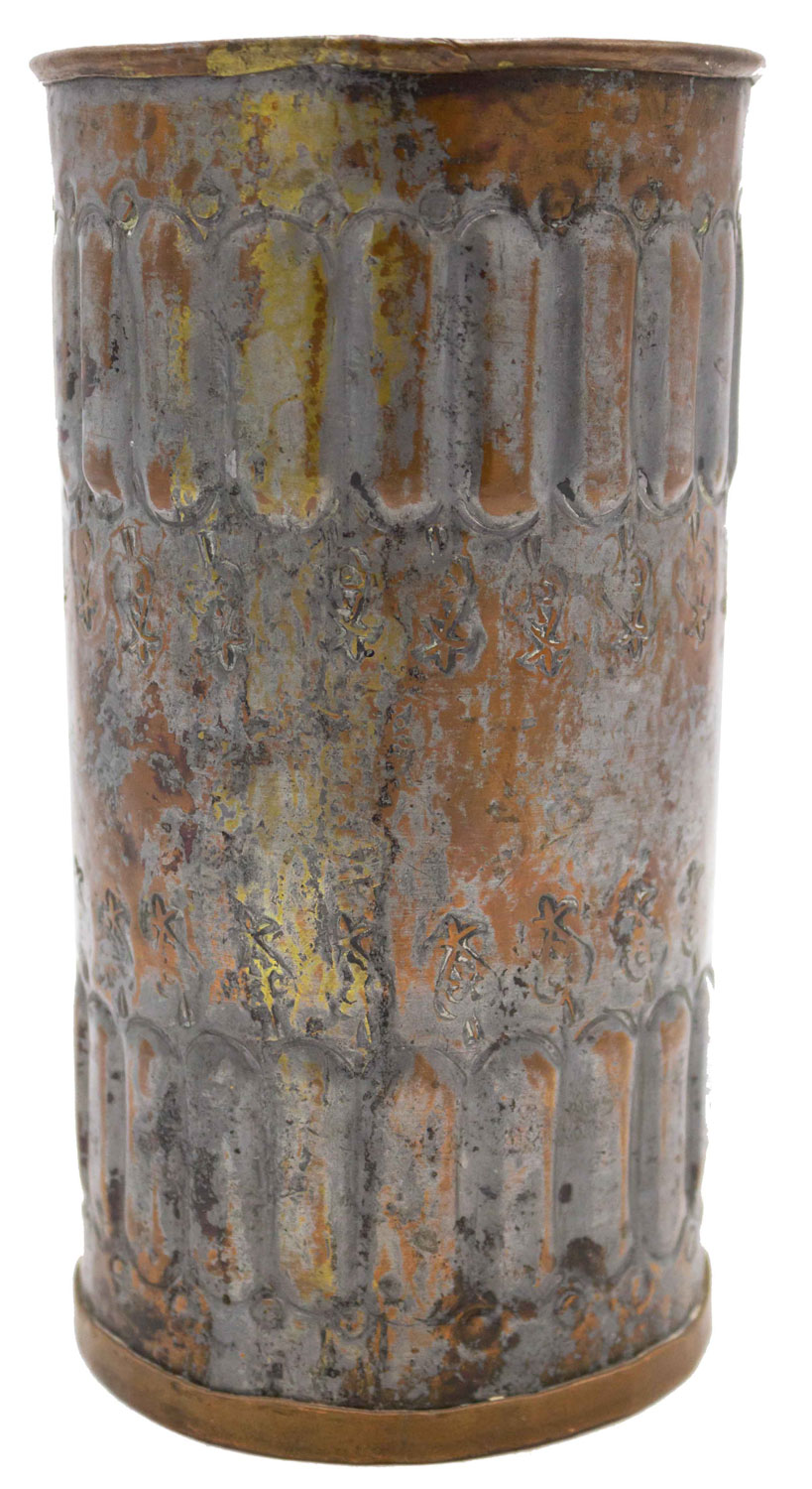 English Renaissance style (20th Cent) silver plate on copper cylindrical container with fluted and etched design.