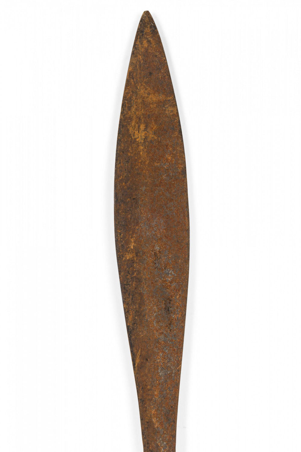 English Renaissance-style spear with wooden shaft and simple 15-inch leaf-shaped iron blade.