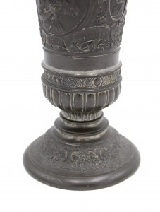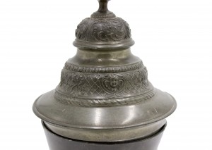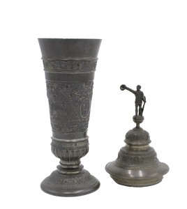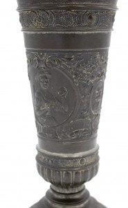 English Renaissance-style (19th Century) pewter chalice with hunter and gun relief and finial on lid.
