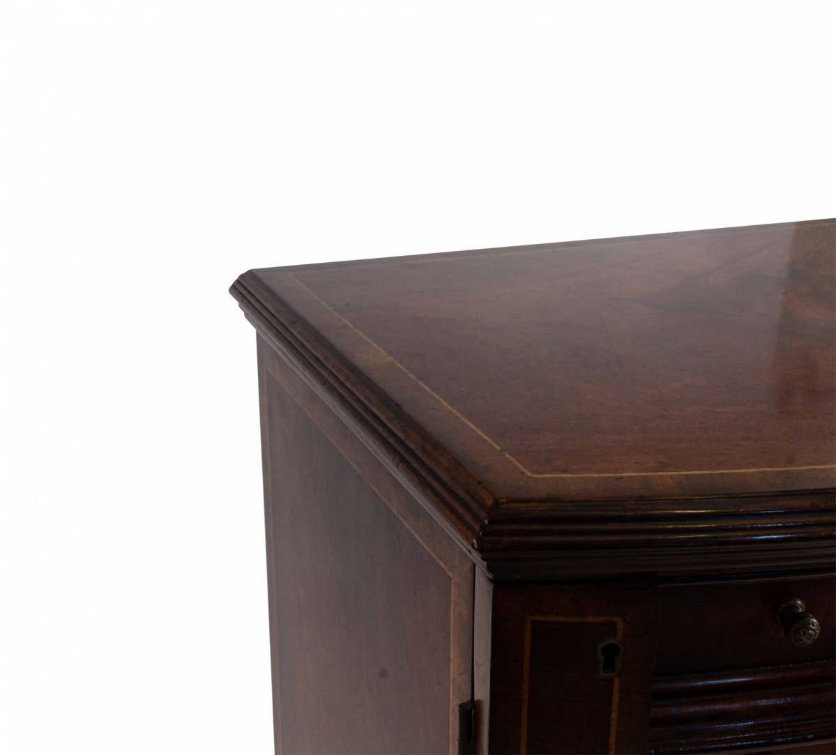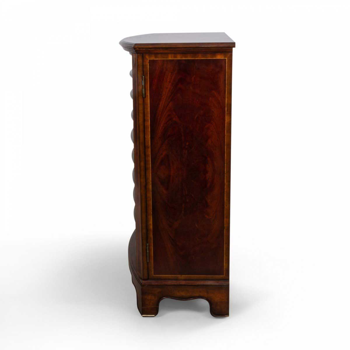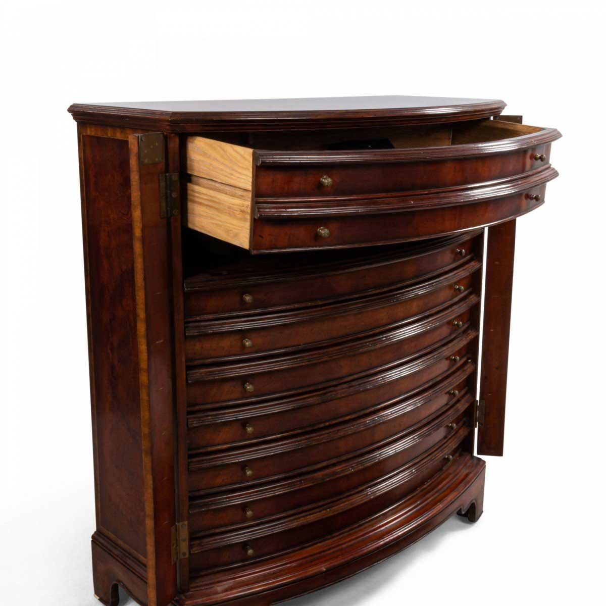 English Sheraton style mahogany bow front table leaf chest with 10 drawers (1 top storage drawer, and each of the others fitted for leaves associated with table 062479) having brass pulls & 2 locking side panels with a thin inlay border (NOTE: Missing key