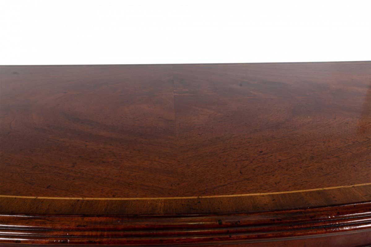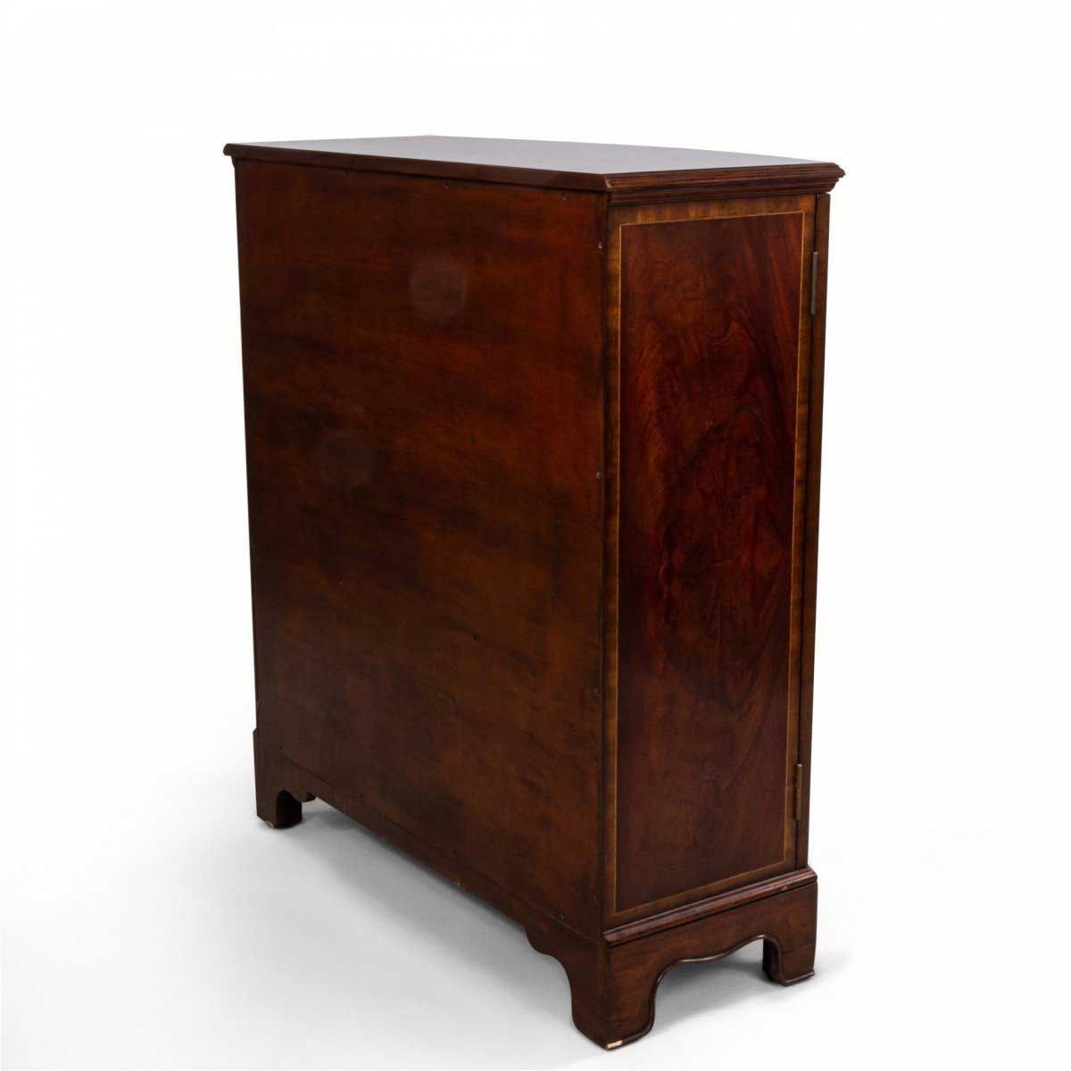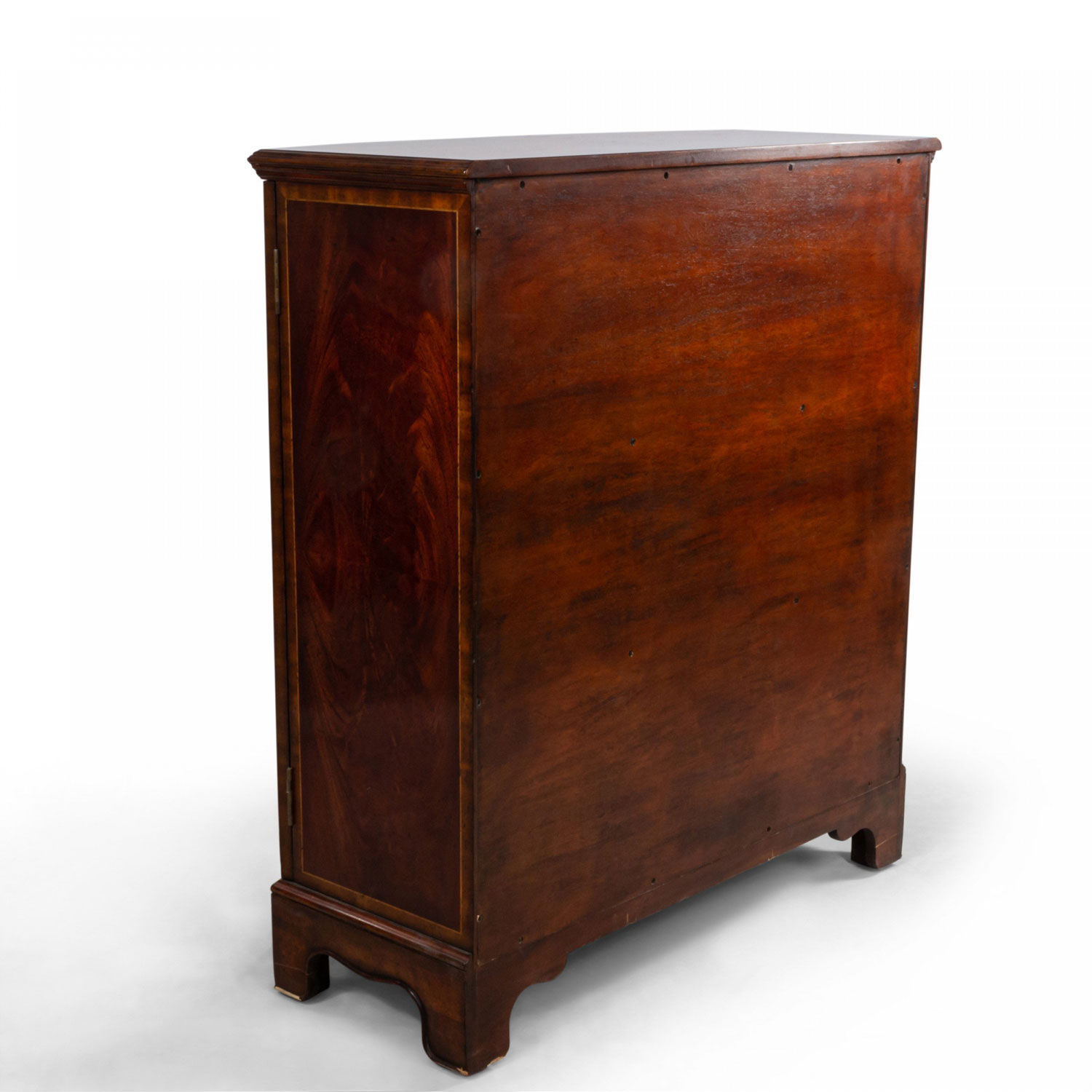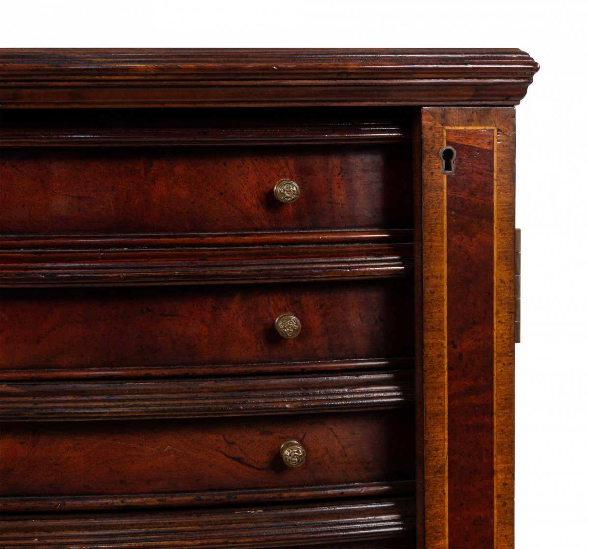 English Sheraton style mahogany bow front table leaf chest with 10 drawers (1 top storage drawer, and each of the others fitted for leaves associated with table 062479) having brass pulls & 2 locking side panels with a thin inlay border (NOTE: Missing key