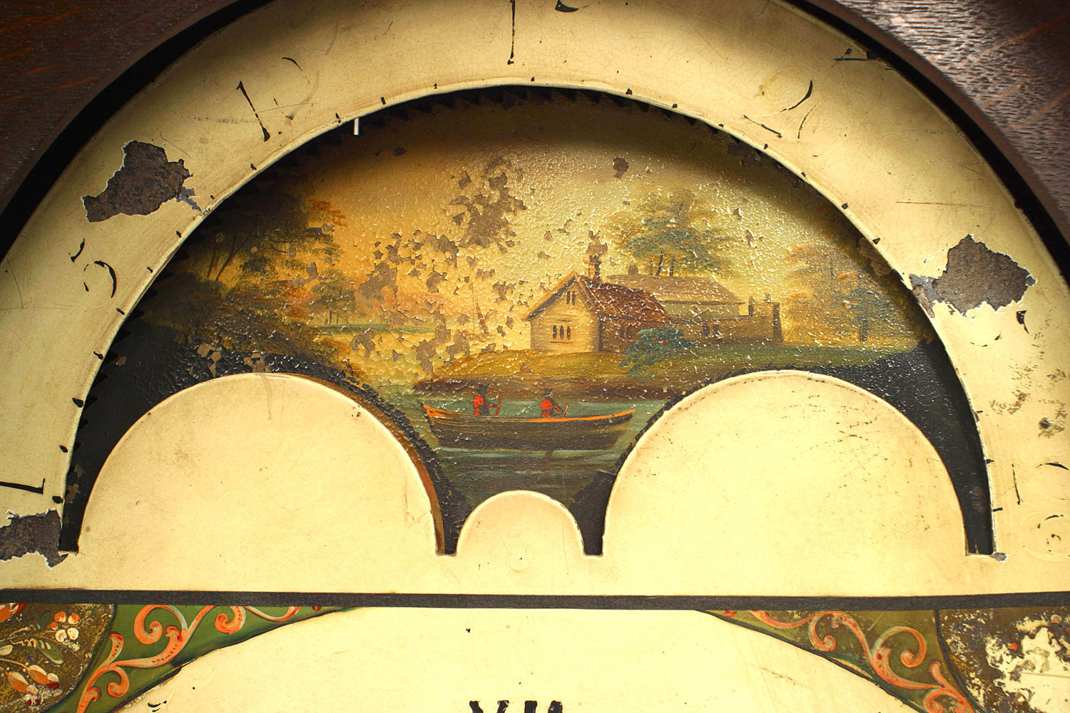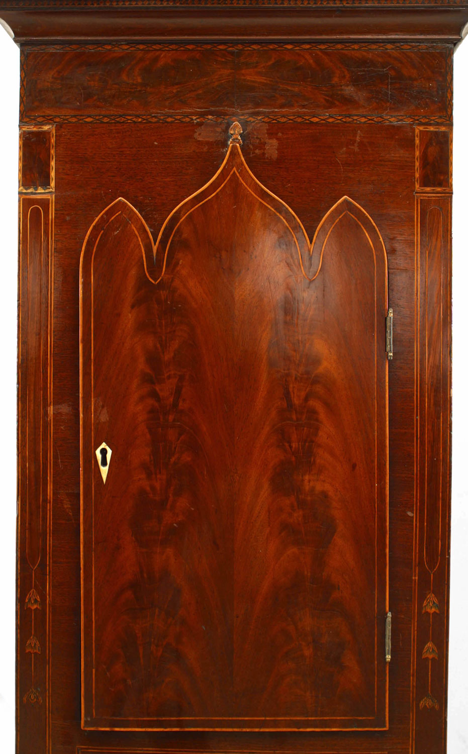 English Sheraton-style (19th Century) mahogany grandfather clock with Gothic arched door (Not working)