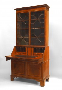 English Sheraton-style (19th Century) mahogany inlaid secretary with 2 lattice doors.