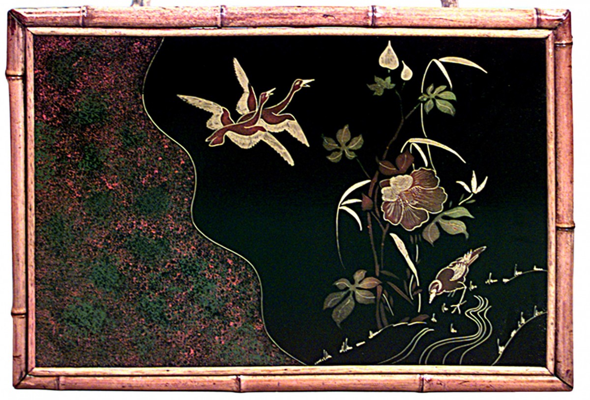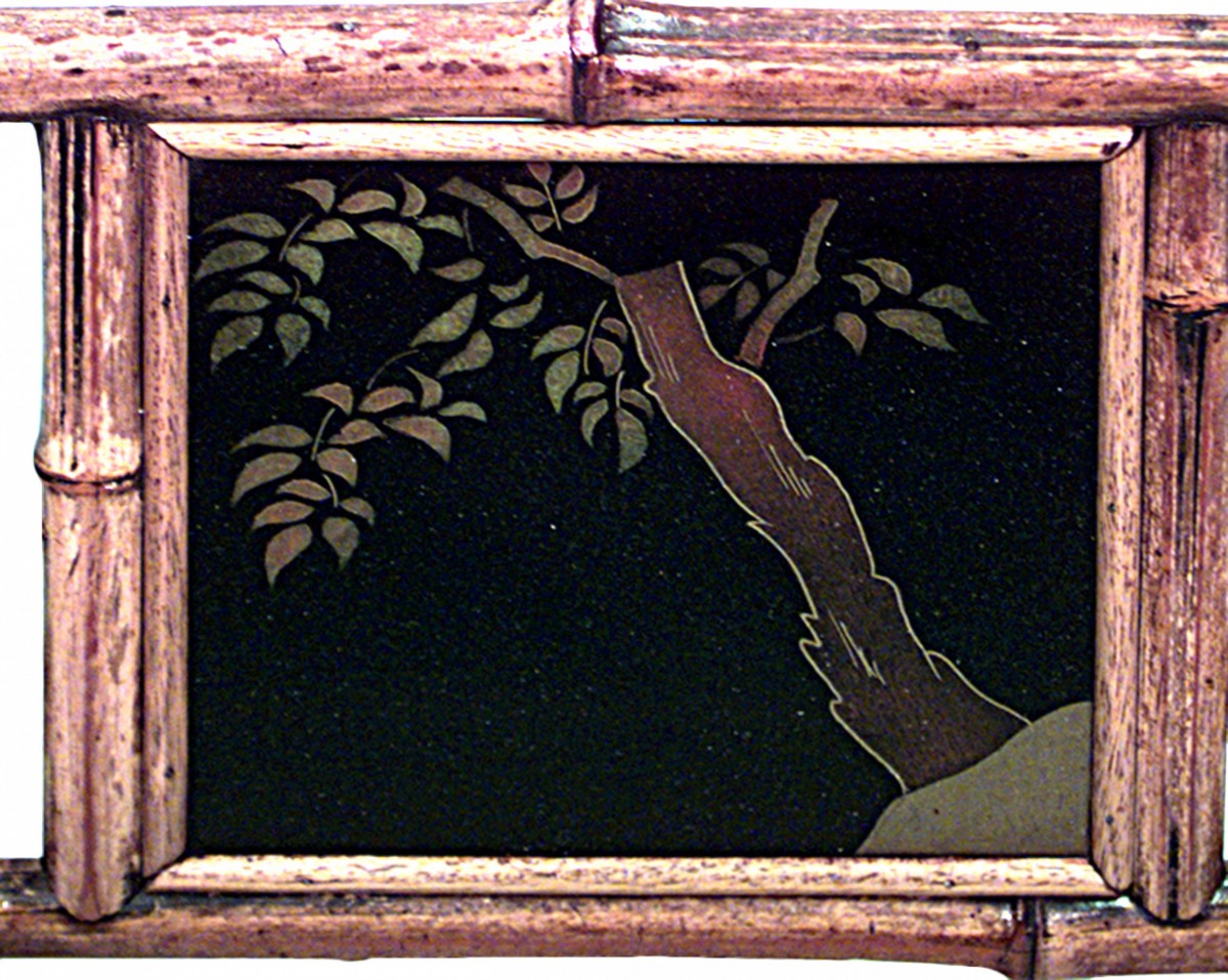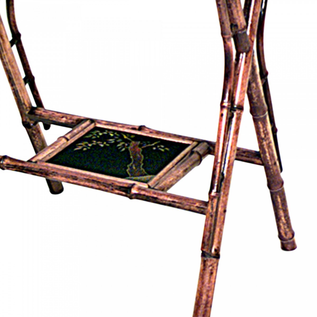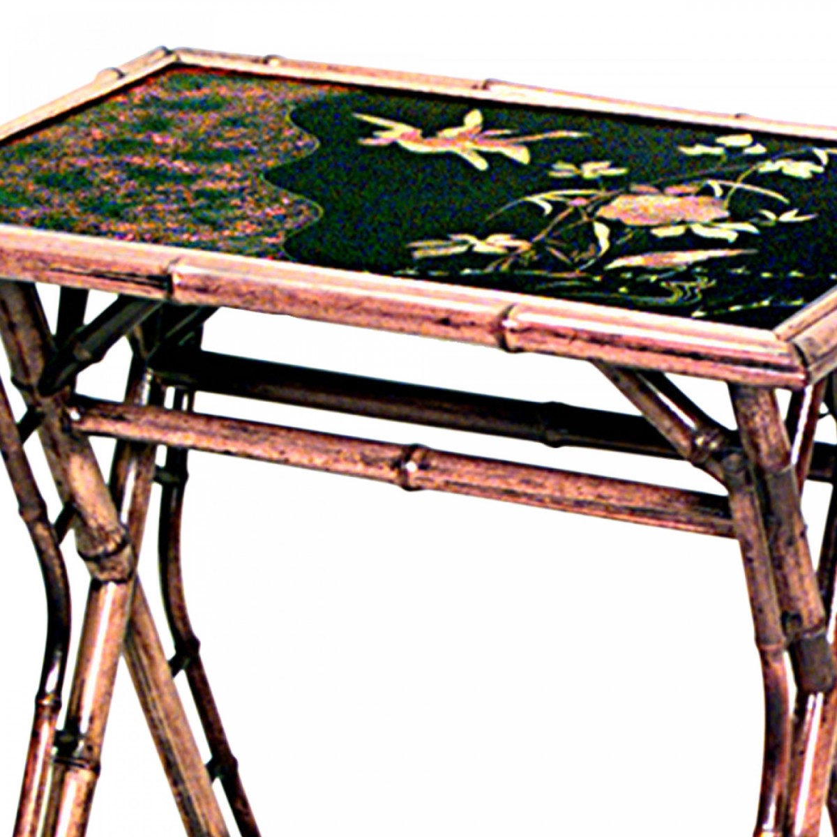 English Victorian-style (20th Century) Bamboo rectangular cross leg end table with lacquered top and shelf.