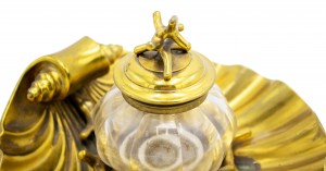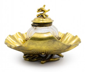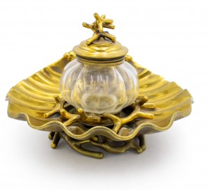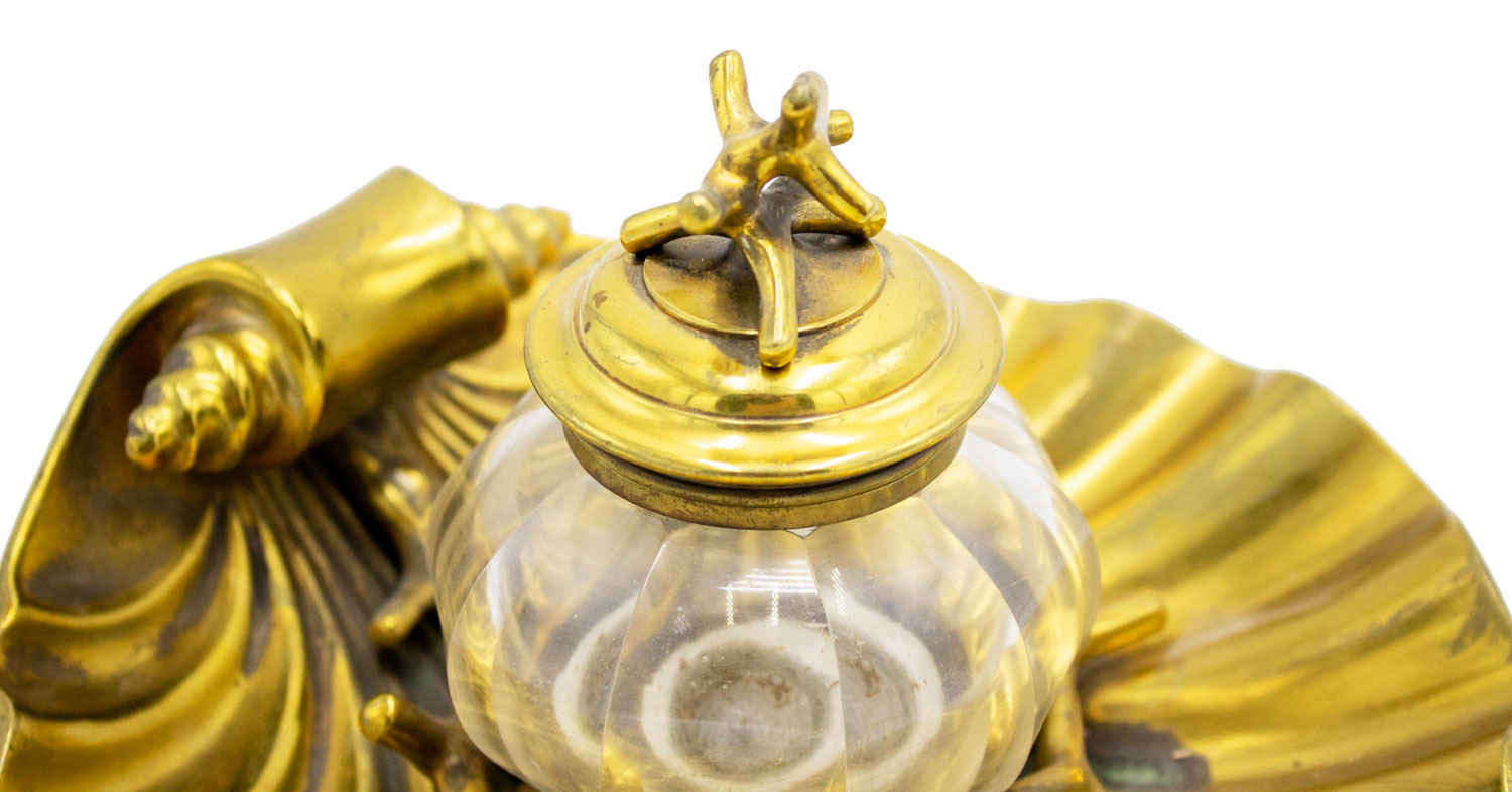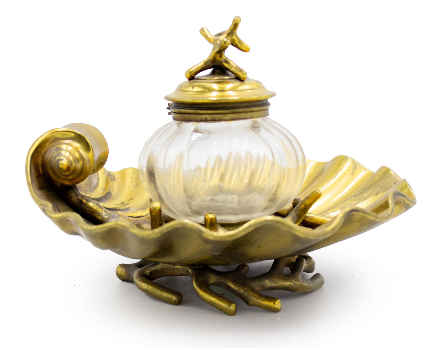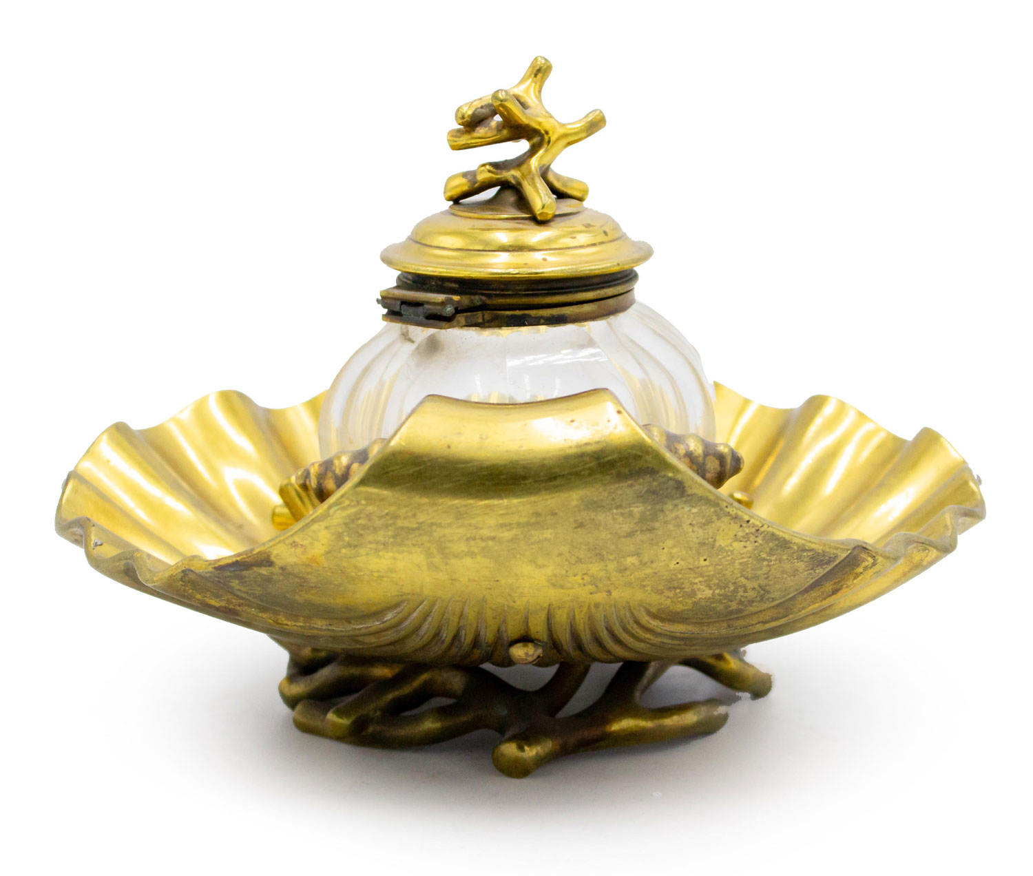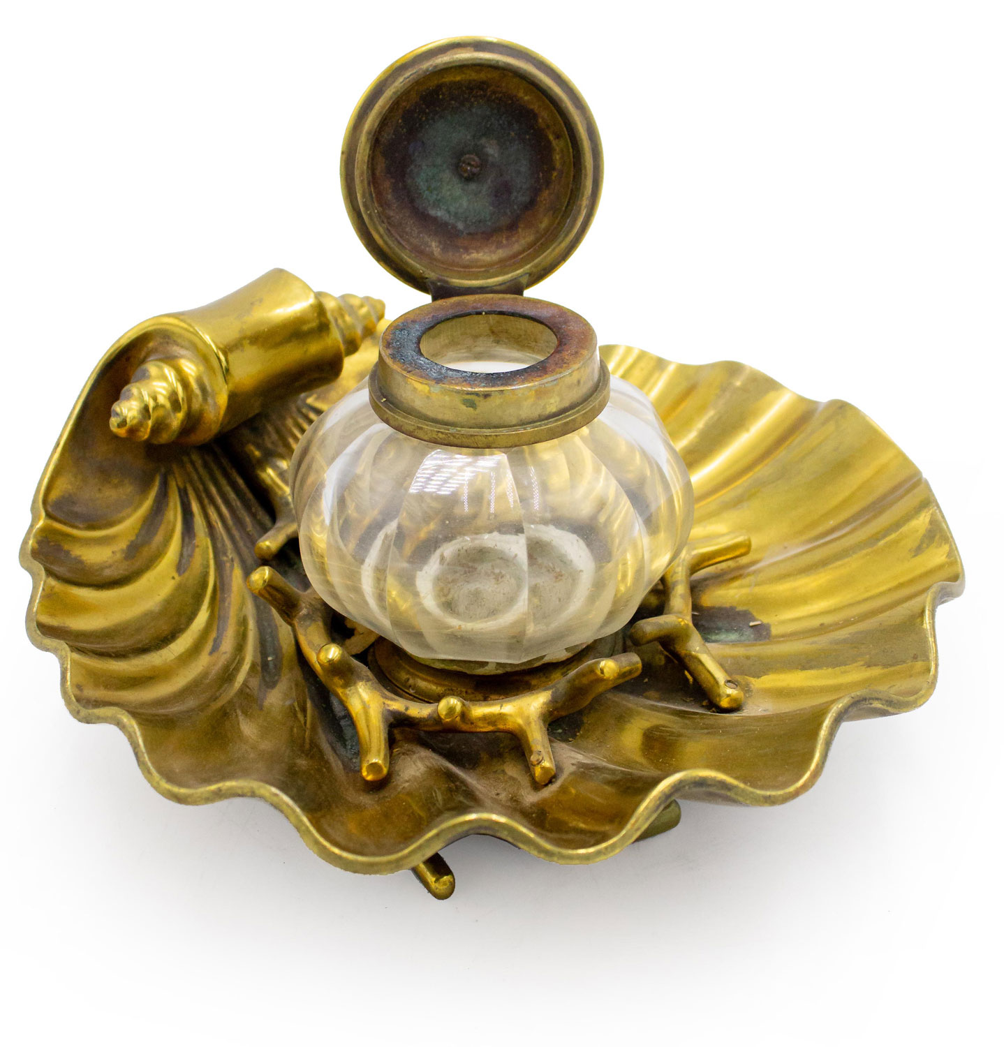 English Victorian brass and crystal shell shaped inkwell with coral design details.