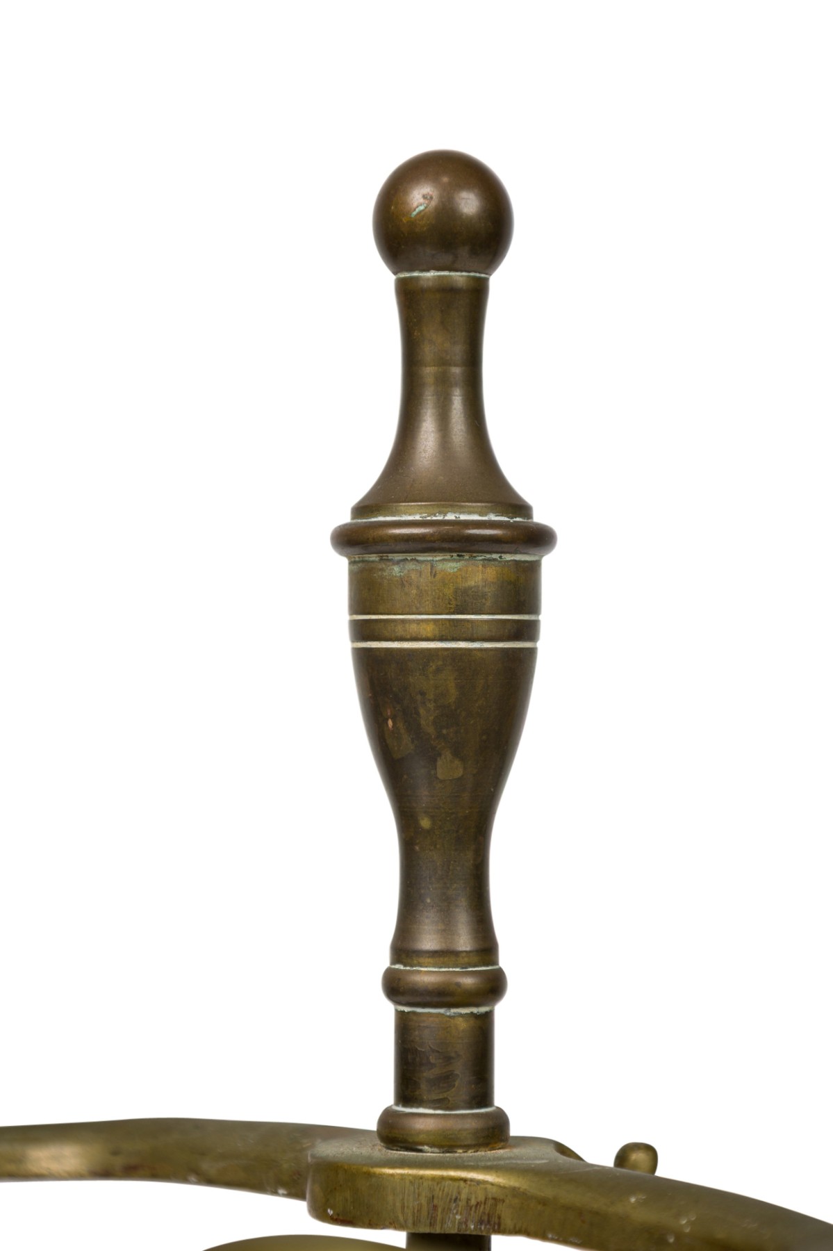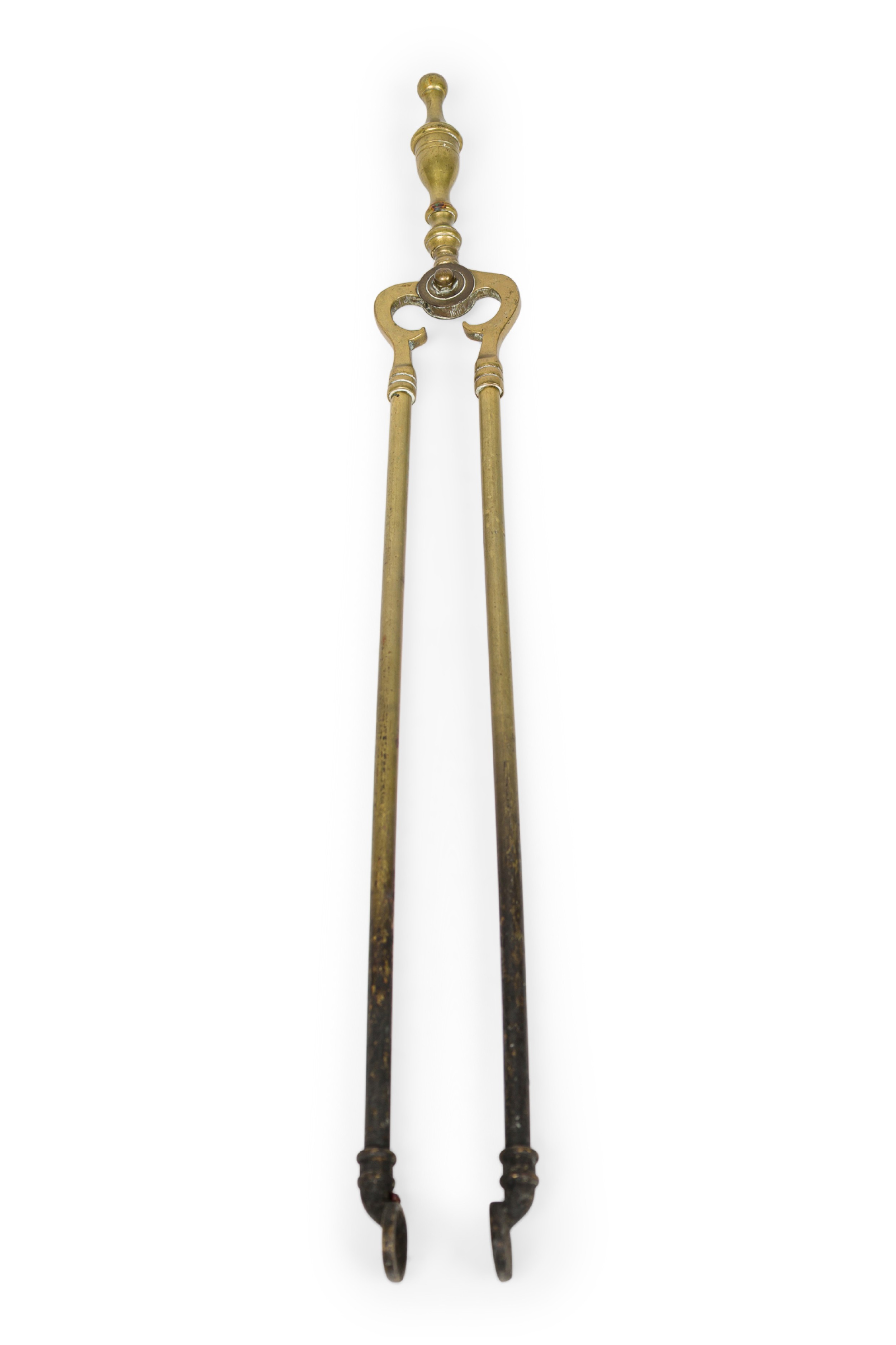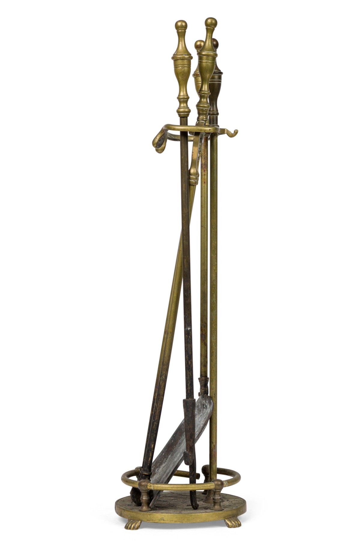 English Victorian style brass stand and 3 fire tools resting on a circular base with shaped finial tops