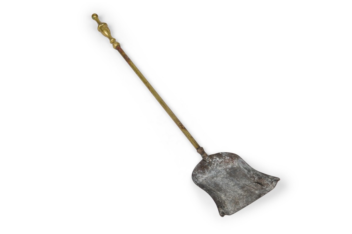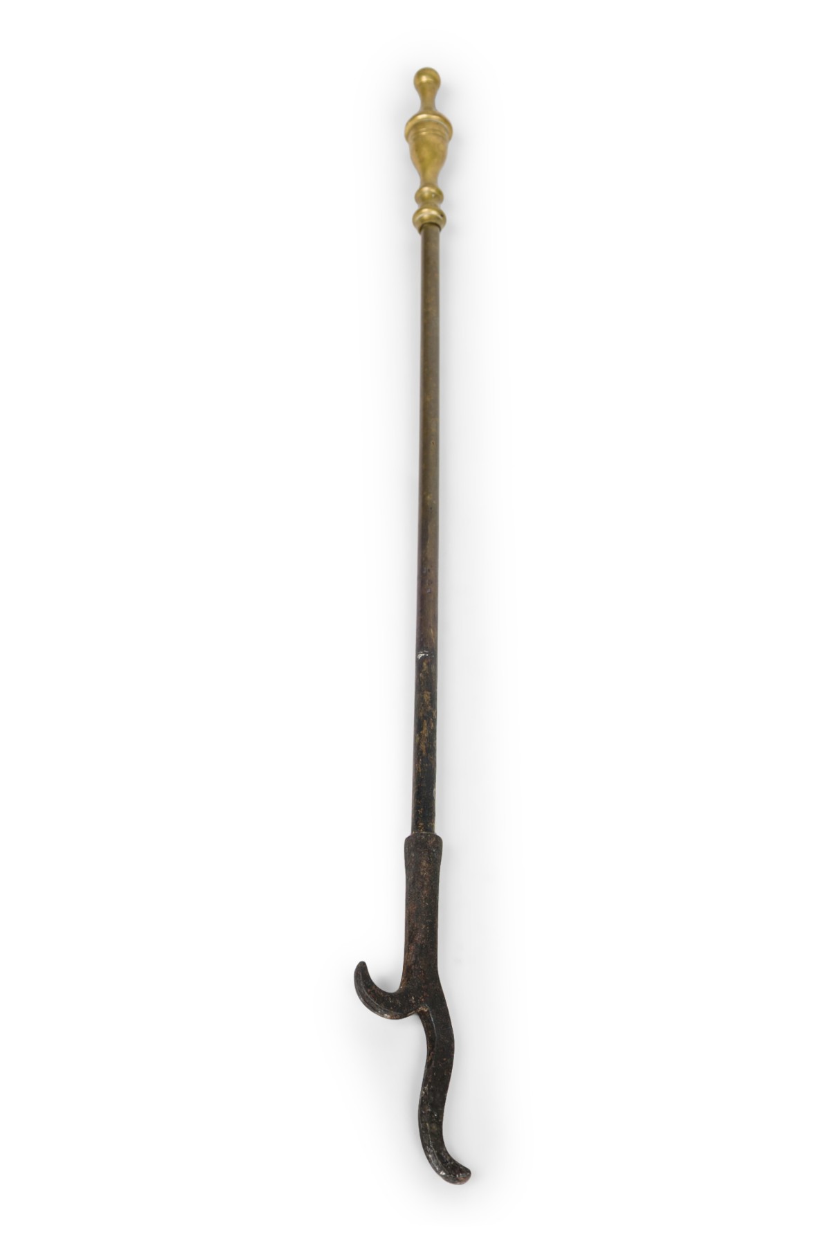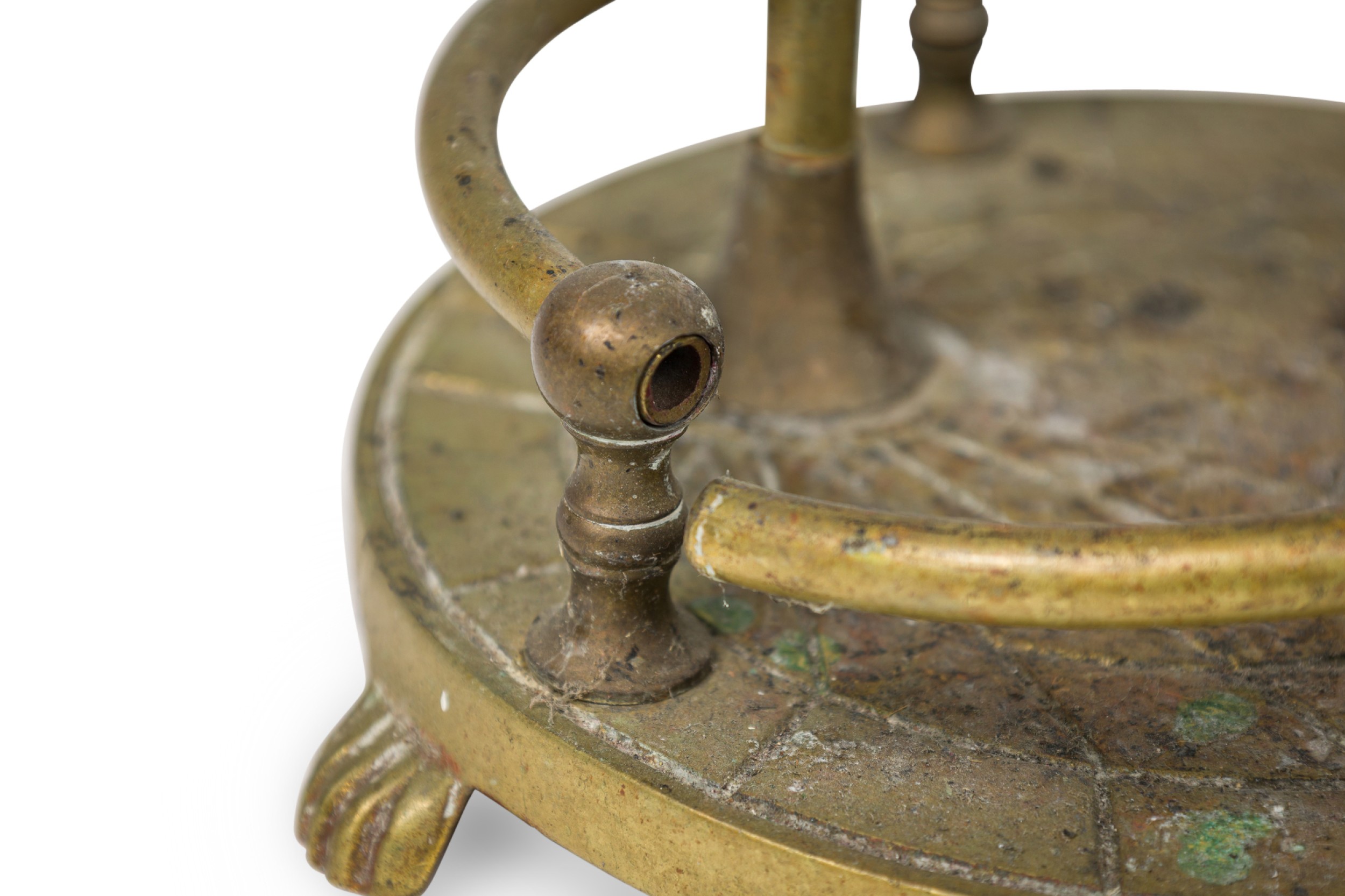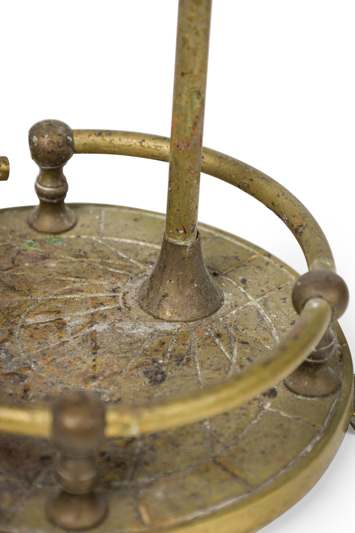 English Victorian style brass stand and 3 fire tools resting on a circular base with shaped finial tops