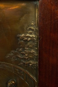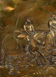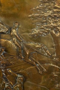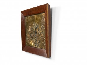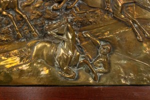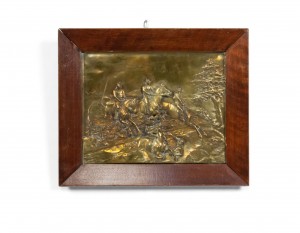 PAIR of English Victorian Country style (19/20th Century) brass horse racing wall plaques with walnut frames (PRICED AS PAIR).