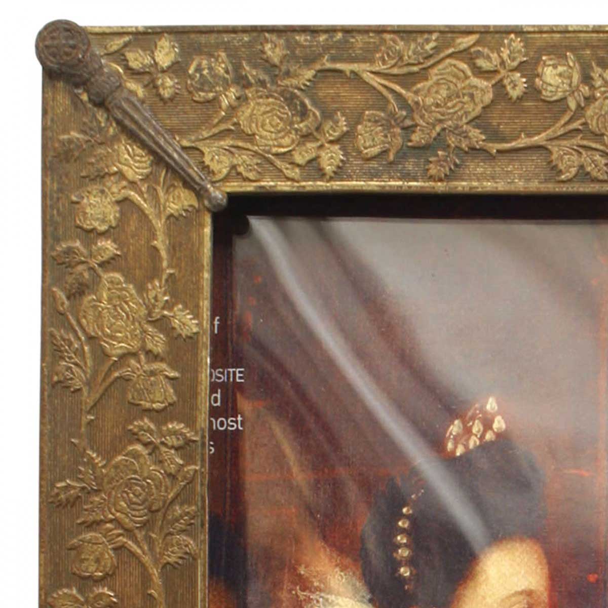 English Victorian brass rectangular easel picture frame with embossed roses and floral design frame.