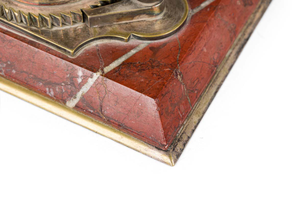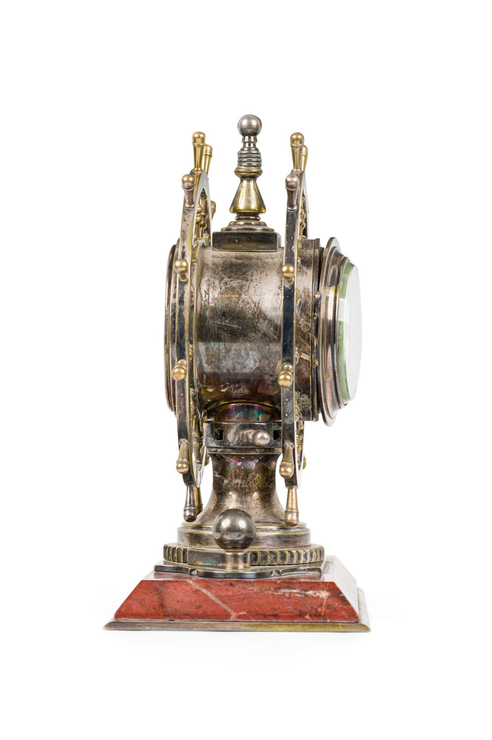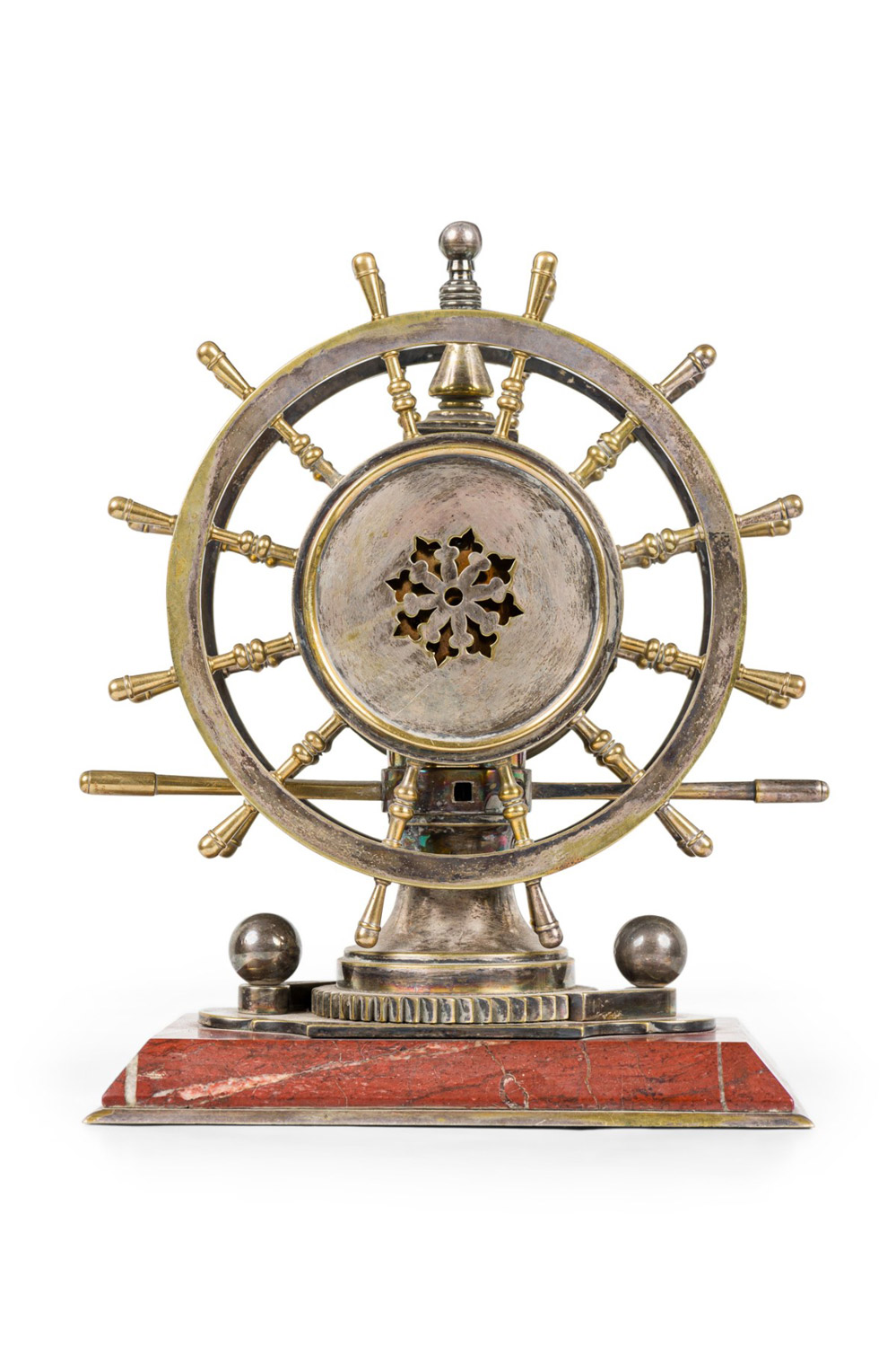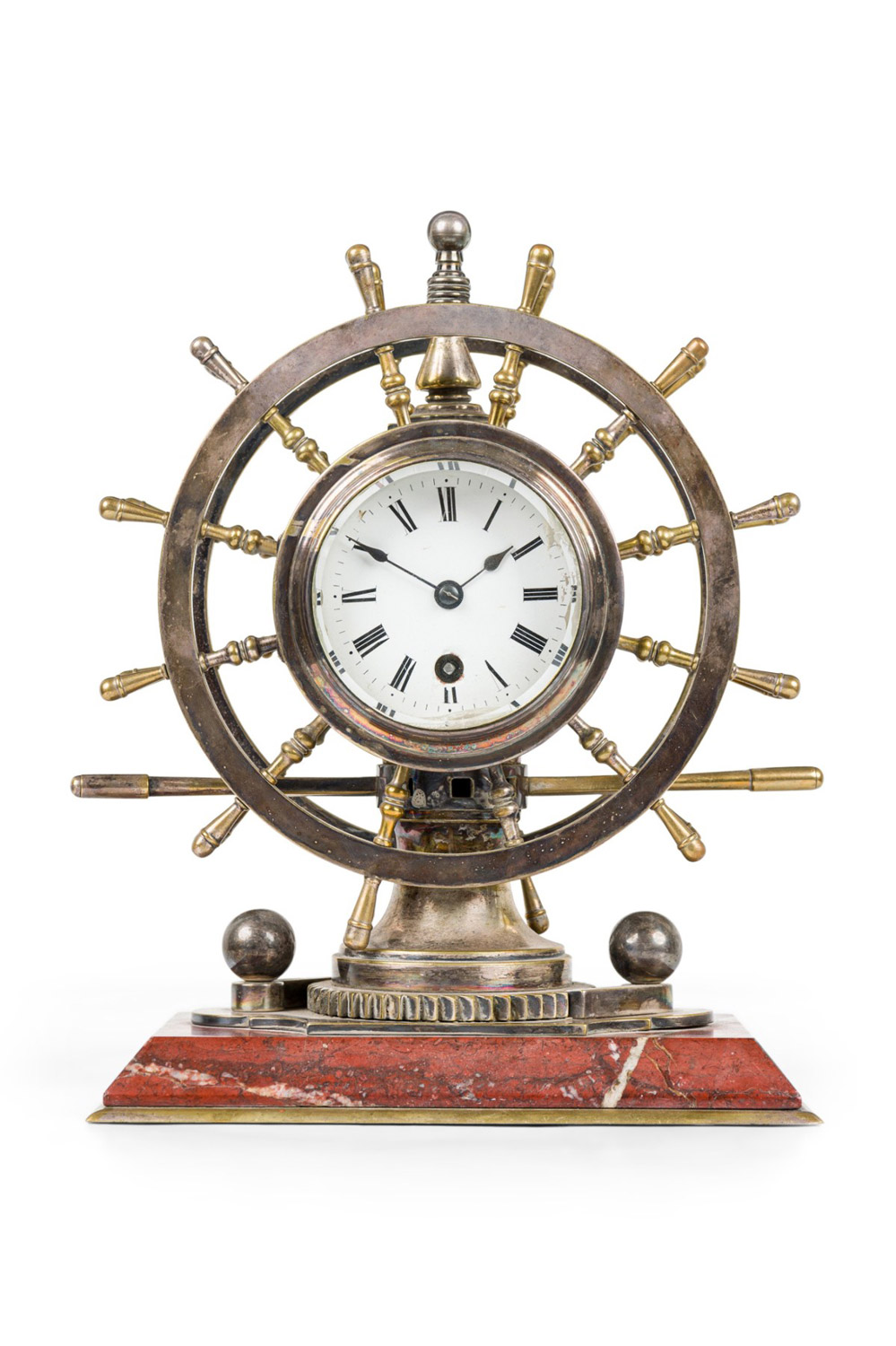 English Victorian bronze silver plated ship-wheel design desk clock on rectangular rouge marble base. (Not working)