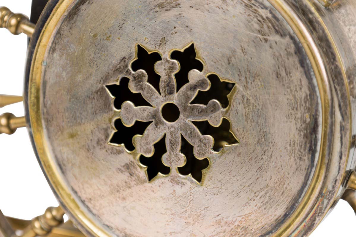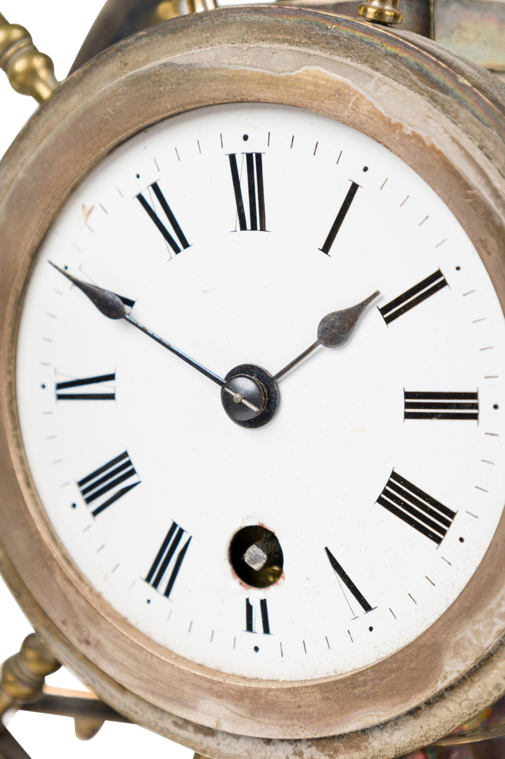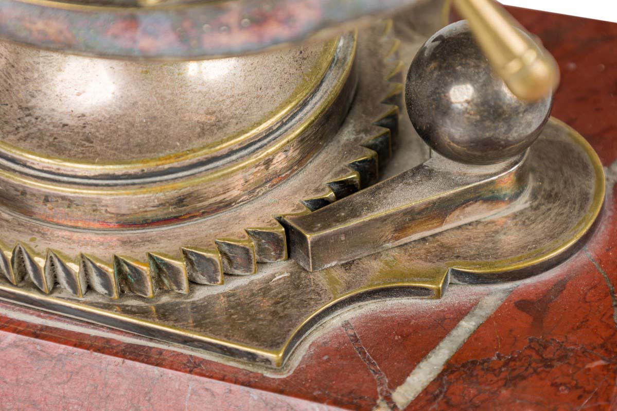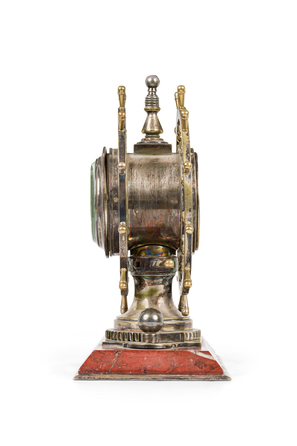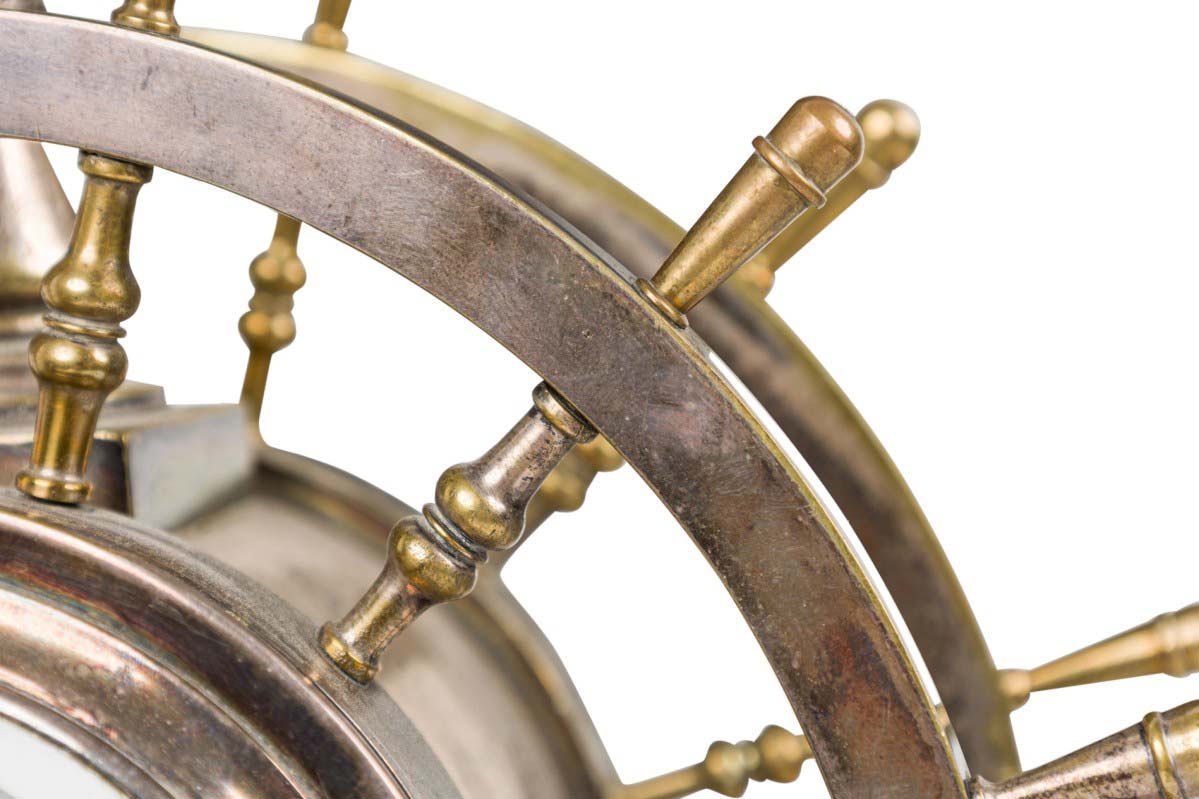 English Victorian bronze silver plated ship-wheel design desk clock on rectangular rouge marble base. (Not working)