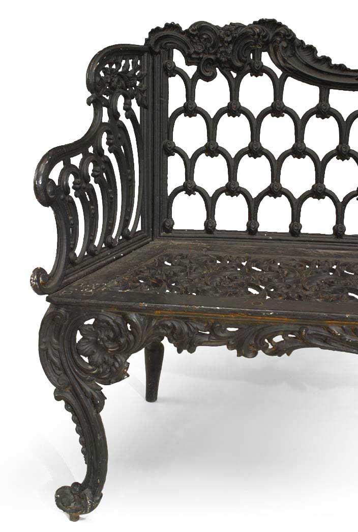 English Victorian black painted cast iron loveseat with scroll design and filigree seat with horseshoe motifs on back (att: CARRON Co, Stirlingshire)