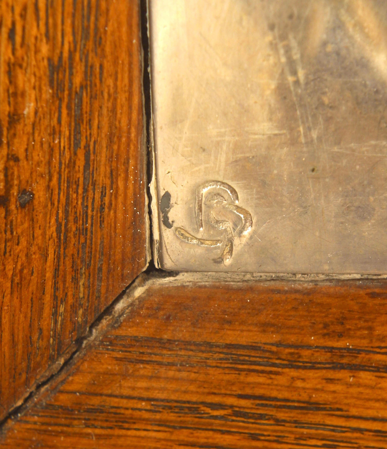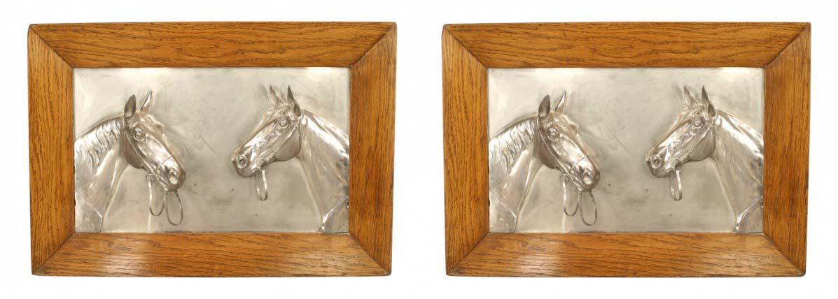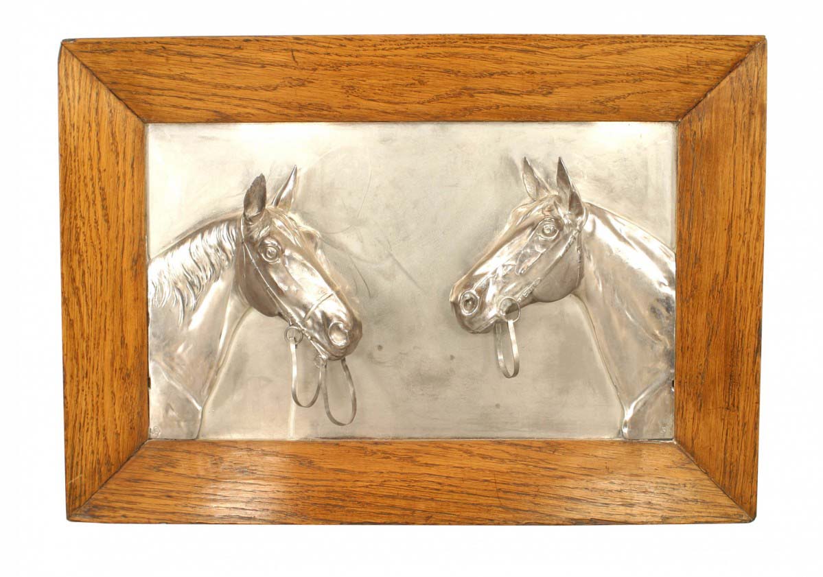 PAIR of English Victorian Country-style (19/20th Century) silver plate wall plaques of horse heads in oak frames. (PRICED AS PAIR)