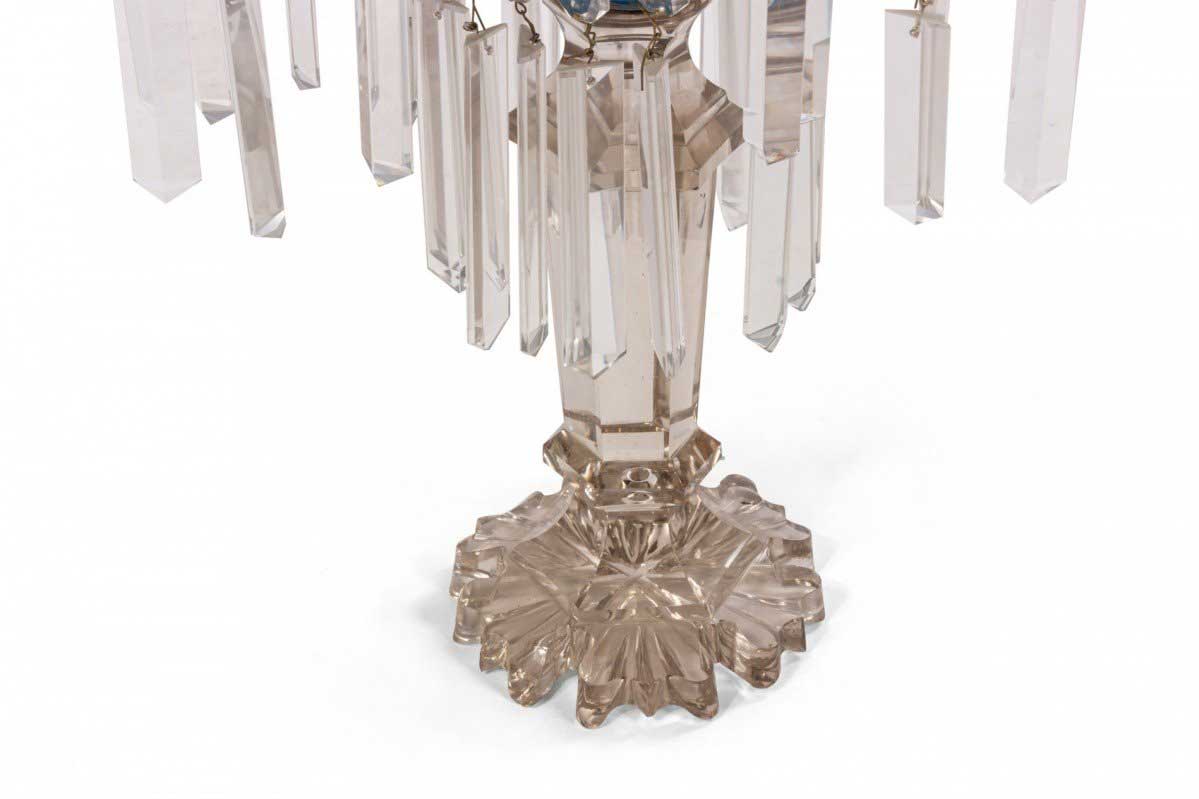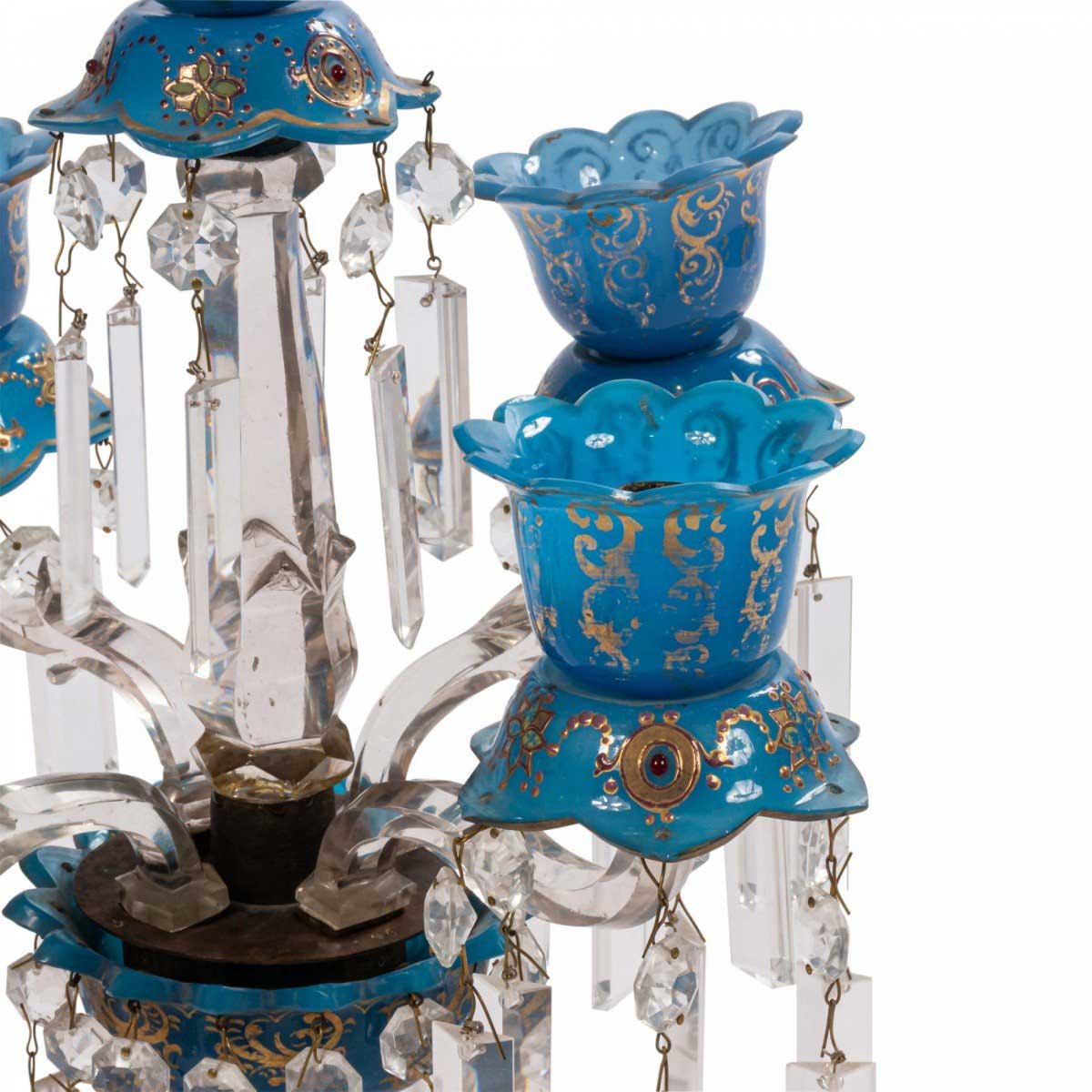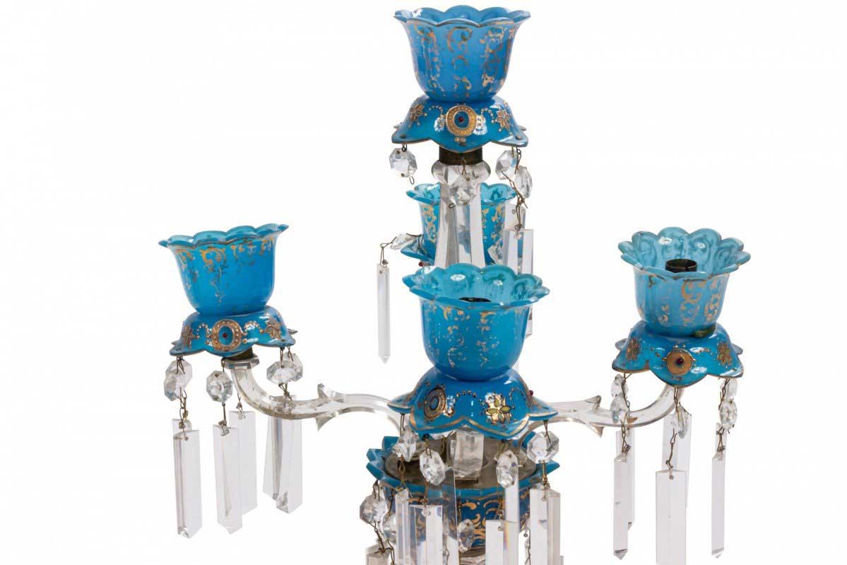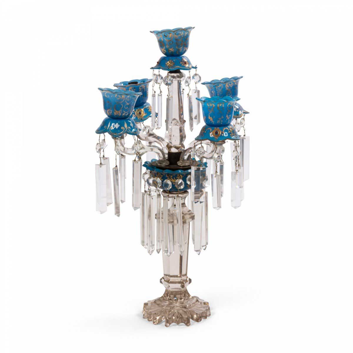PAIR of similar English Victorian crystal and blue opaline Waterford style 5 arm candelabras (PRICED AS PAIR)