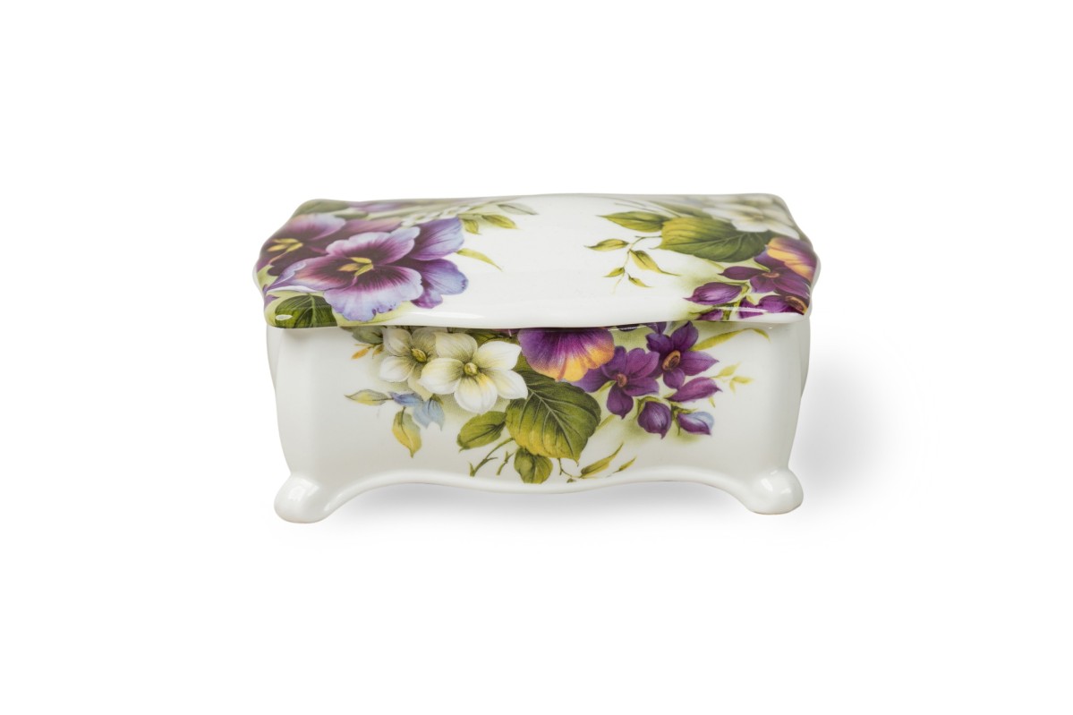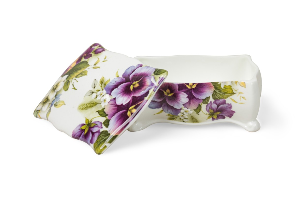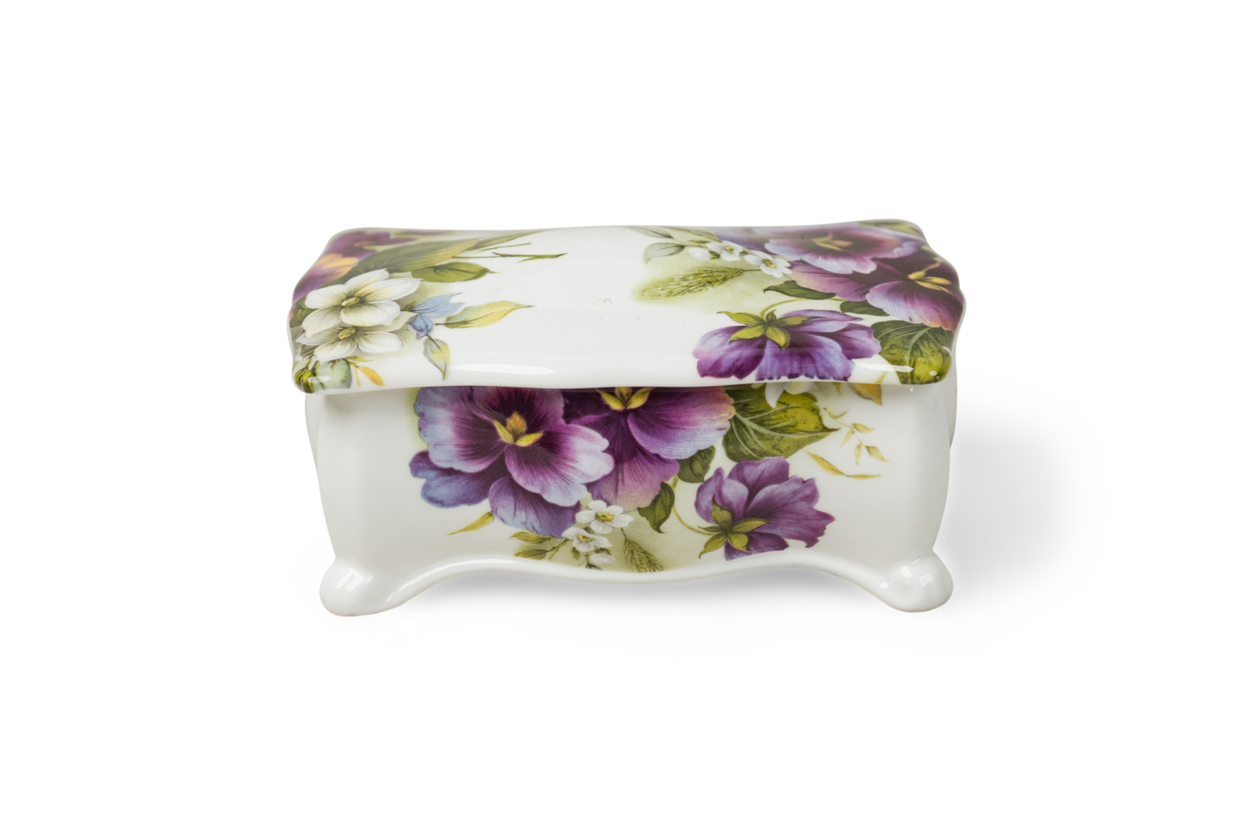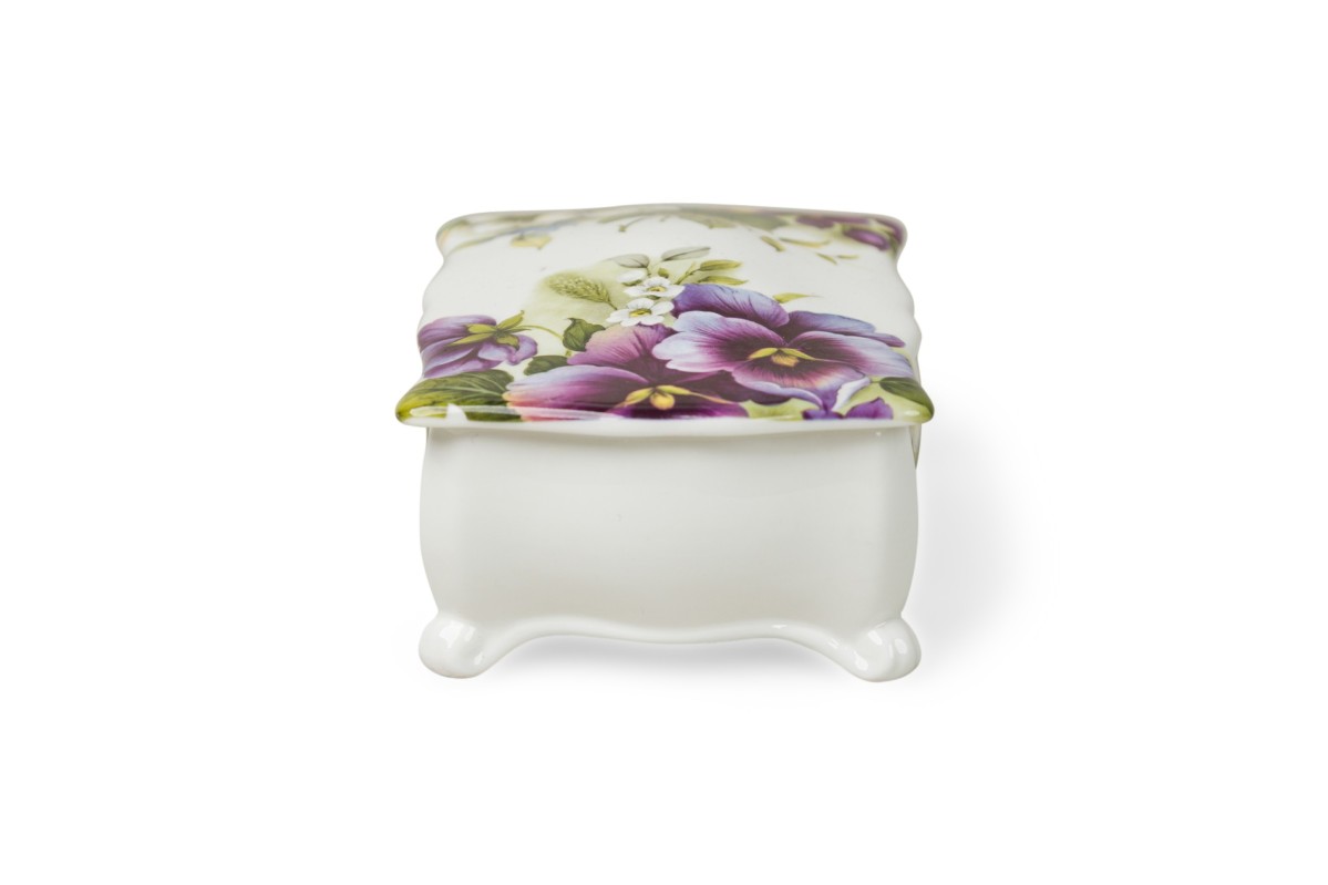 English Victorian fine bone china footed rectangular jewelry box having purple and white floral motifs