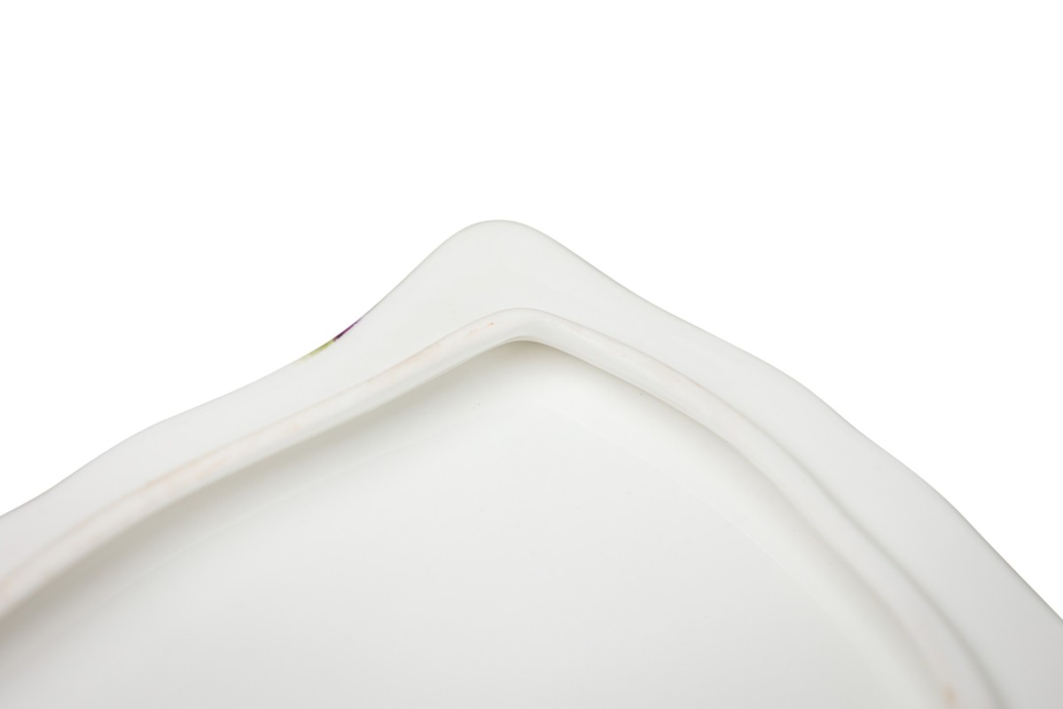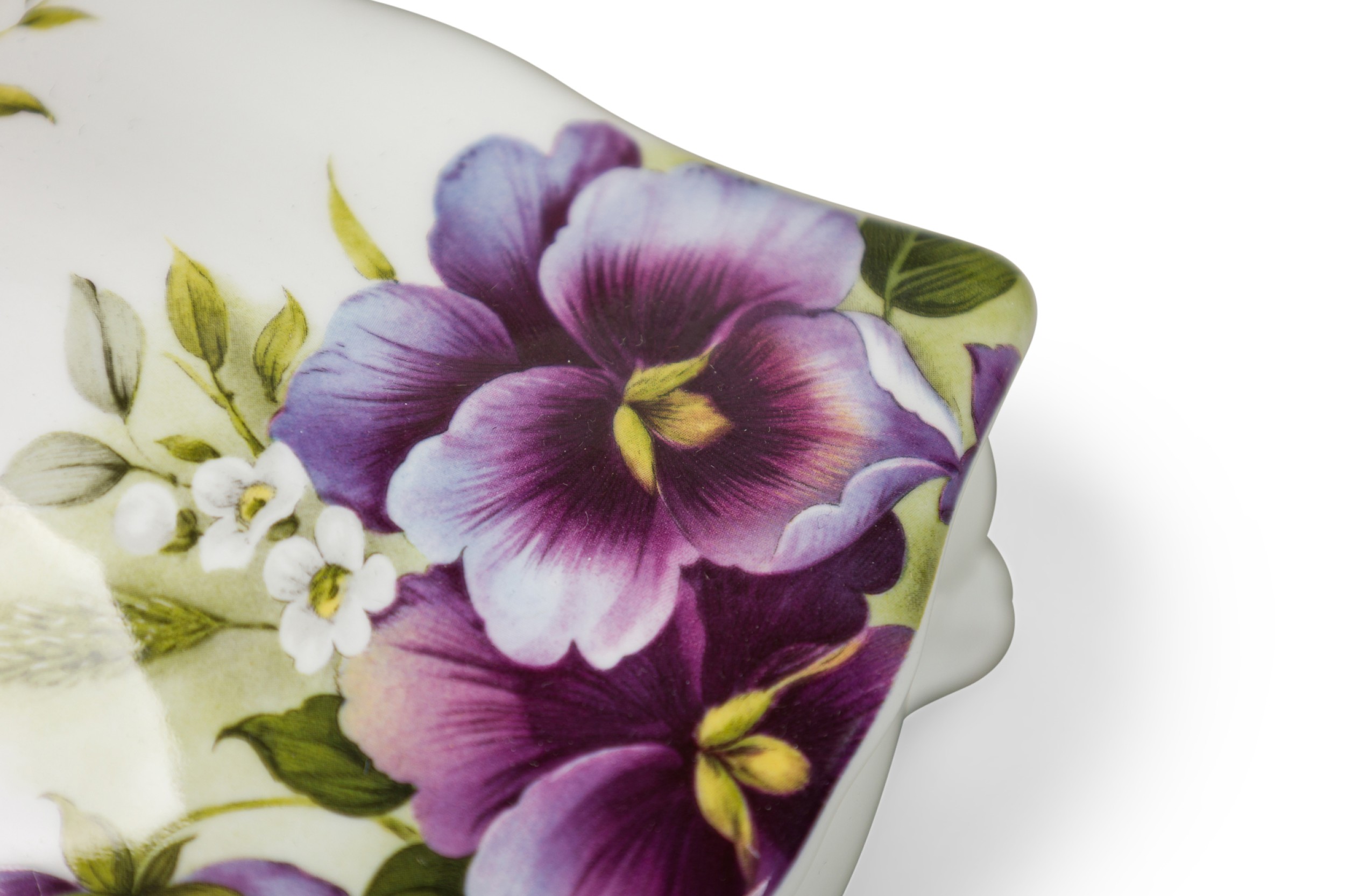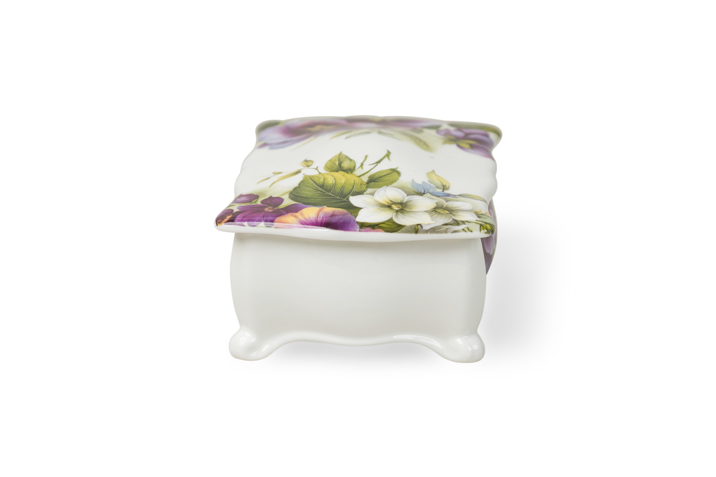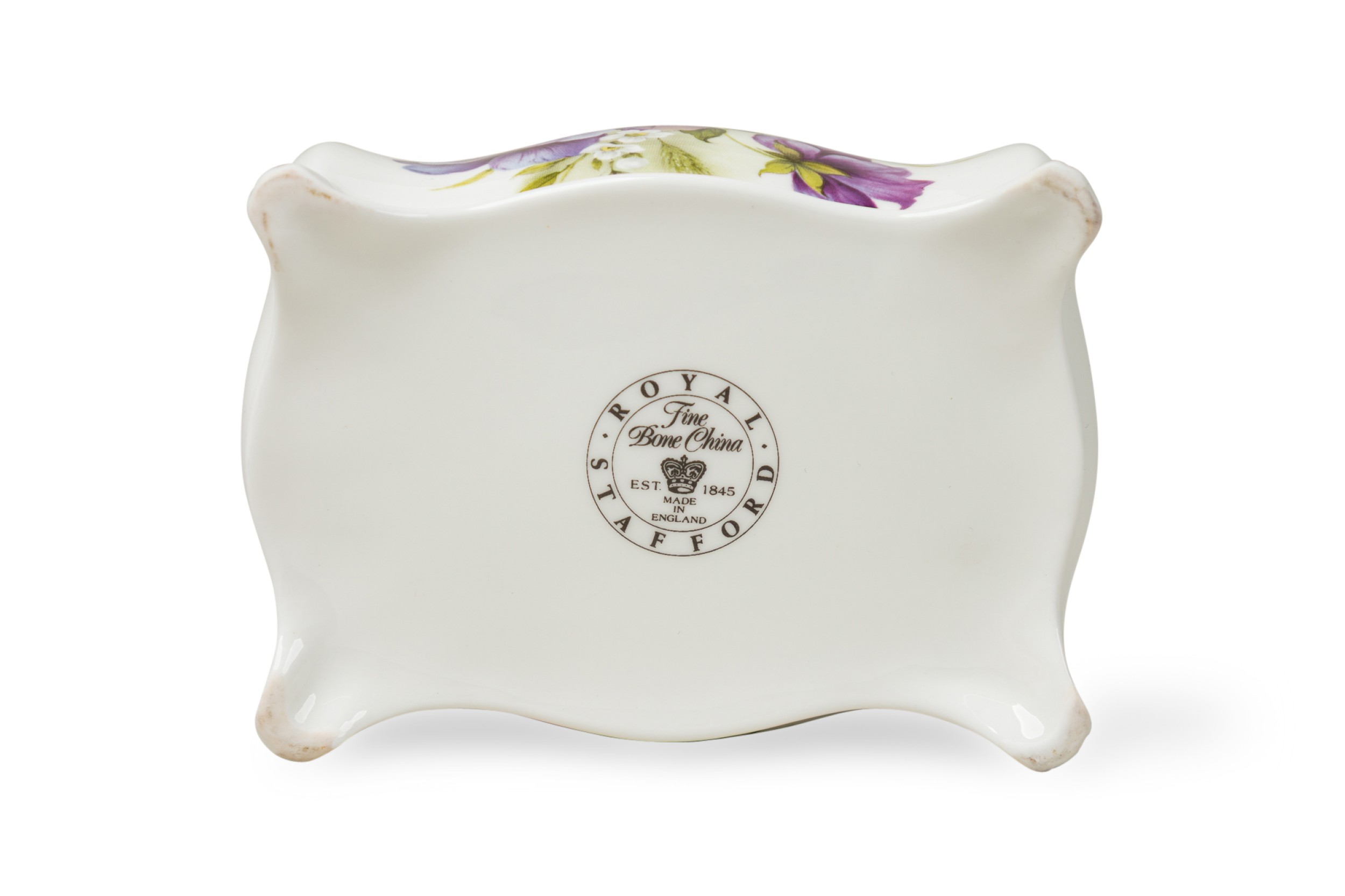 English Victorian fine bone china footed rectangular jewelry box having purple and white floral motifs