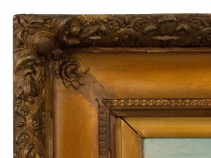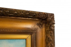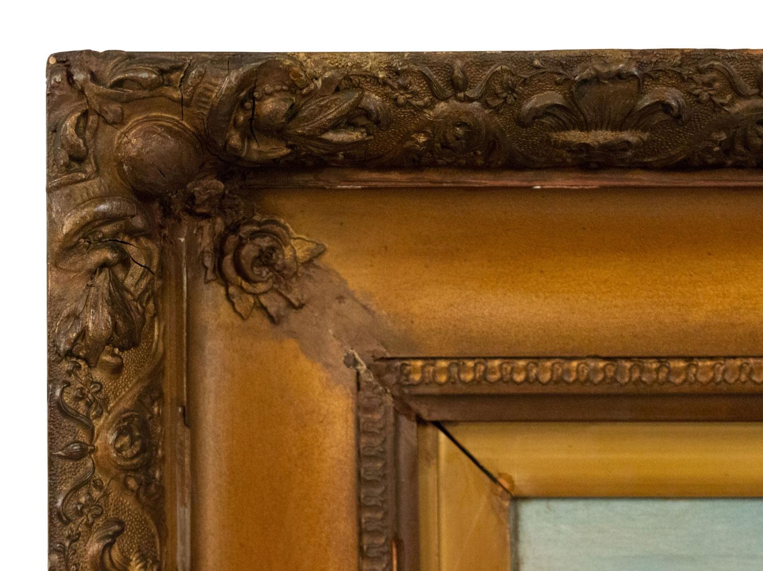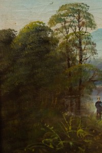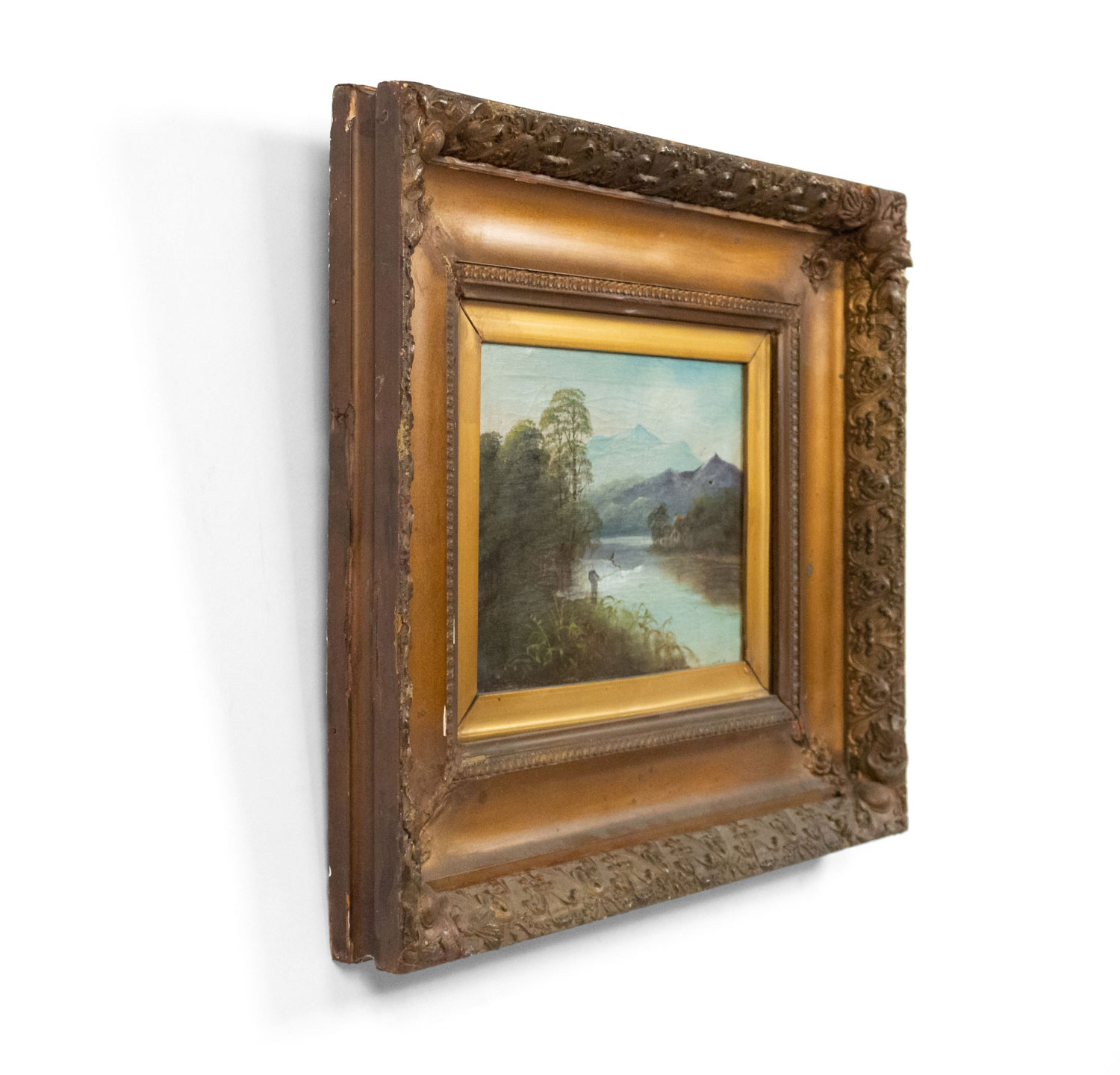English Victorian (19th Cent) oil painting of a fisherman by a lake in gilt frame
