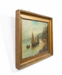 PAIR of English Victorian gilt framed seascape oil paintings of sailboats by shore line.