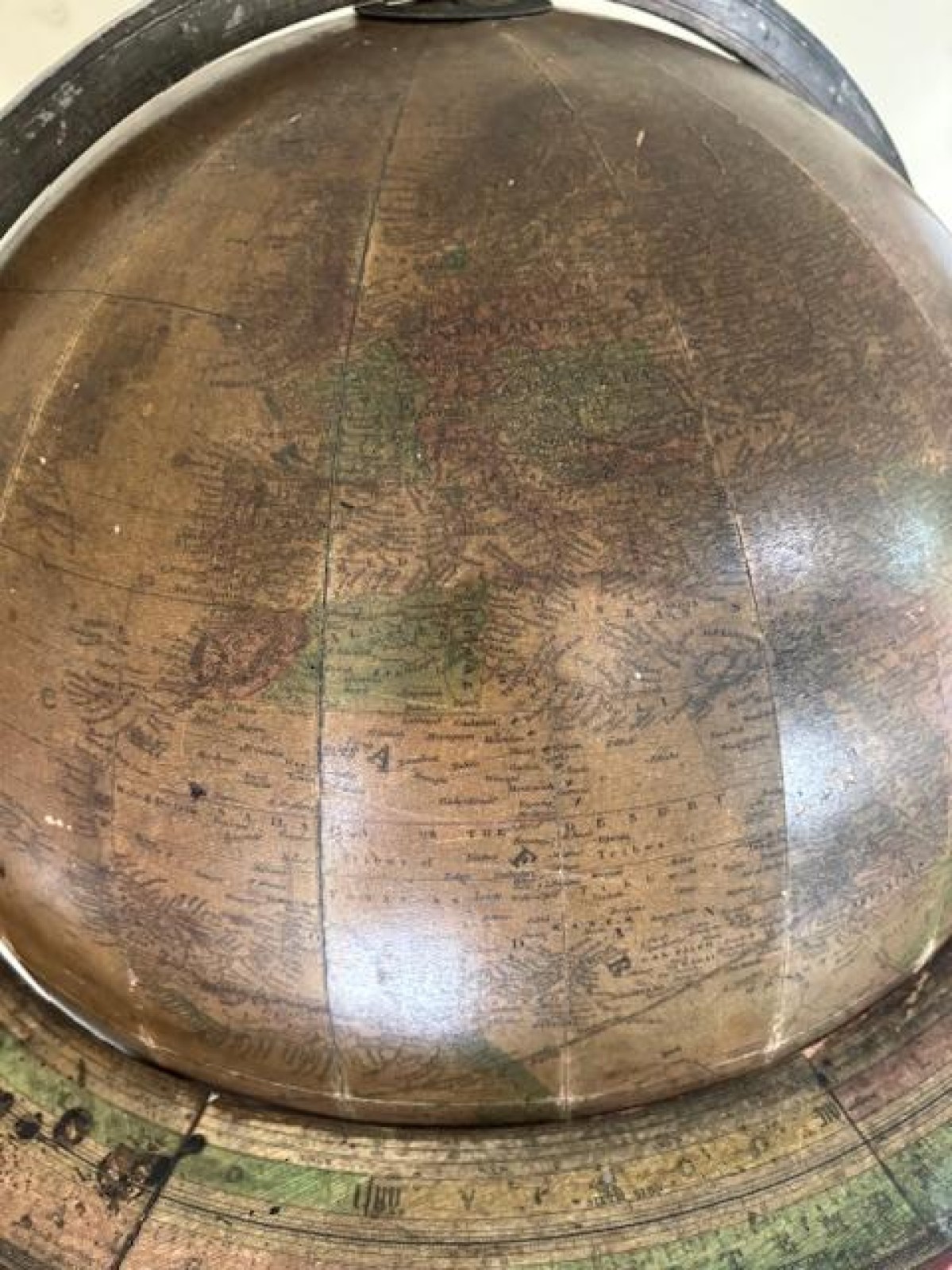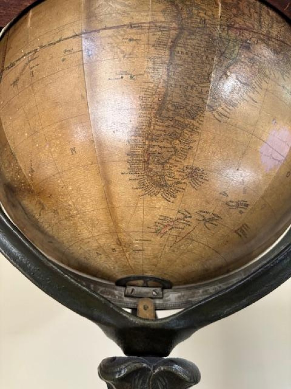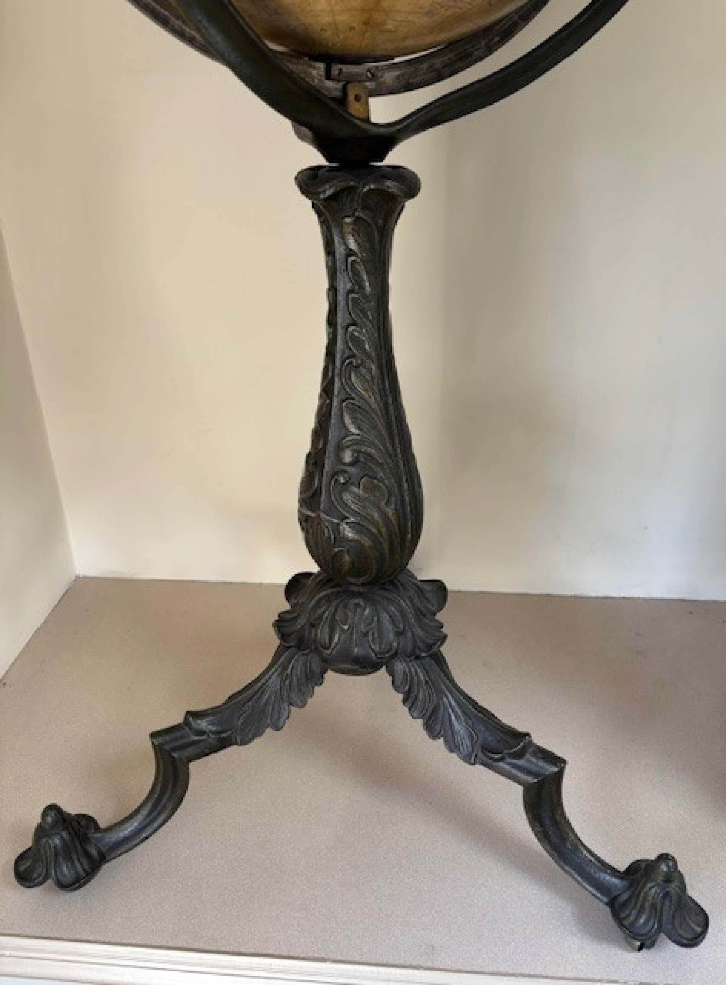 English Victorian globe of world on iron pedestal base with 3 legs. (circa 1832)
