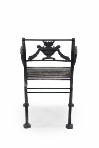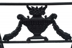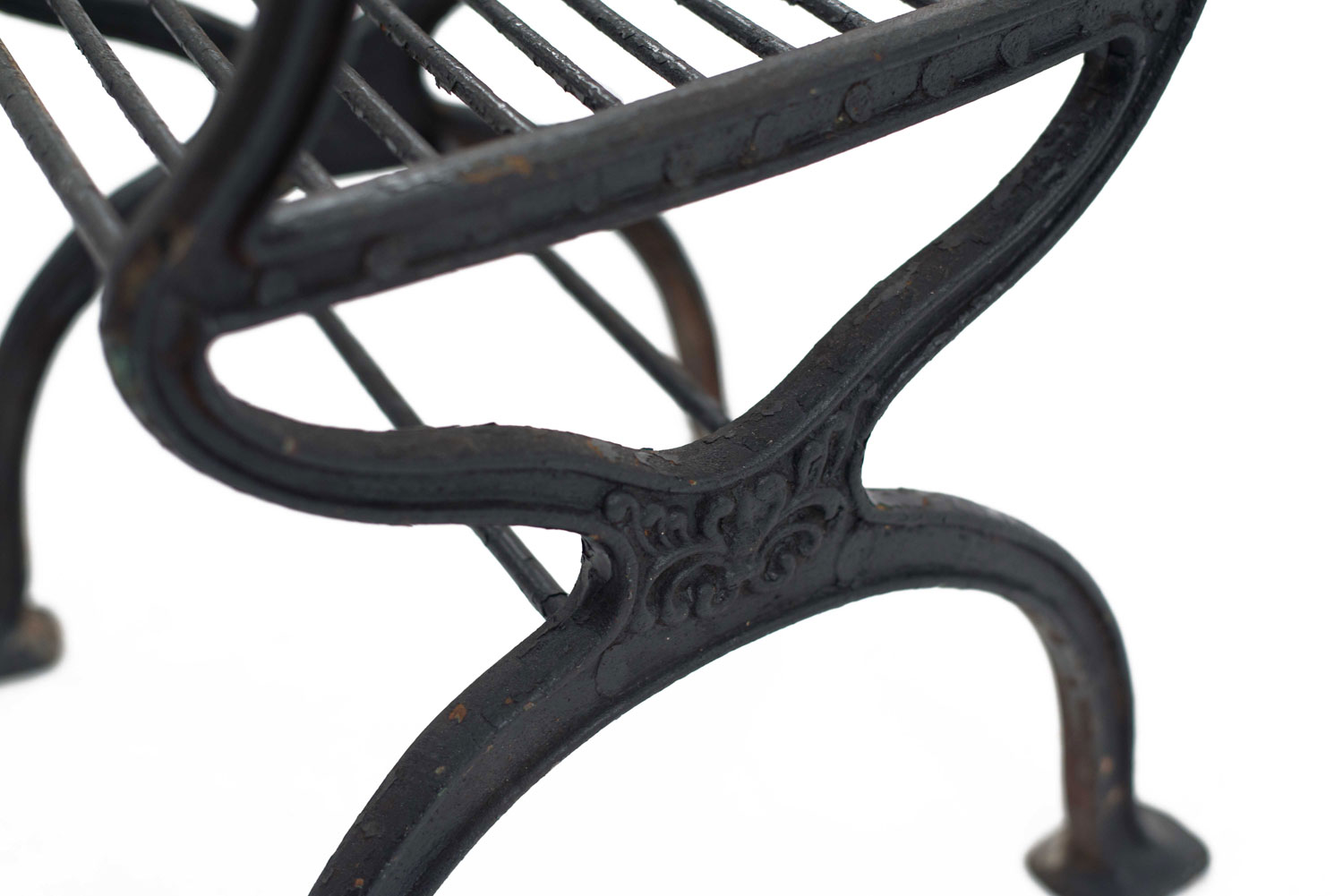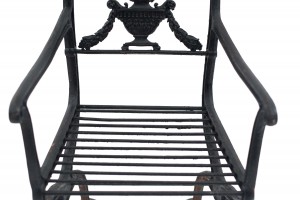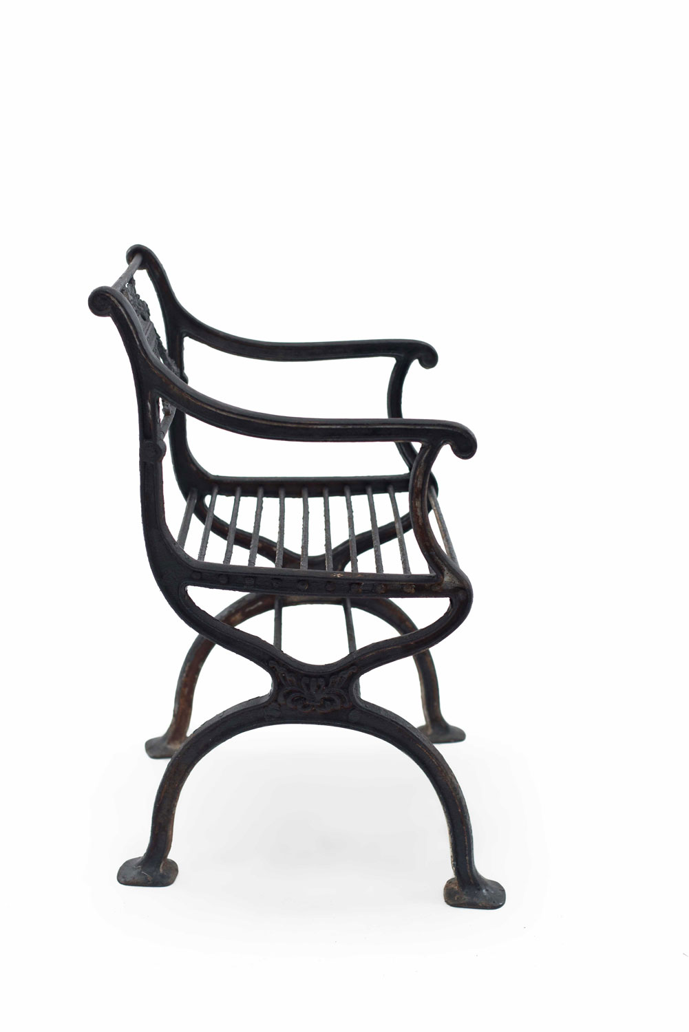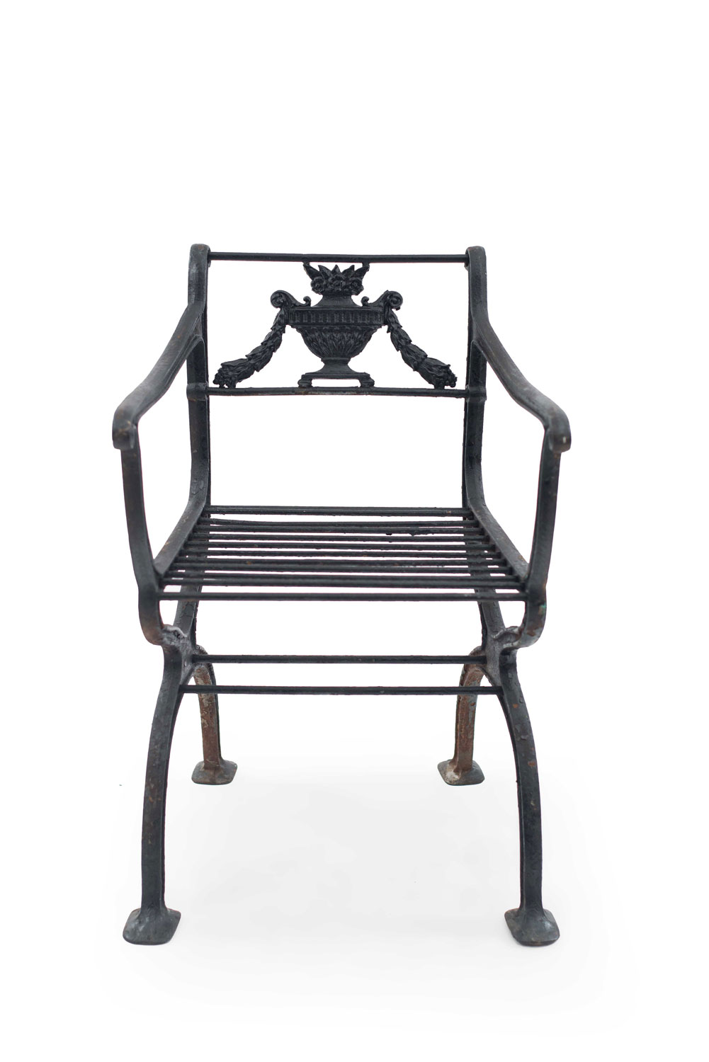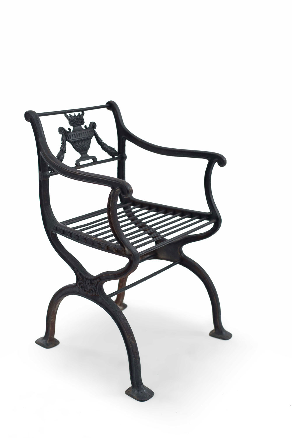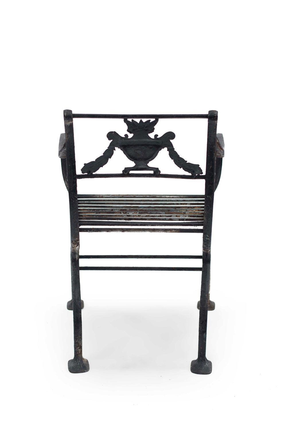 Large English Victorian painted iron garden armchair with a Neo-classic swag and urn design back and slat seat (Related items: CER047A-C)