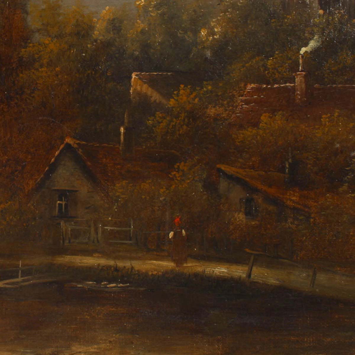 2 of English Victorian gilt framed landscape oil paintings with house on lake and boat. (PRICED EACH)
