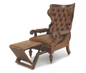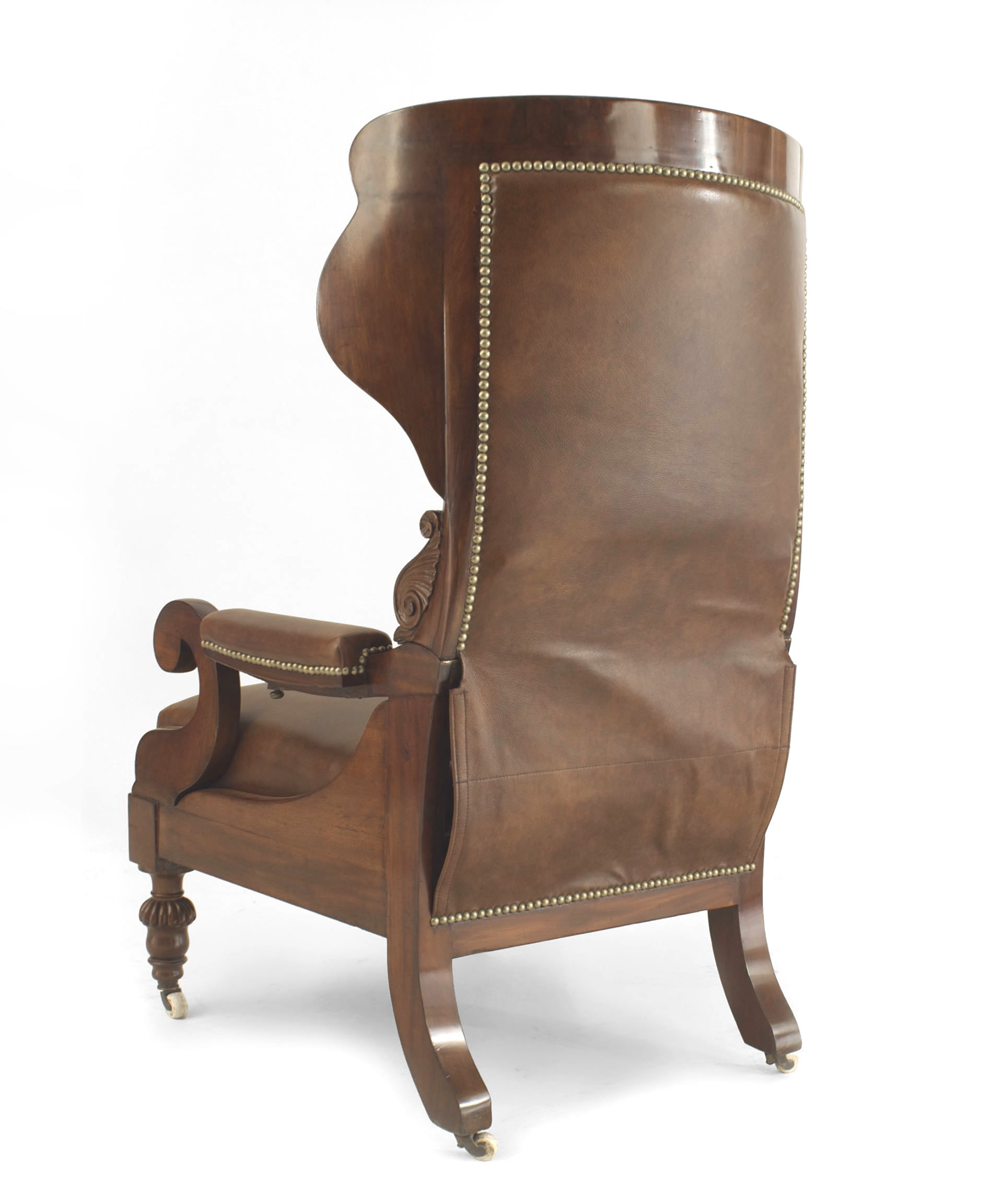 English Victorian (2nd Quarter 19th Century) mahogany reclining adjustable arm chair with foot rest and upholstered in brown leather having a tufted round back with nail head trim.