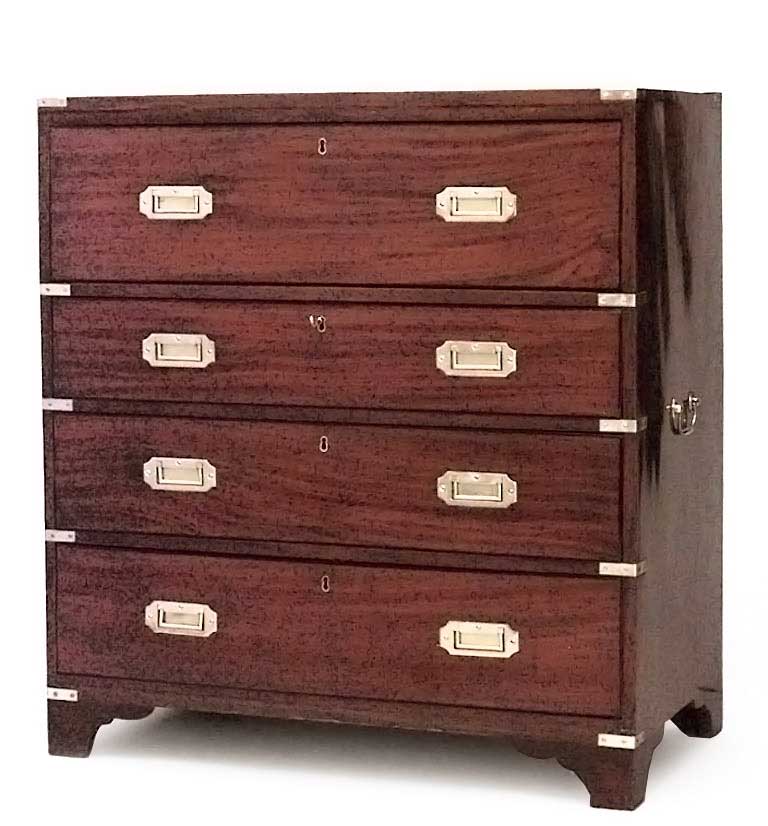 English Victorian (2nd Half of 19th Century) brass bound mahogany campaign style secretaire chest of drawers with fitted fall front drawer above 3 drawers
