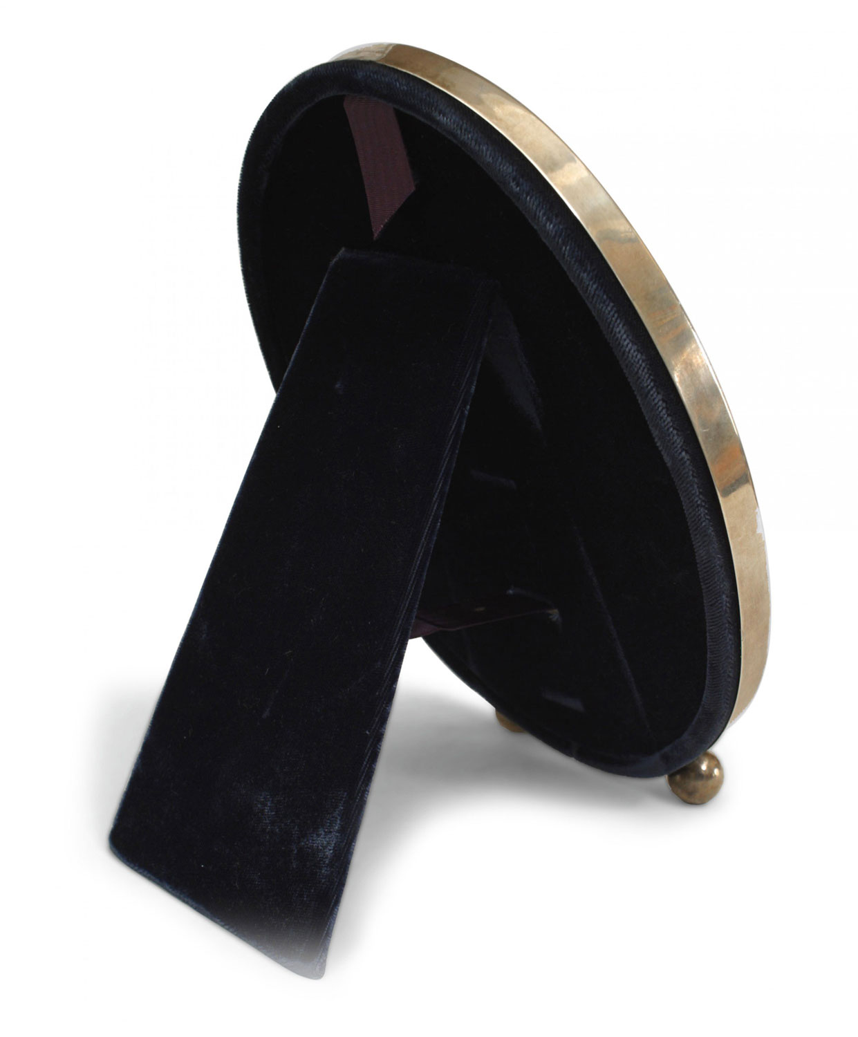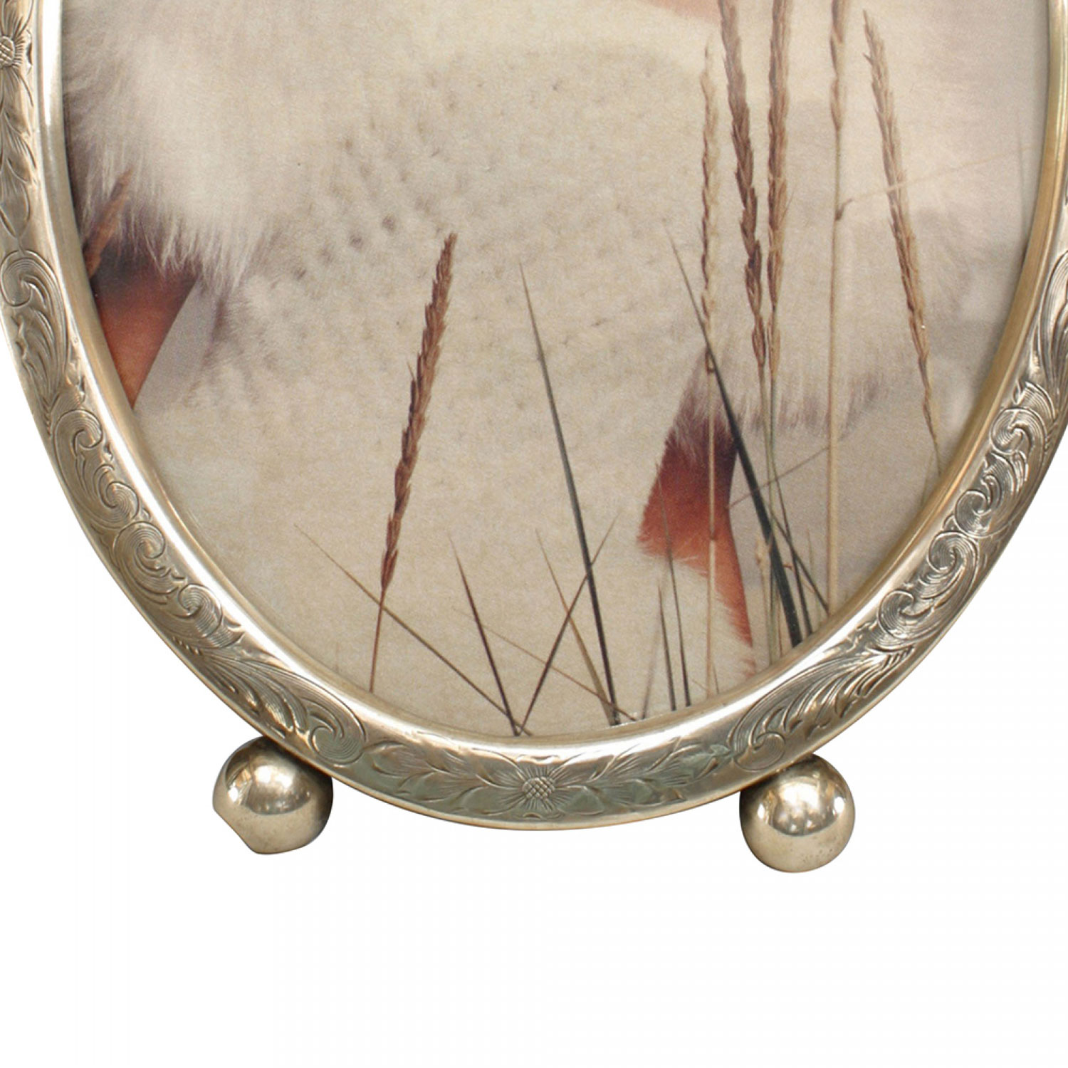 English Victorian style oval sterling silver easel picture frame with engraved floral and scroll design frame standing on 2 ball feet with dark blue velvet backing.