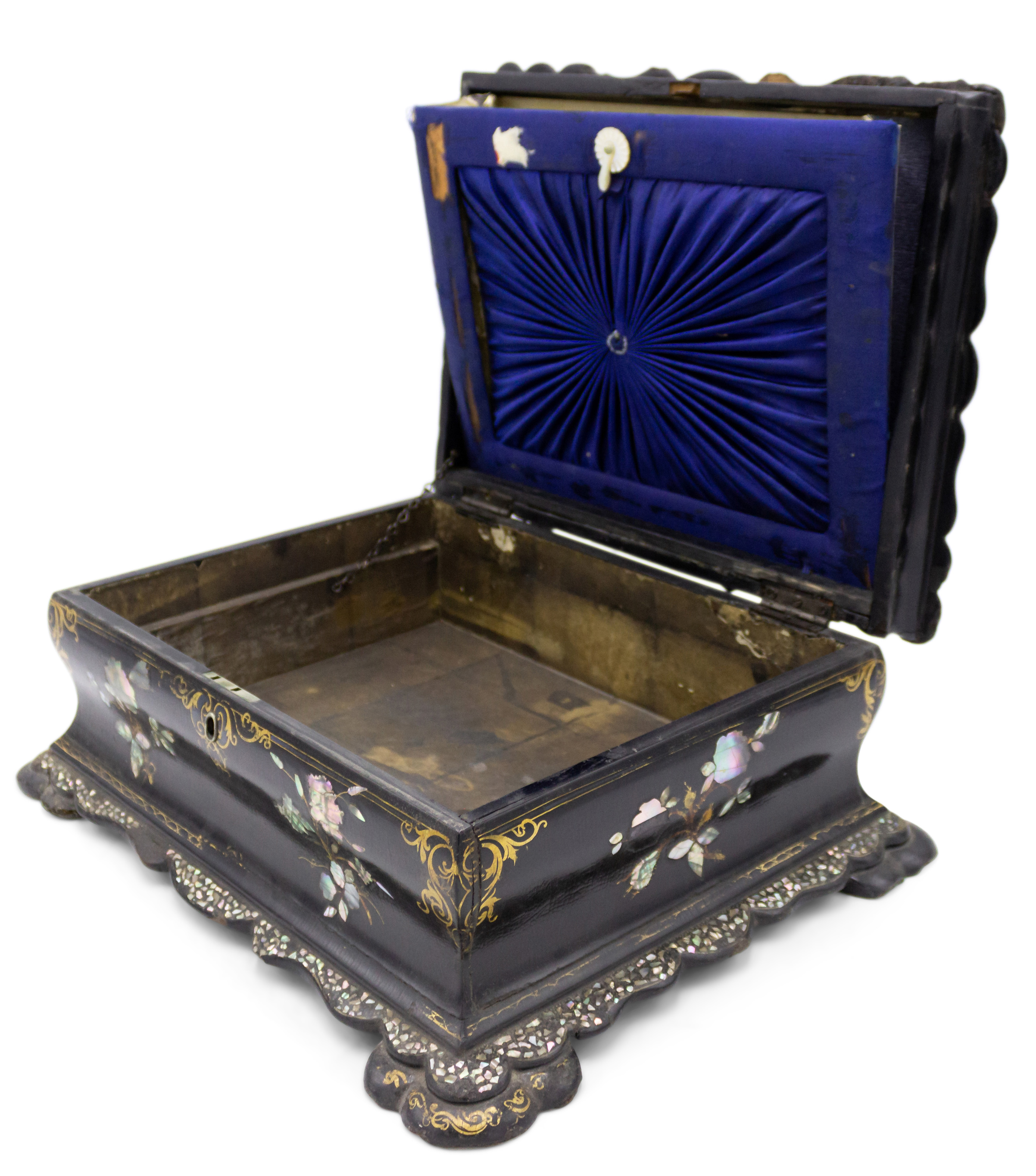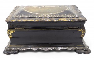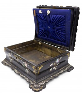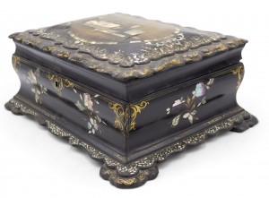 English Victorian papier mache pearl inlaid rectangular shaped box with oval shaped center.