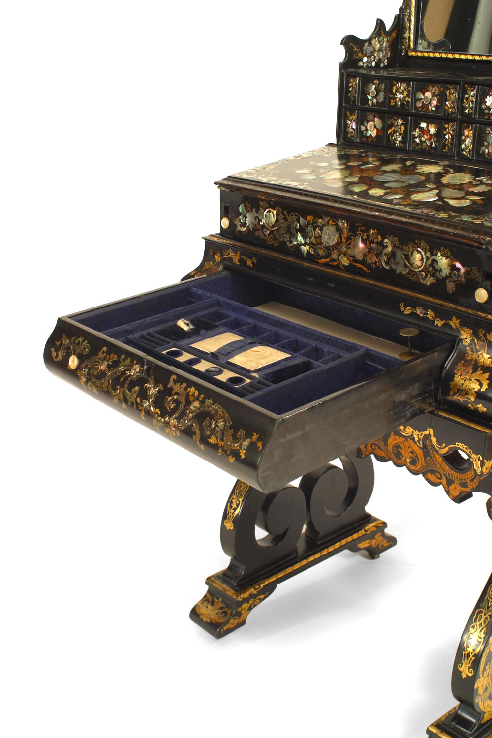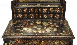 English Victorian Papier Mache Pearl Inlaid Black Lacquered Vanity