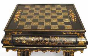 English Victorian papier mache pearl inlaid black lacquered writing/sewing table with game table base and stretcher. (2 sections/removable upper section)