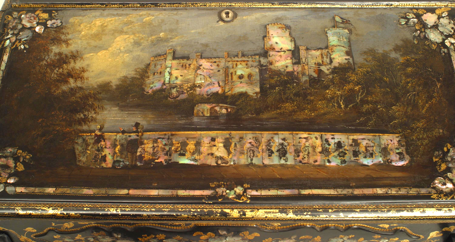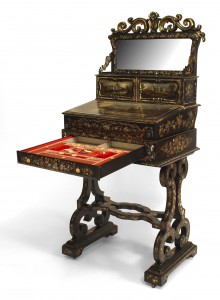 English Victorian Papier Mache Pearl Inlaid Black Lacquered Vanity